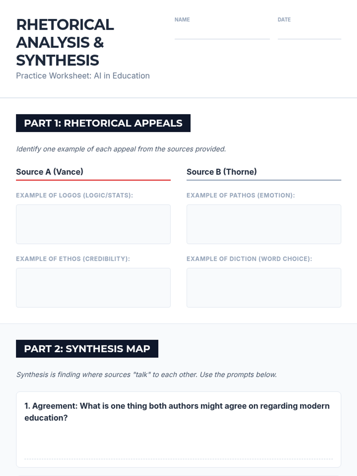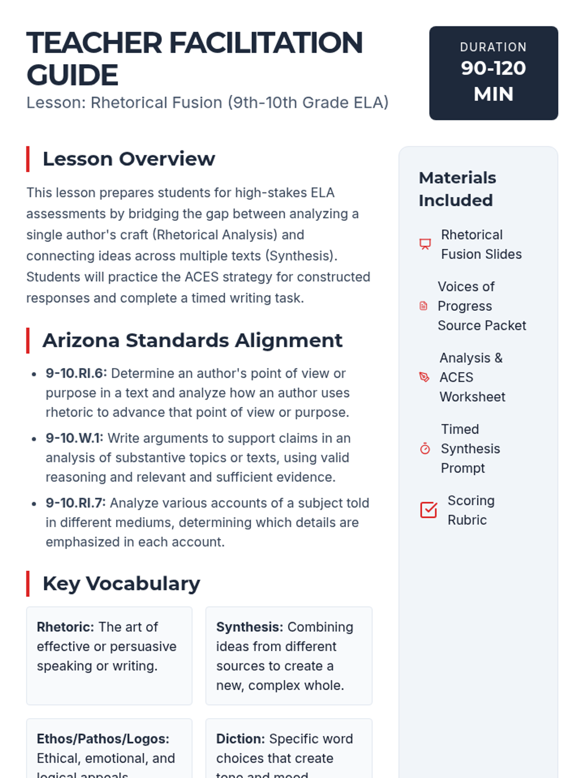 A comprehensive prep lesson for 9th-10th grade students focusing on analyzing rhetorical strategies and synthesizing information from multiple sources. Includes strategies for constructed responses and timed writing practice aligned with Arizona ELA standards.