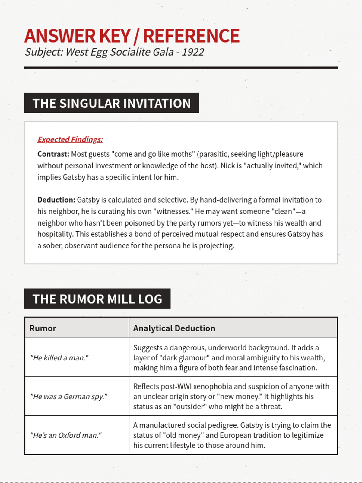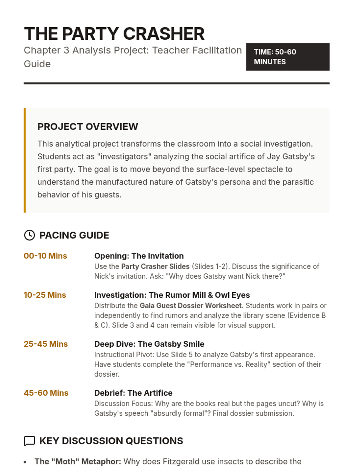 An intensive one-day analytical investigation into Chapter 3 of The Great Gatsby, focusing on the artifice of Gatsby's parties, the nature of his guests, and the first encounter with the man himself.