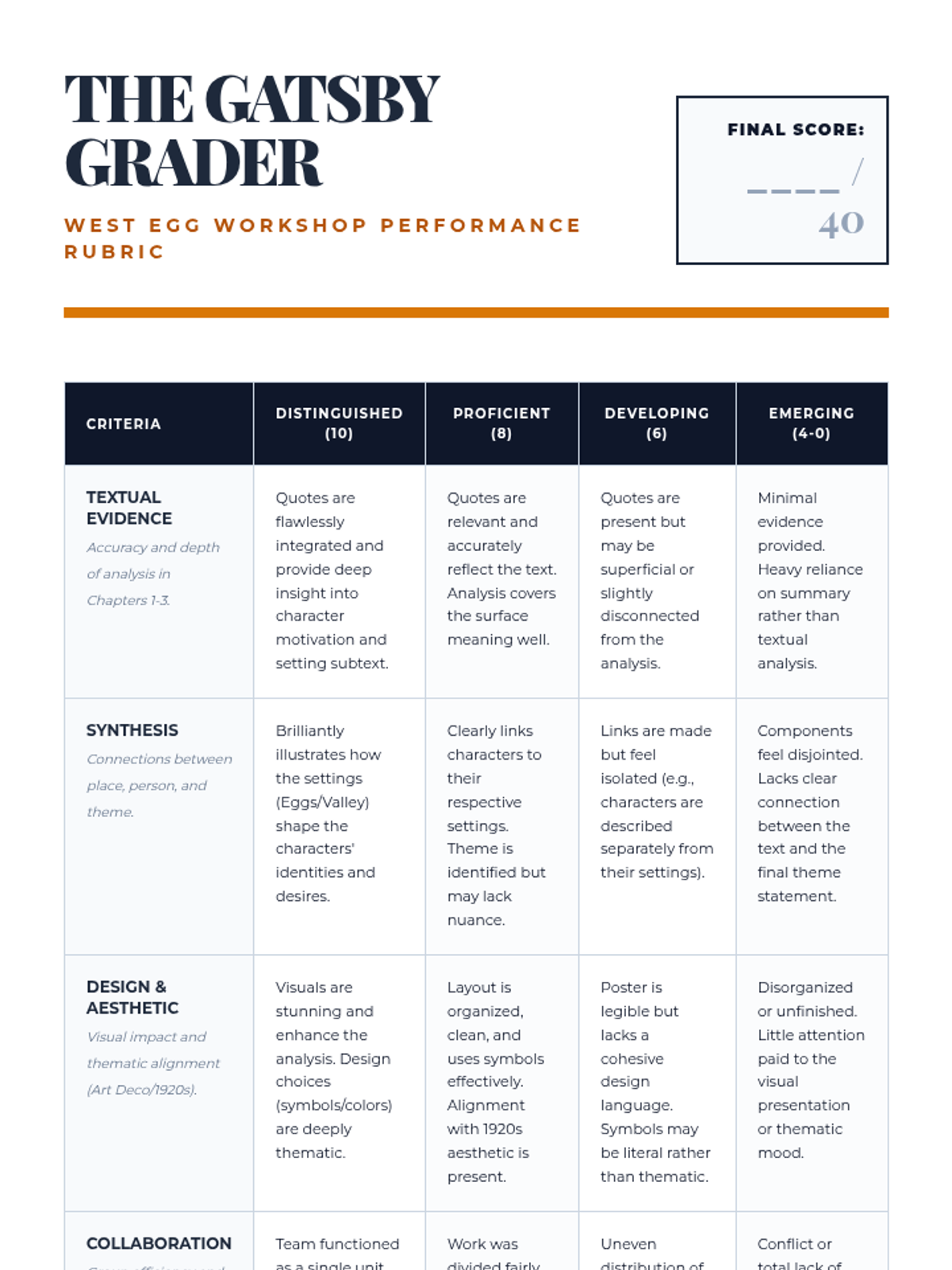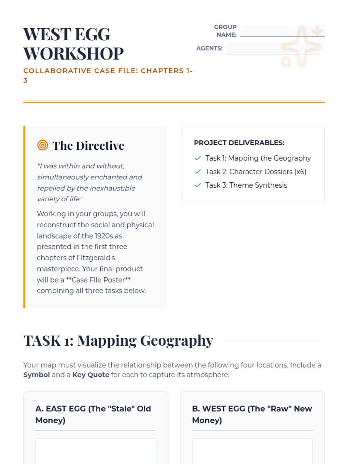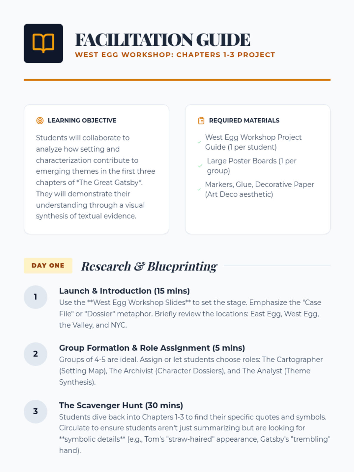 A 2-day collaborative project focusing on the first three chapters of The Great Gatsby, where students analyze characterization, setting, and emerging themes through creative mapping and dossier creation.