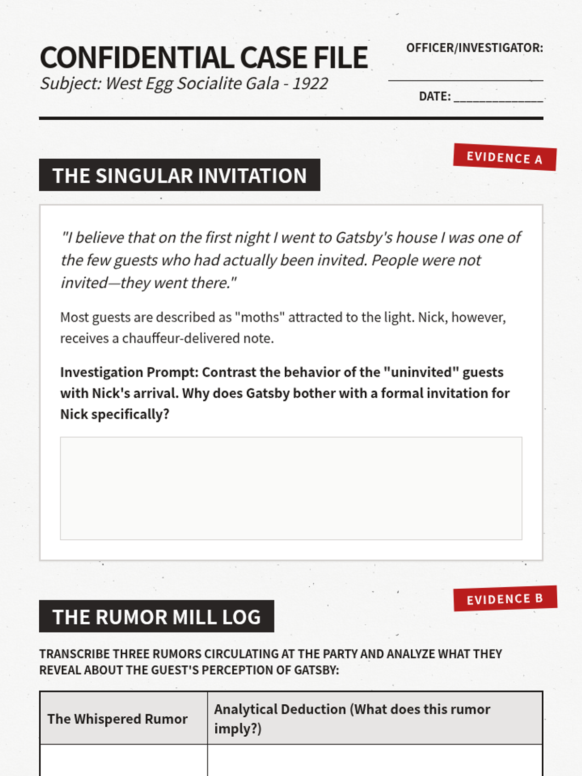 A characterization project focused on F. Scott Fitzgerald's The Great Gatsby, Chapter 3. Students analyze Gatsby, Owl Eyes, Nick, and Jordan through the lens of direct and indirect characterization to create investigative dossiers.