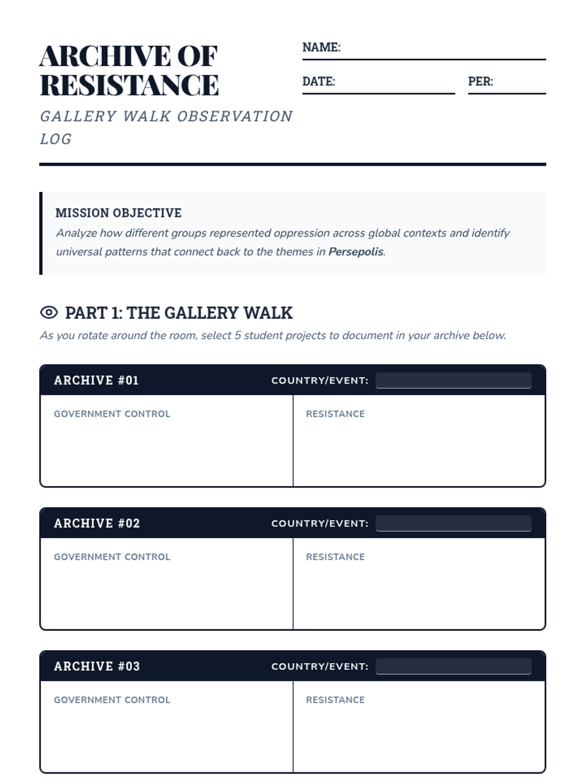 Students explore global contexts of oppression and resistance through a gallery walk of peer-created comic strips, drawing parallels to the themes in Marjane Satrapi's Persepolis.
