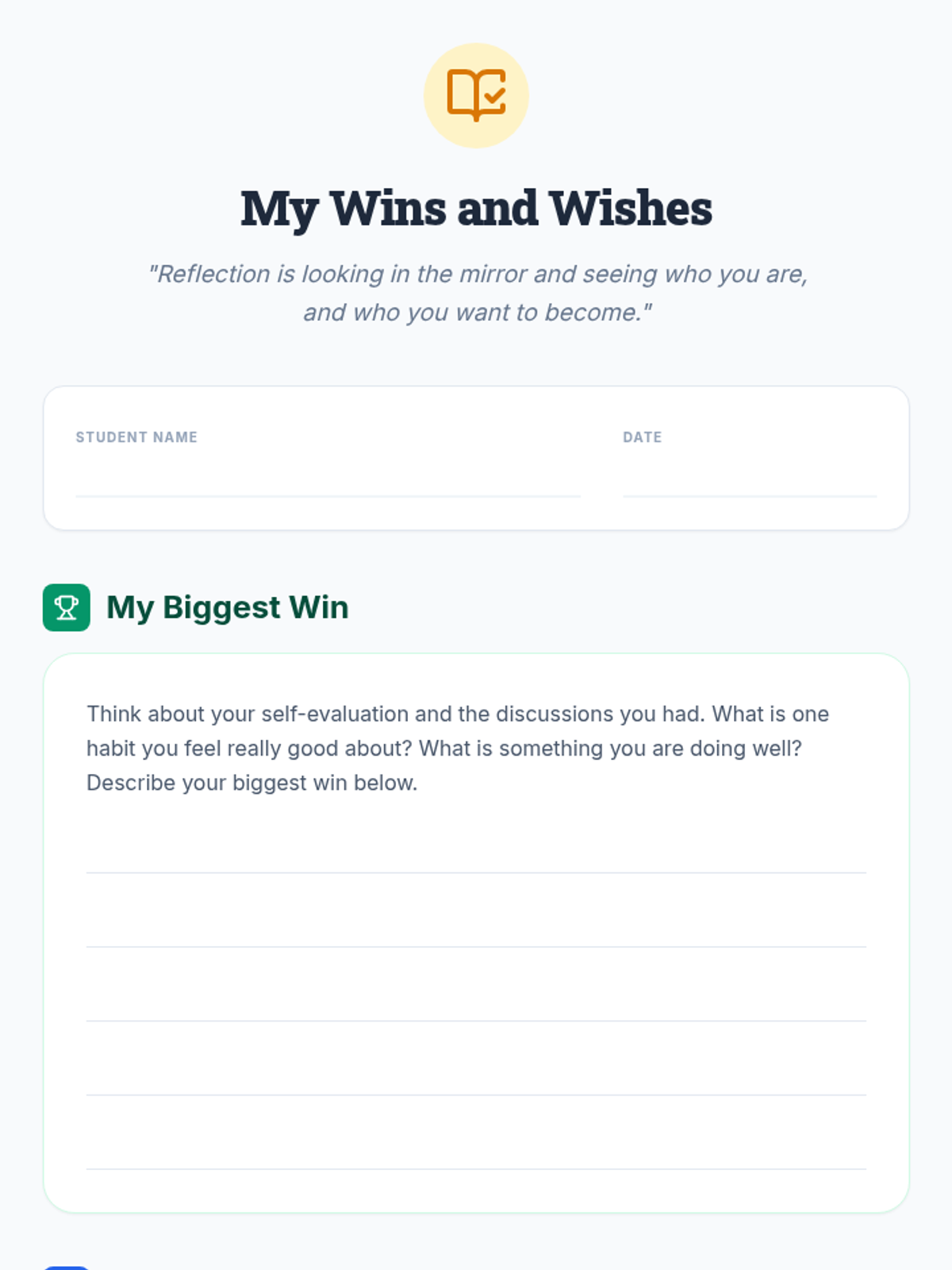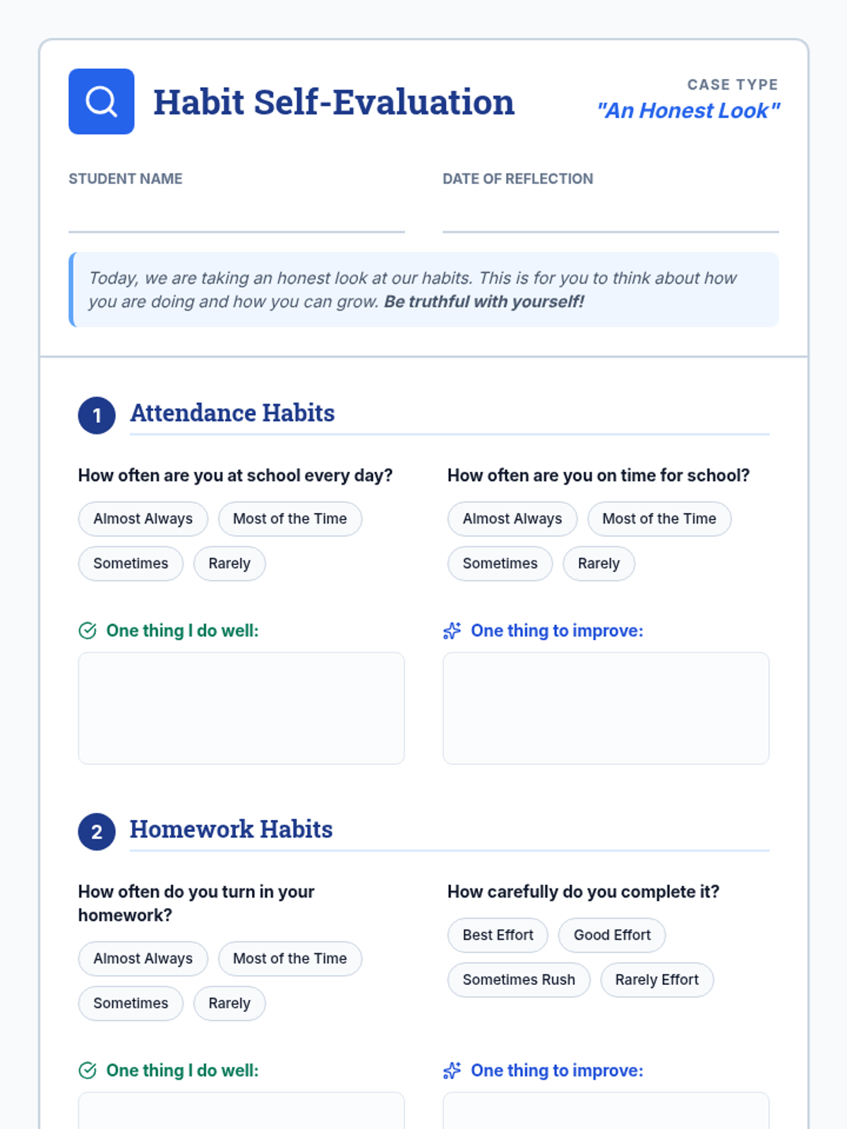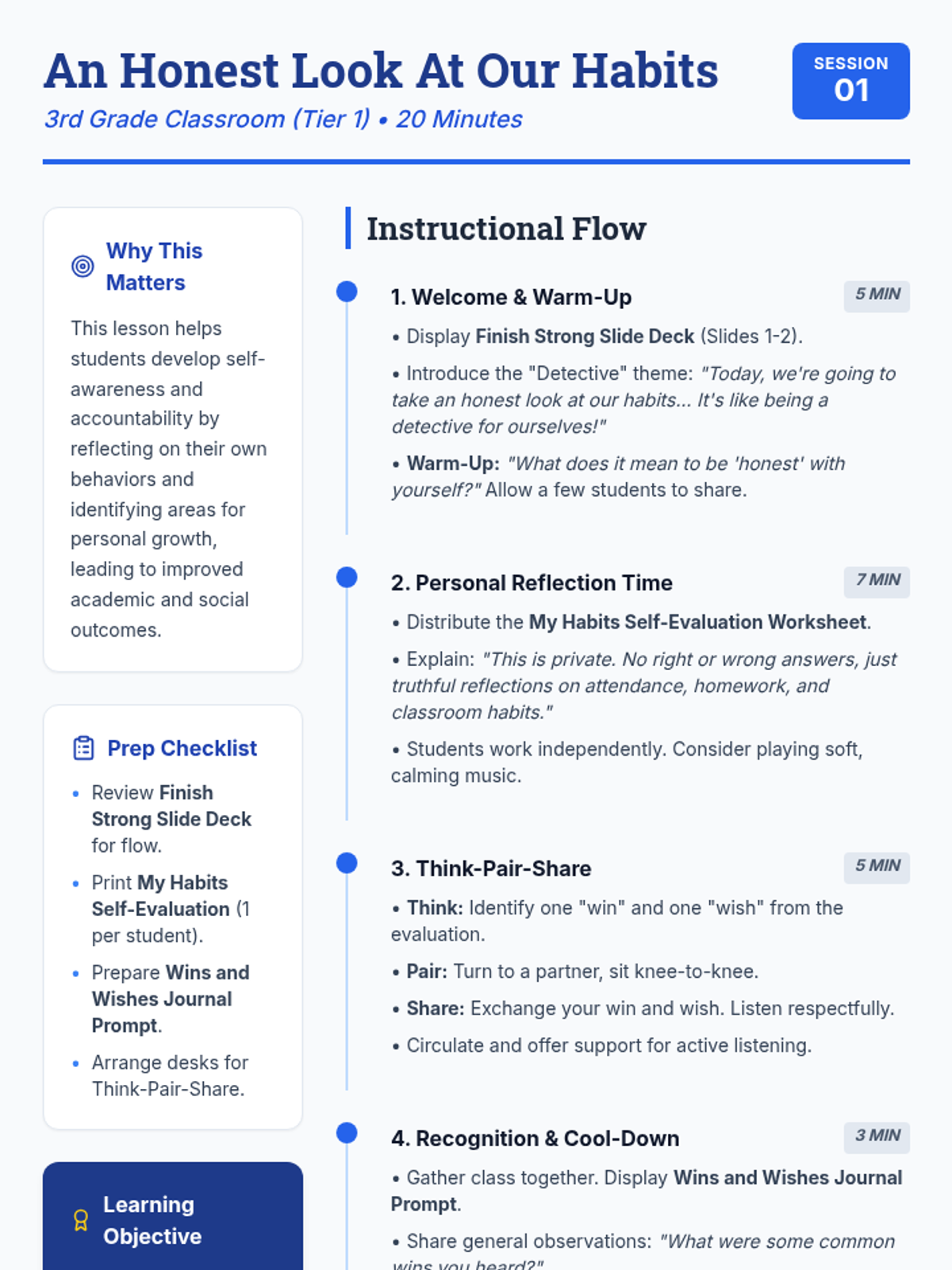 A 20-minute lesson for 3rd graders focused on honest self-reflection regarding attendance, homework, and classroom habits to foster accountability and personal growth.