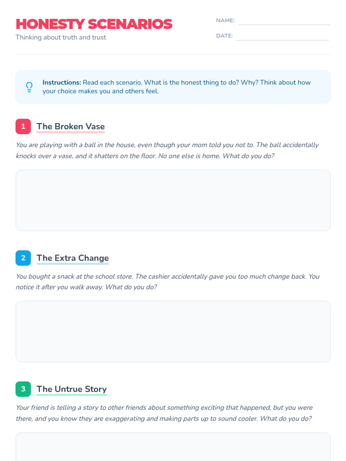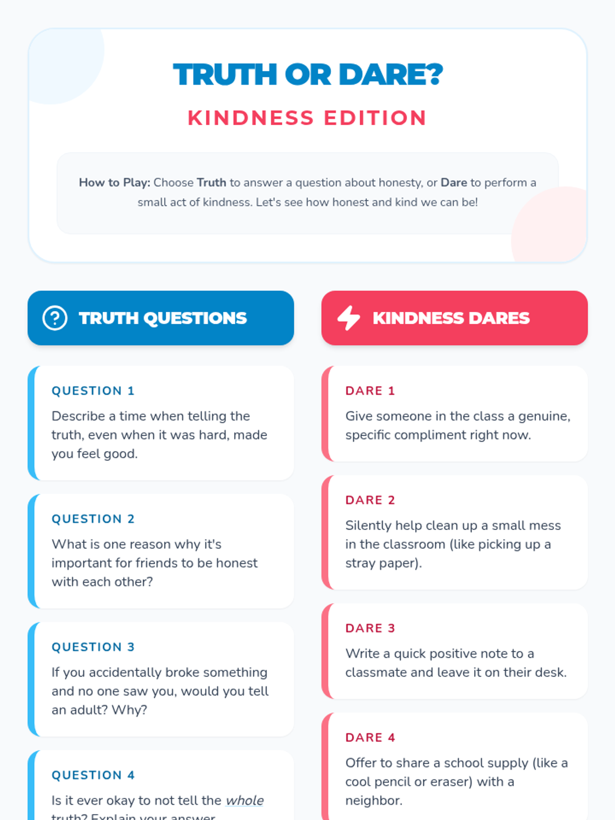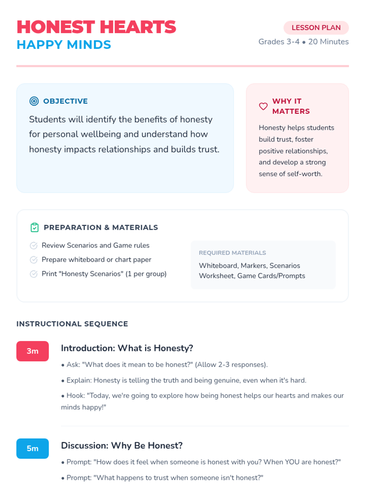 A 20-minute SEL lesson for 3rd and 4th graders exploring the connection between honesty, trust, and personal wellbeing. Students engage in discussions, scenario-based problem solving, and a fun kindness-focused game.