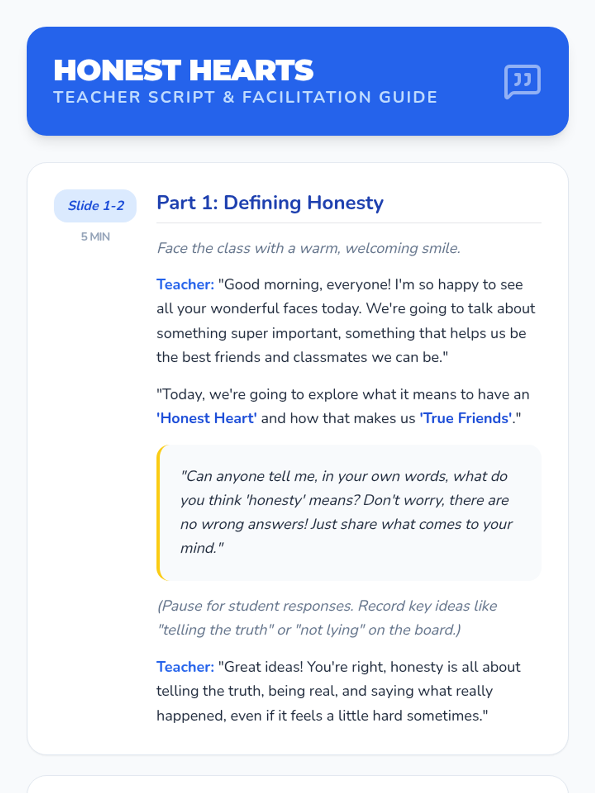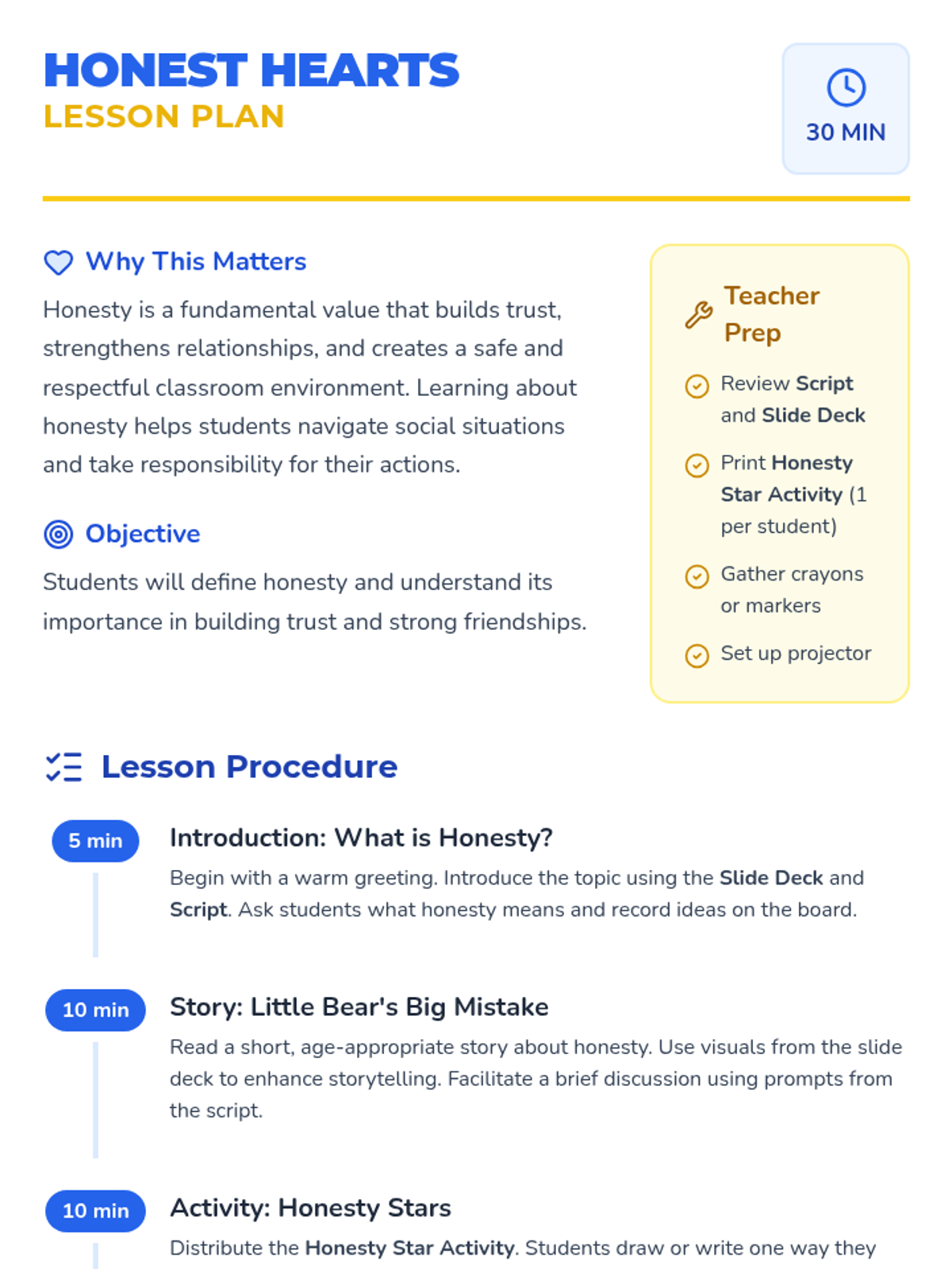 A 30-minute social-emotional learning lesson for young students focused on defining honesty and understanding how telling the truth builds trust and strong friendships.
