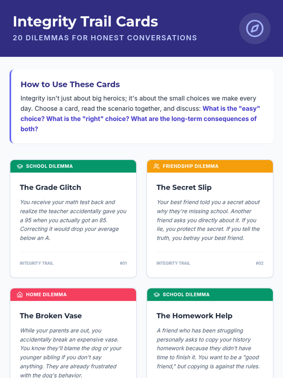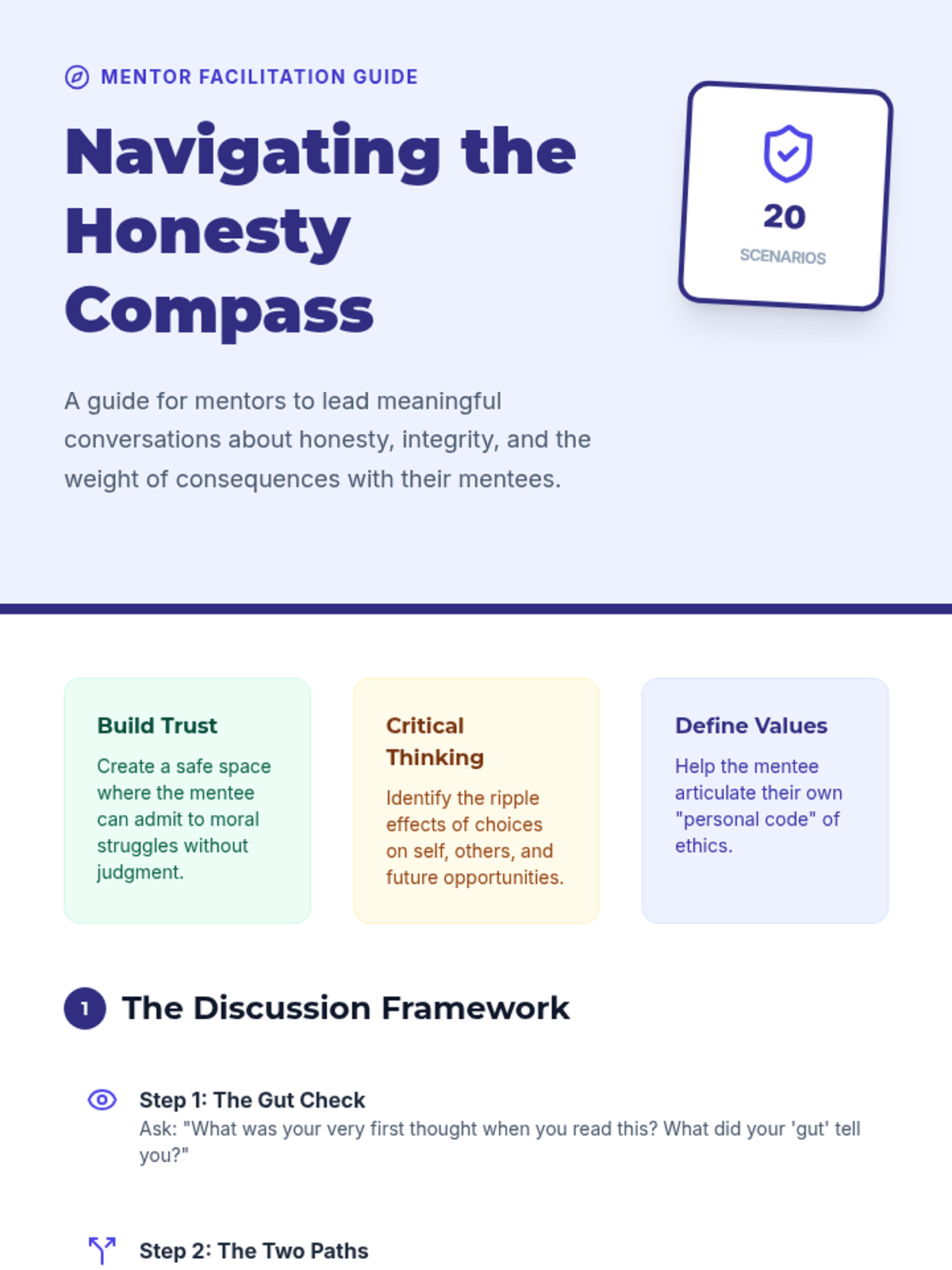 A collection of real-life scenarios and discussion tools designed for mentor-mentee pairs to explore the nuances of honesty, integrity, and the weight of consequences.