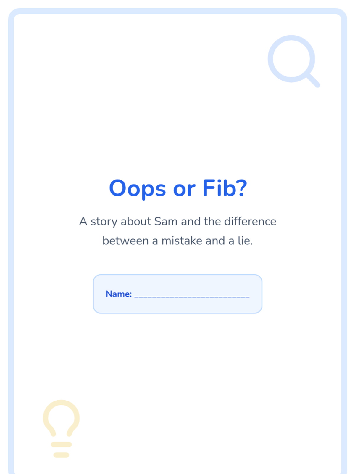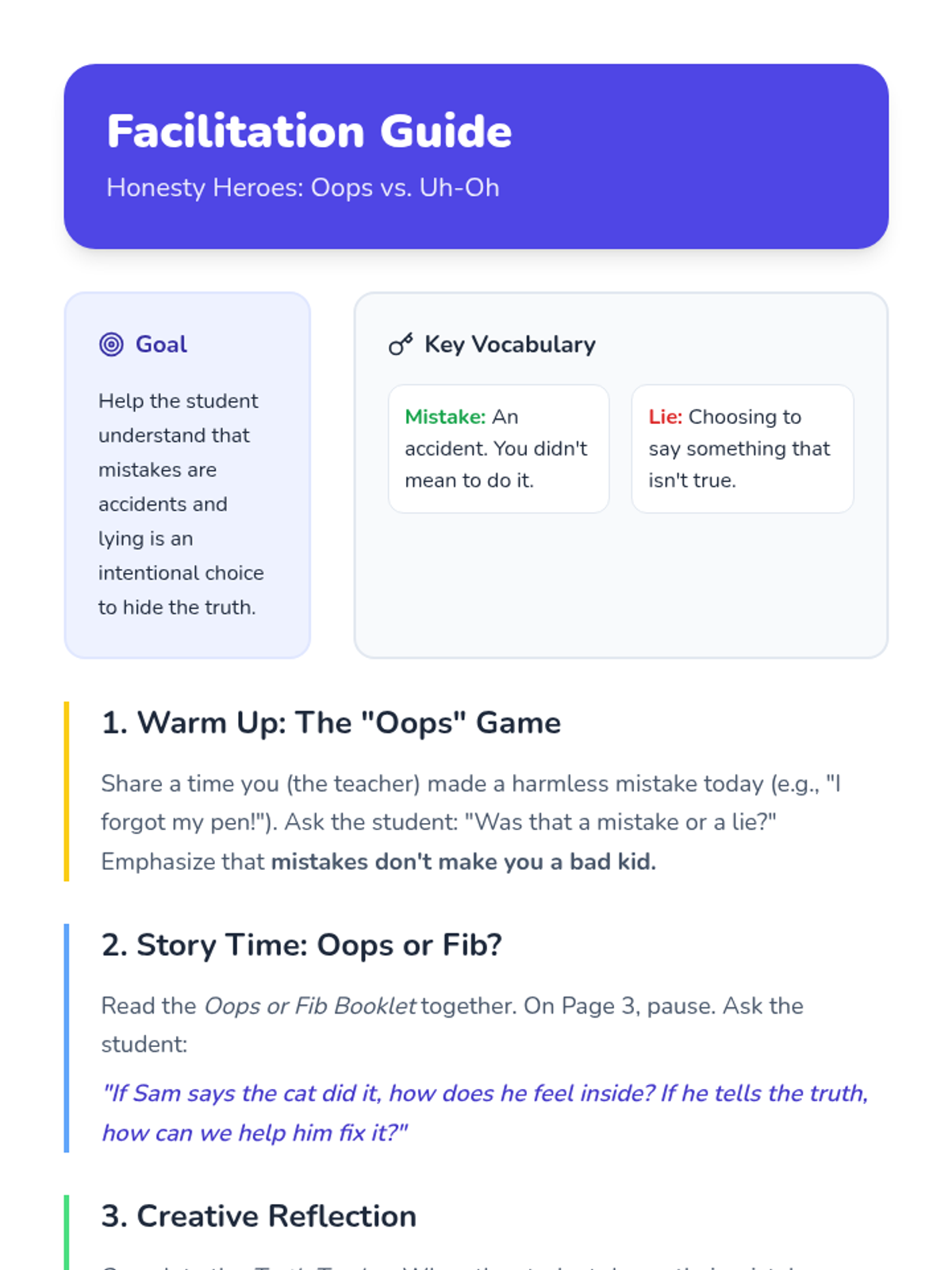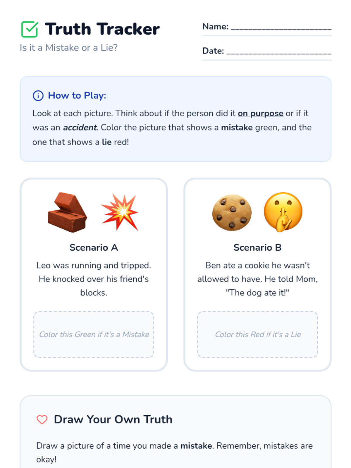 A supportive one-on-one lesson designed to help a 1st-grade student distinguish between accidental mistakes and intentional lies through storytelling and creative reflection.