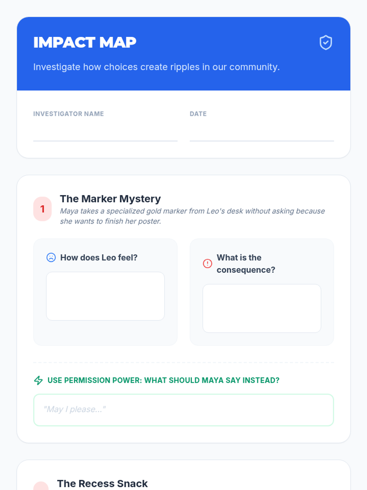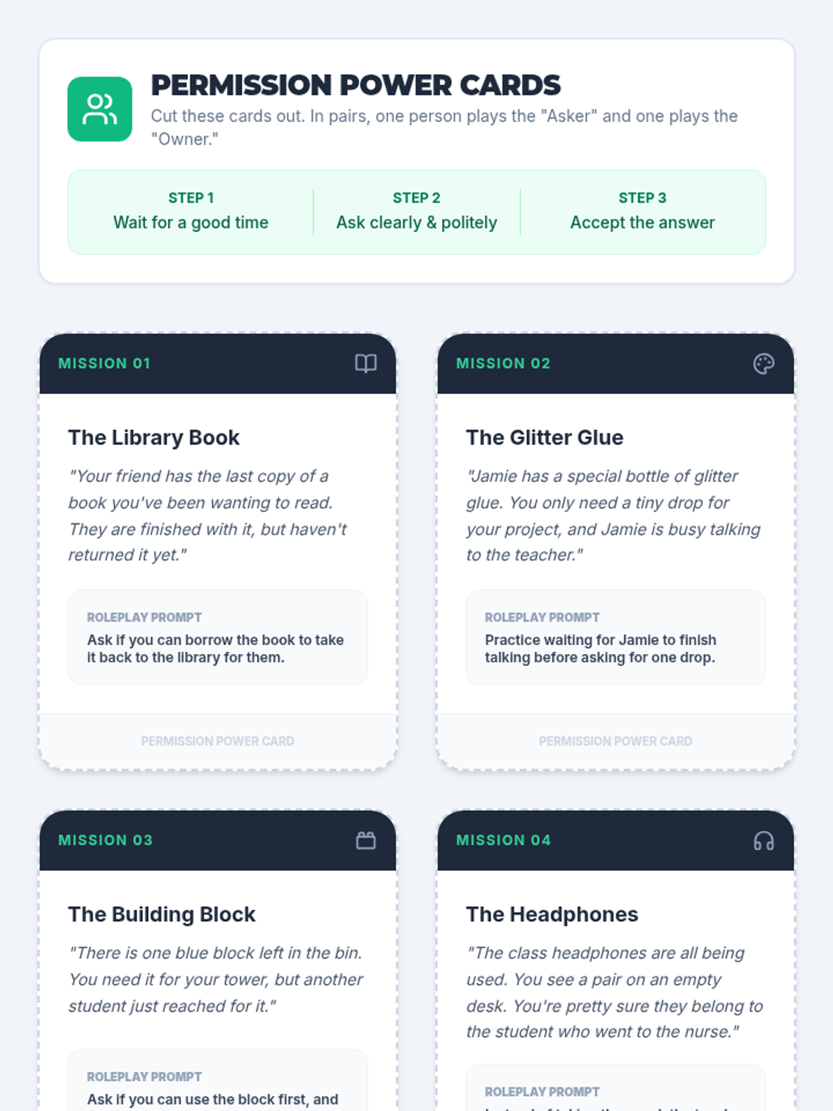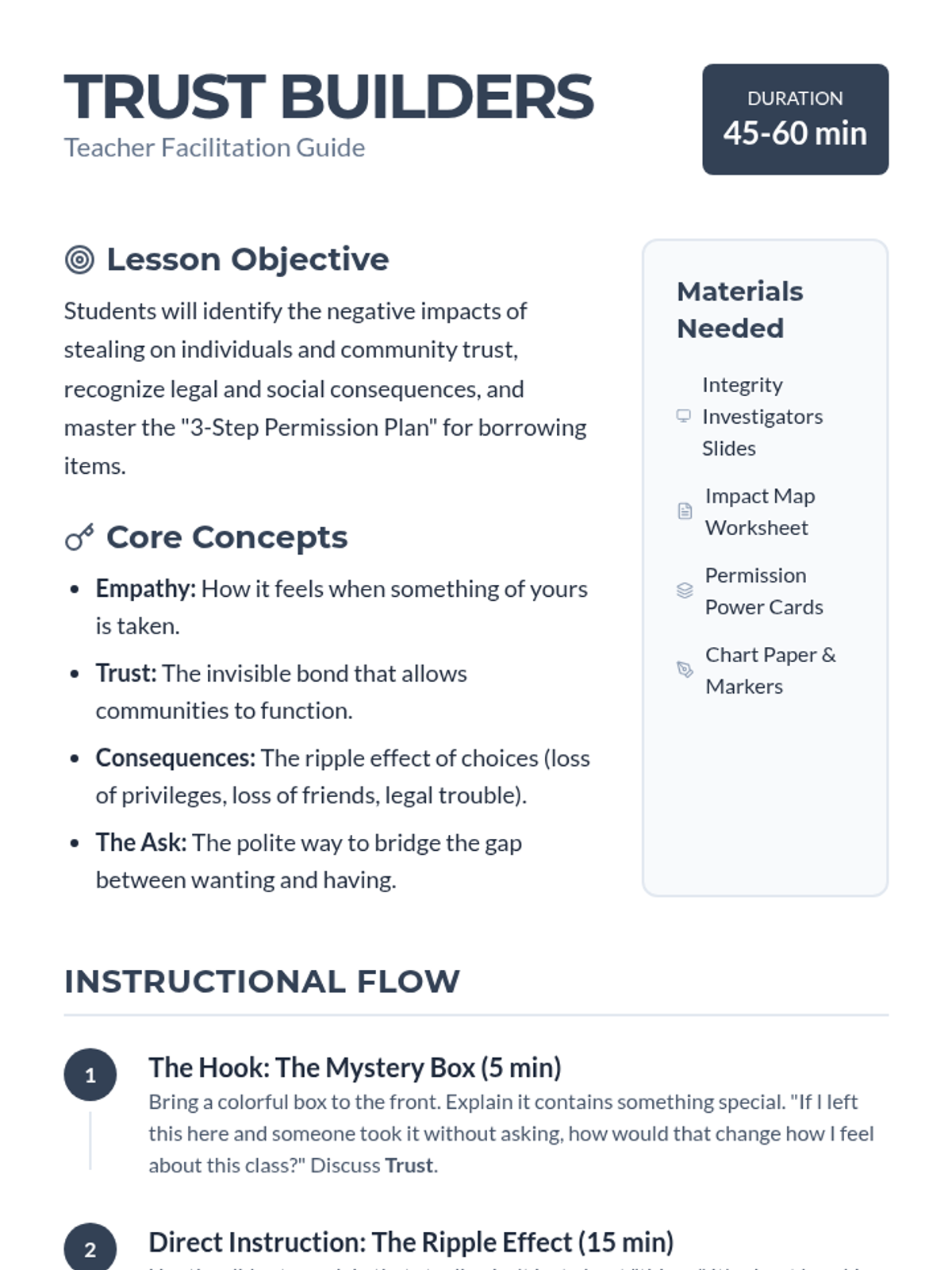 A character-building lesson focusing on the impact of stealing, understanding consequences, and practicing how to ask for permission to maintain community trust.