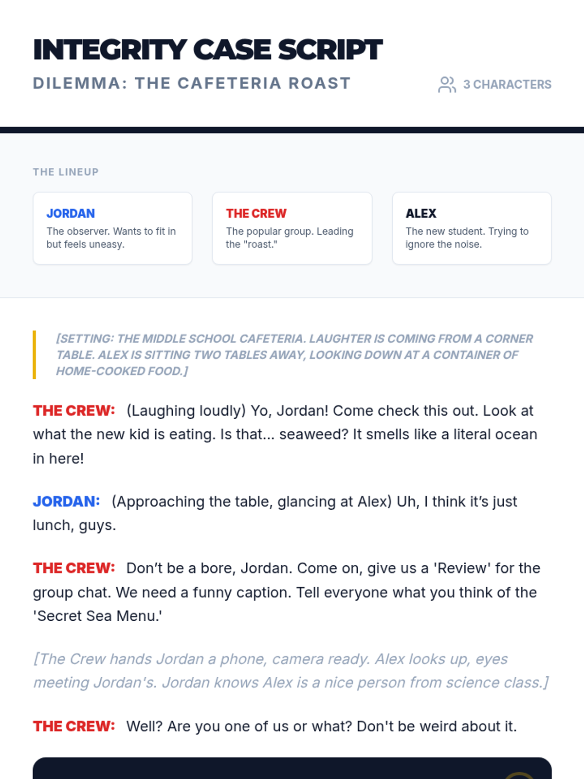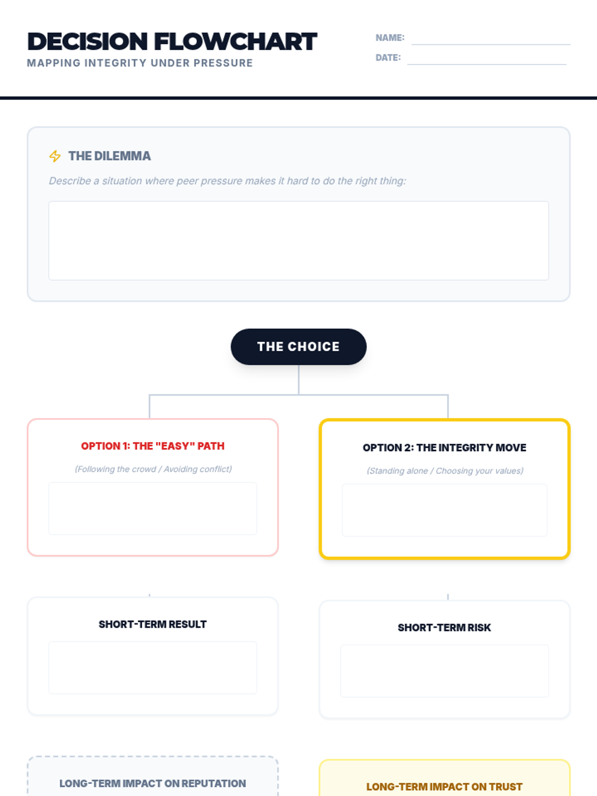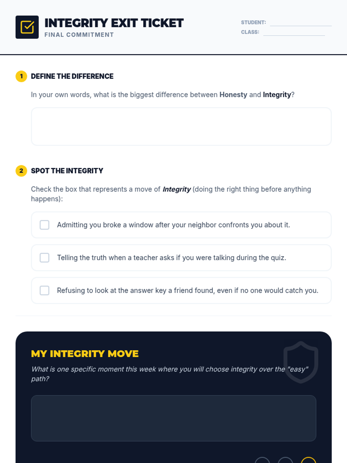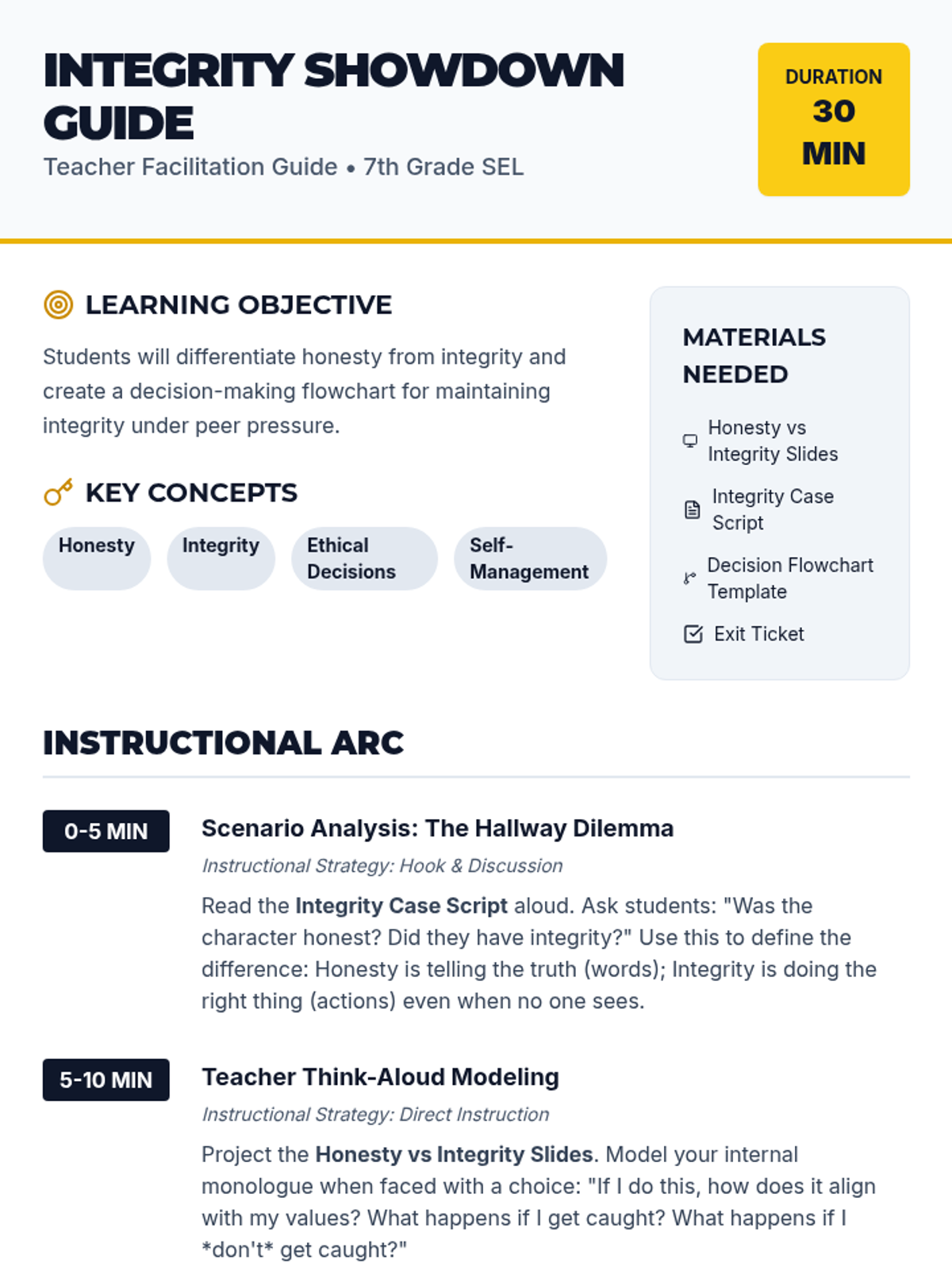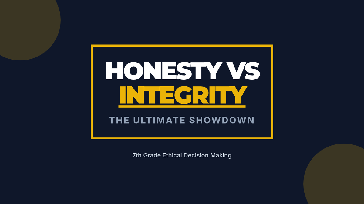 A high-energy 30-minute lesson where 7th graders distinguish between being honest (telling the truth) and having integrity (doing the right thing when no one is watching), culminating in a personal decision-making flowchart.