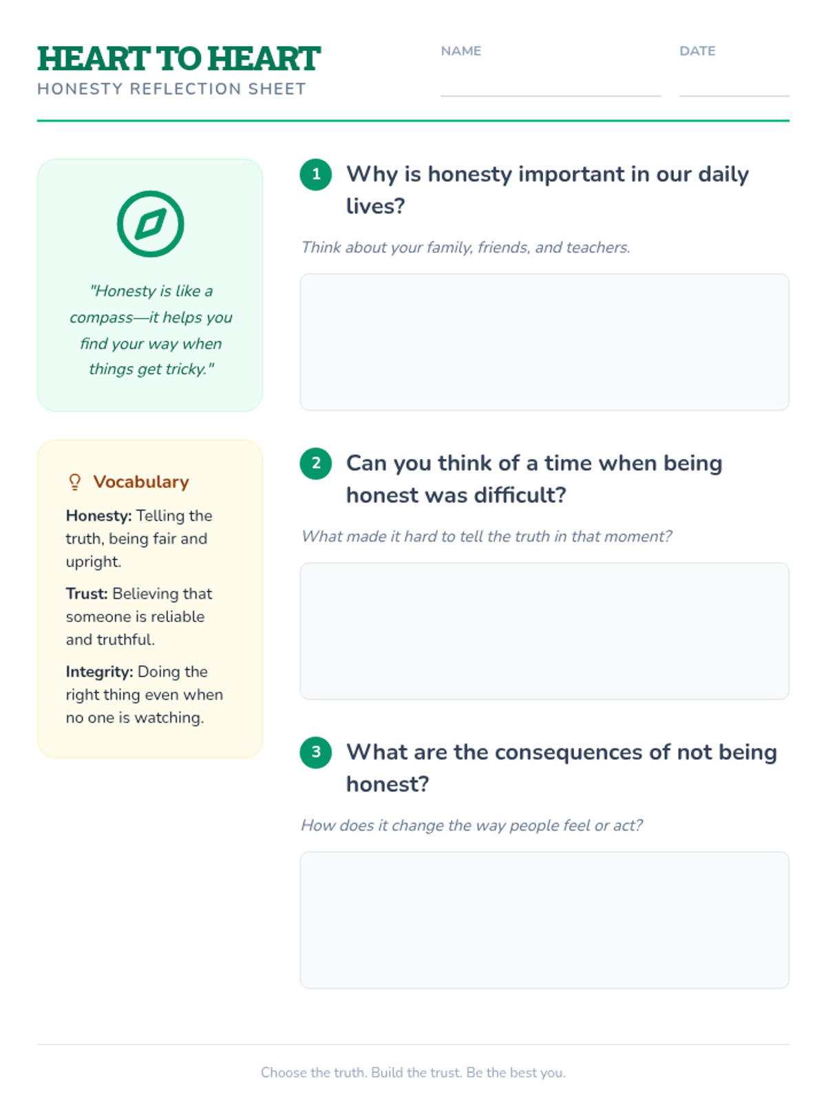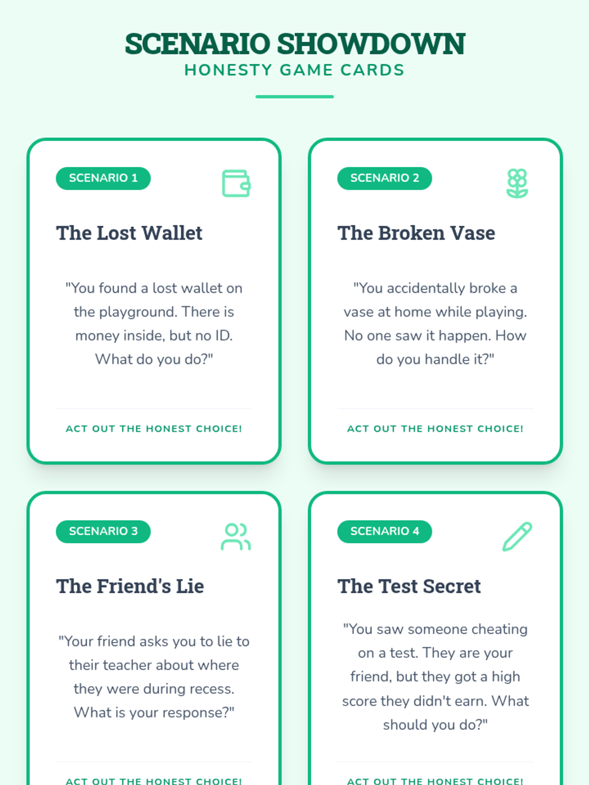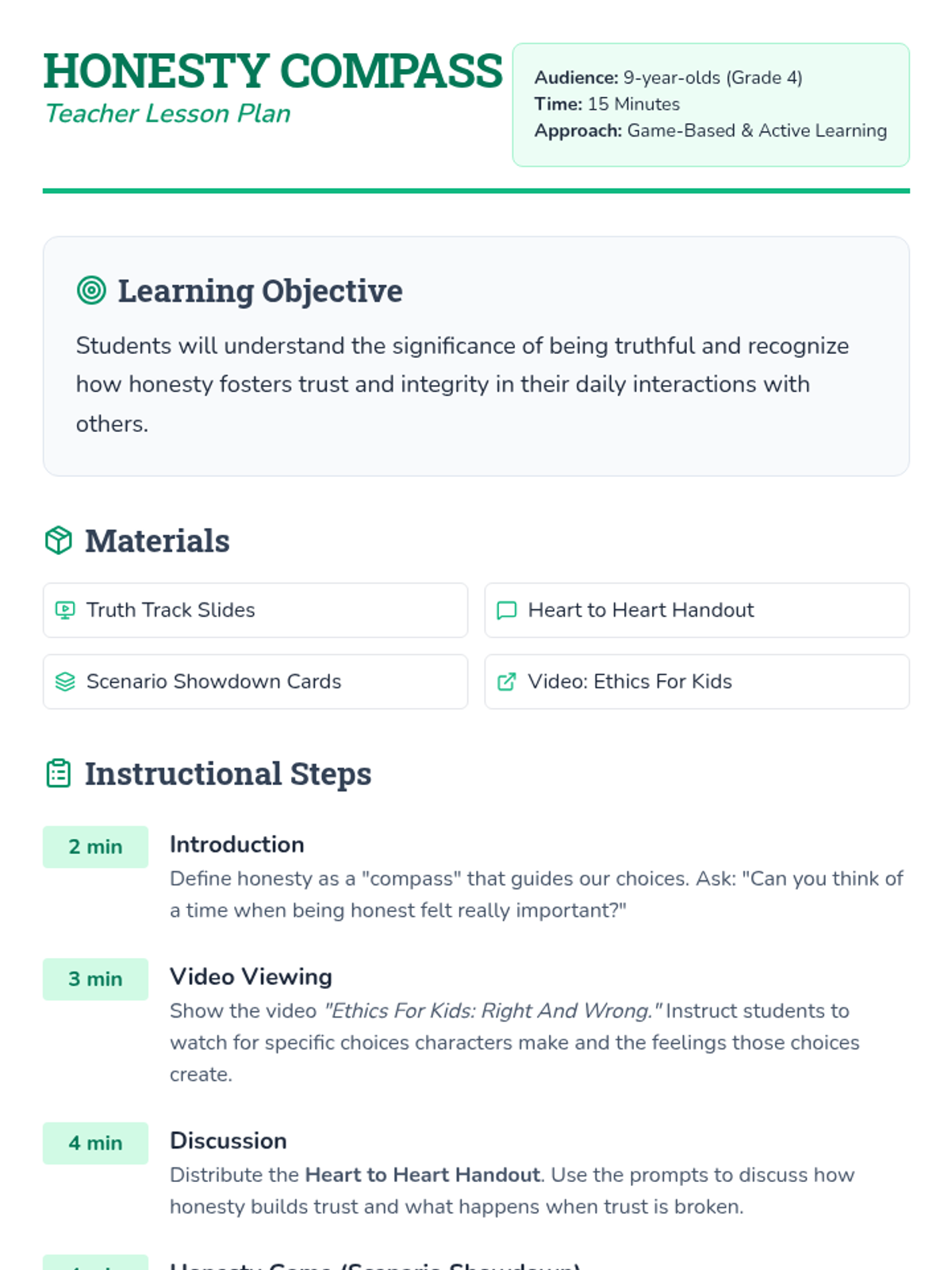 A game-based lesson for 9-year-olds exploring the importance of honesty, trust, and integrity through role-play and reflective discussion.