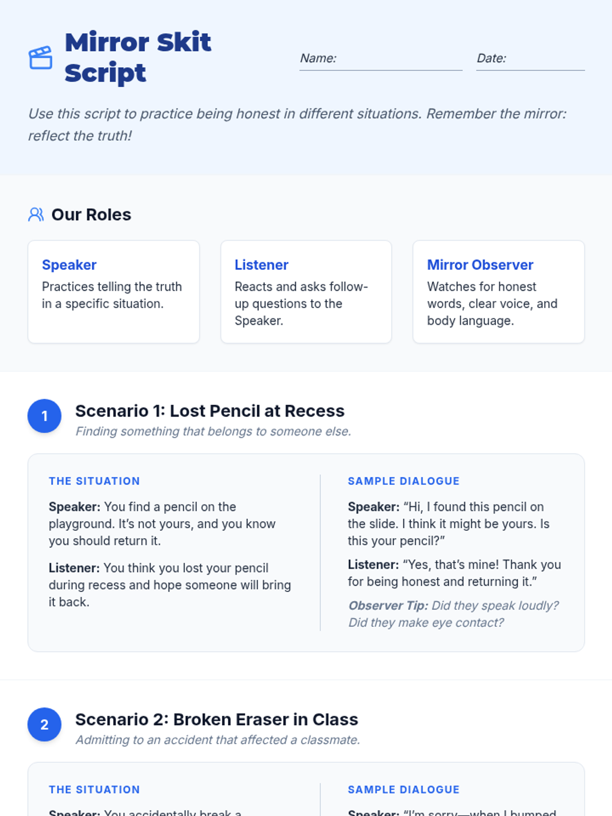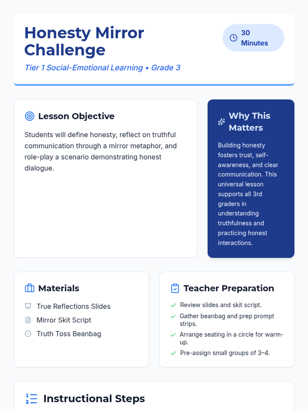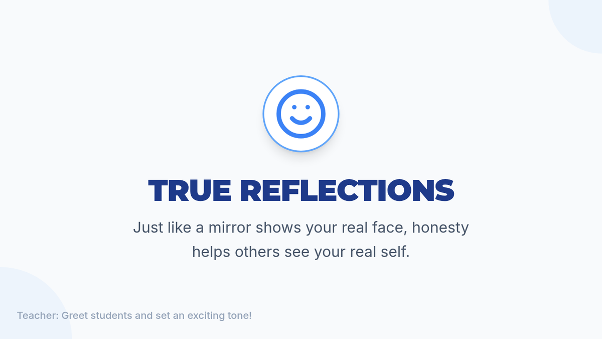 A 30-minute 3rd grade lesson where students explore honesty through a mirror metaphor, engaging in reflection, role-play, and interactive games to build self-awareness and communication skills.