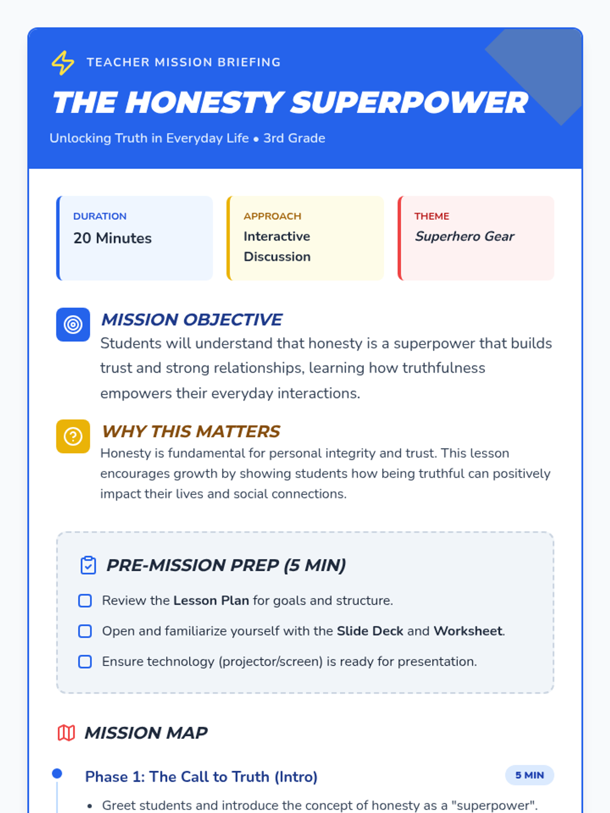 A 3rd-grade lesson that frames honesty as a superpower, teaching students how truthfulness builds trust and strengthens relationships through interactive discussions and reflective activities.