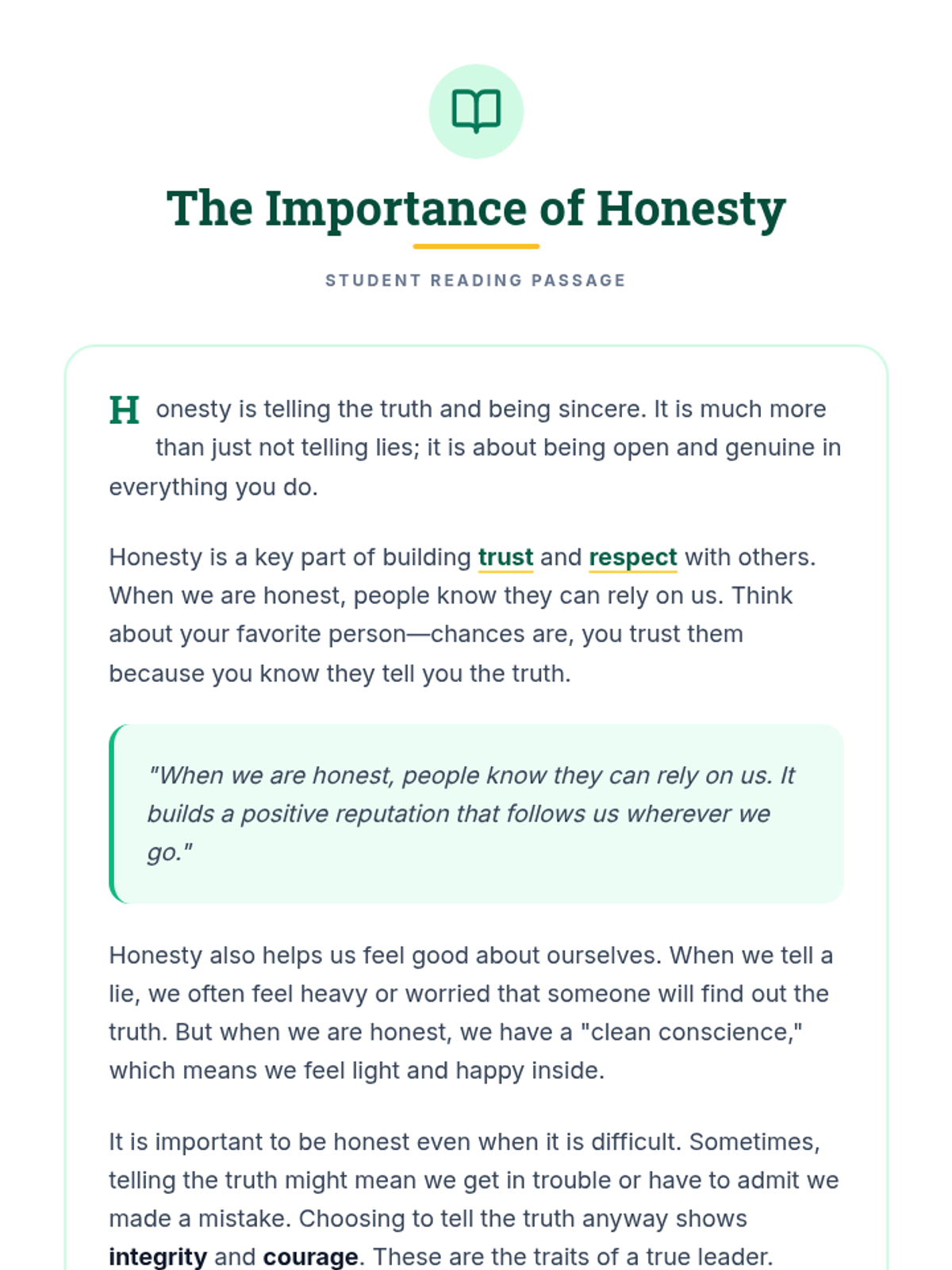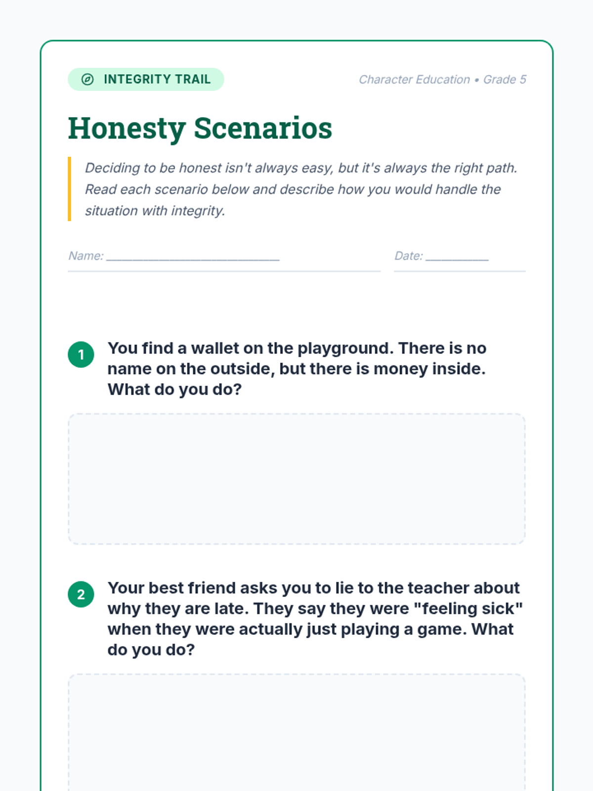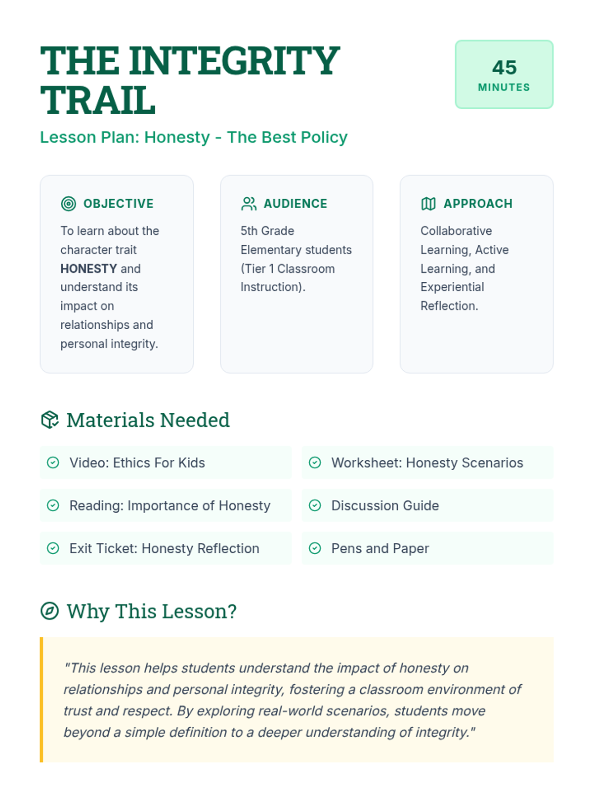 A comprehensive lesson for 5th graders on the character trait of honesty, featuring scenarios, reading passages, and interactive discussions to explore integrity and trust.