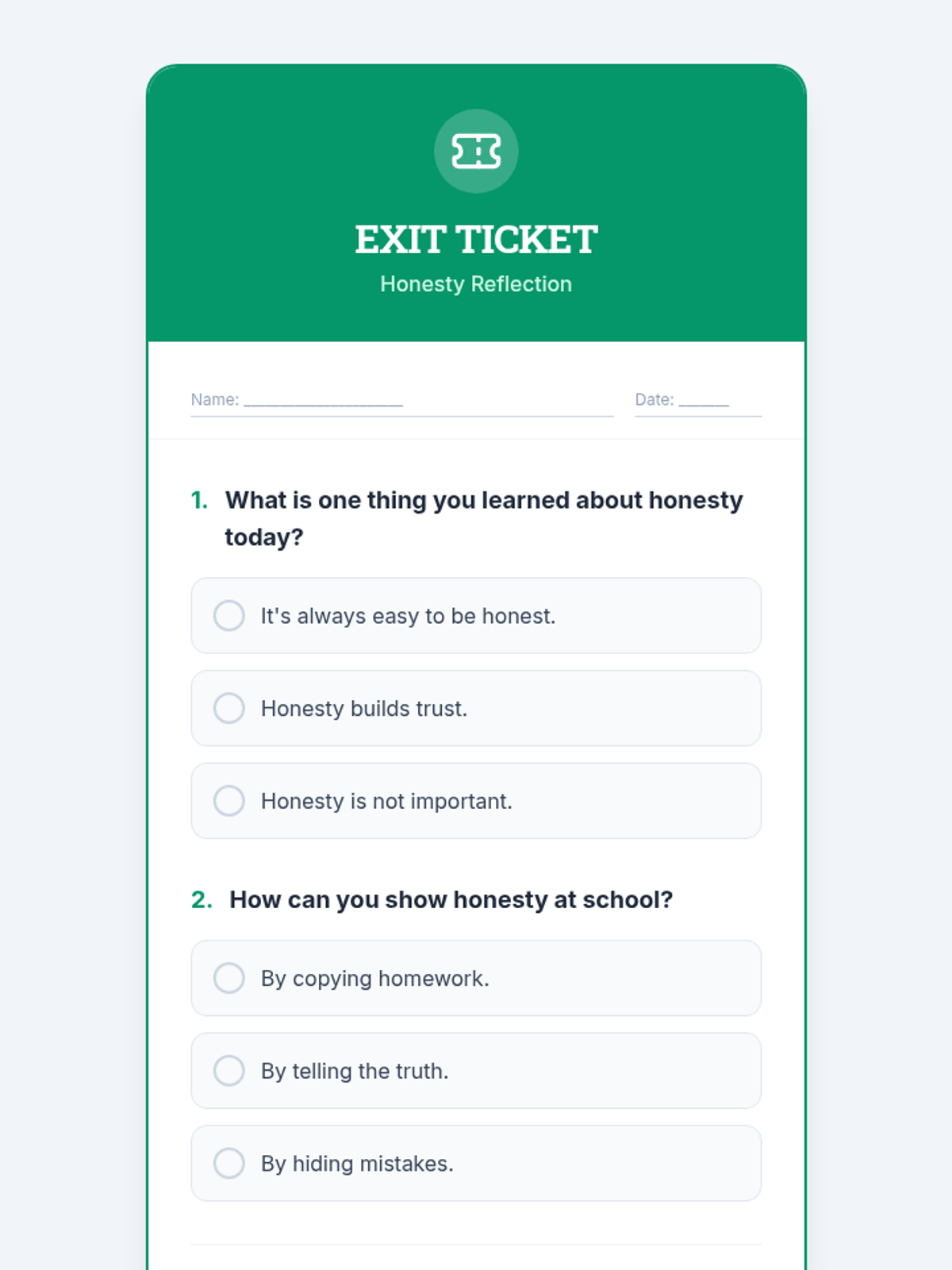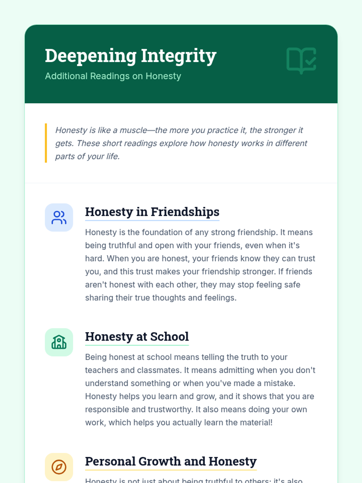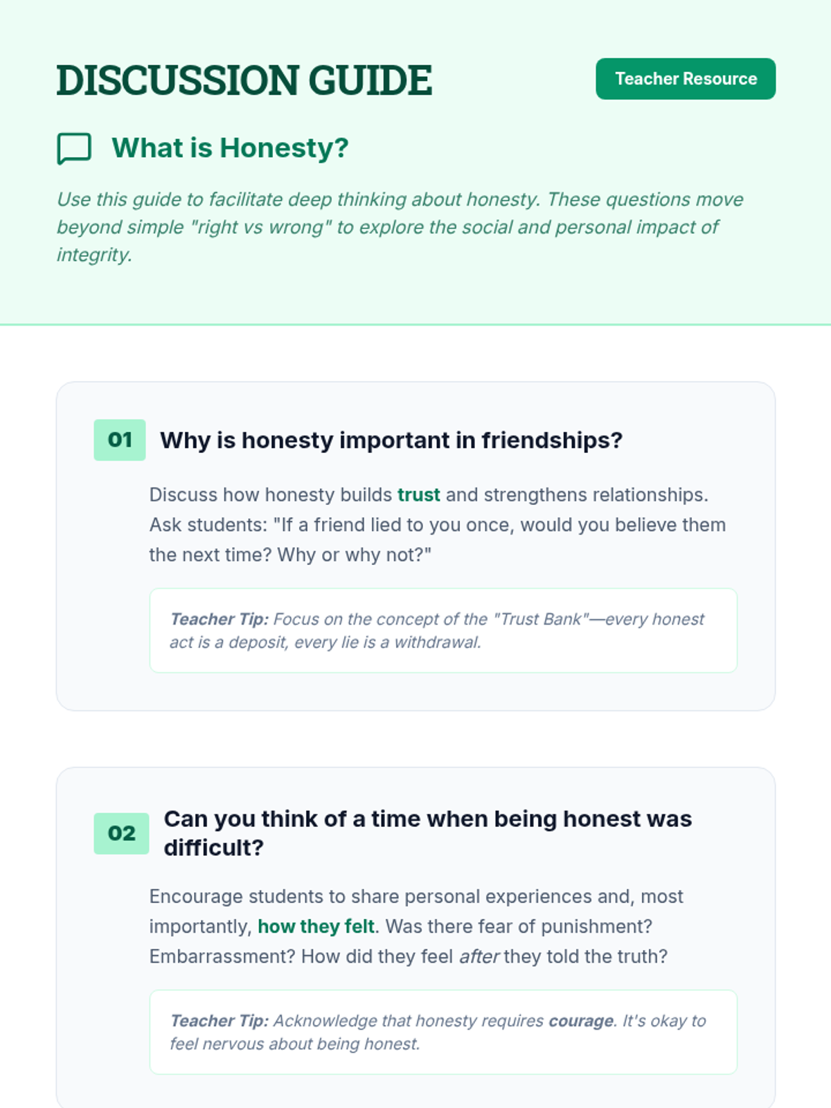 A comprehensive lesson for 5th graders on the character trait of honesty, featuring scenarios, reading passages, and interactive discussions to explore integrity and trust.