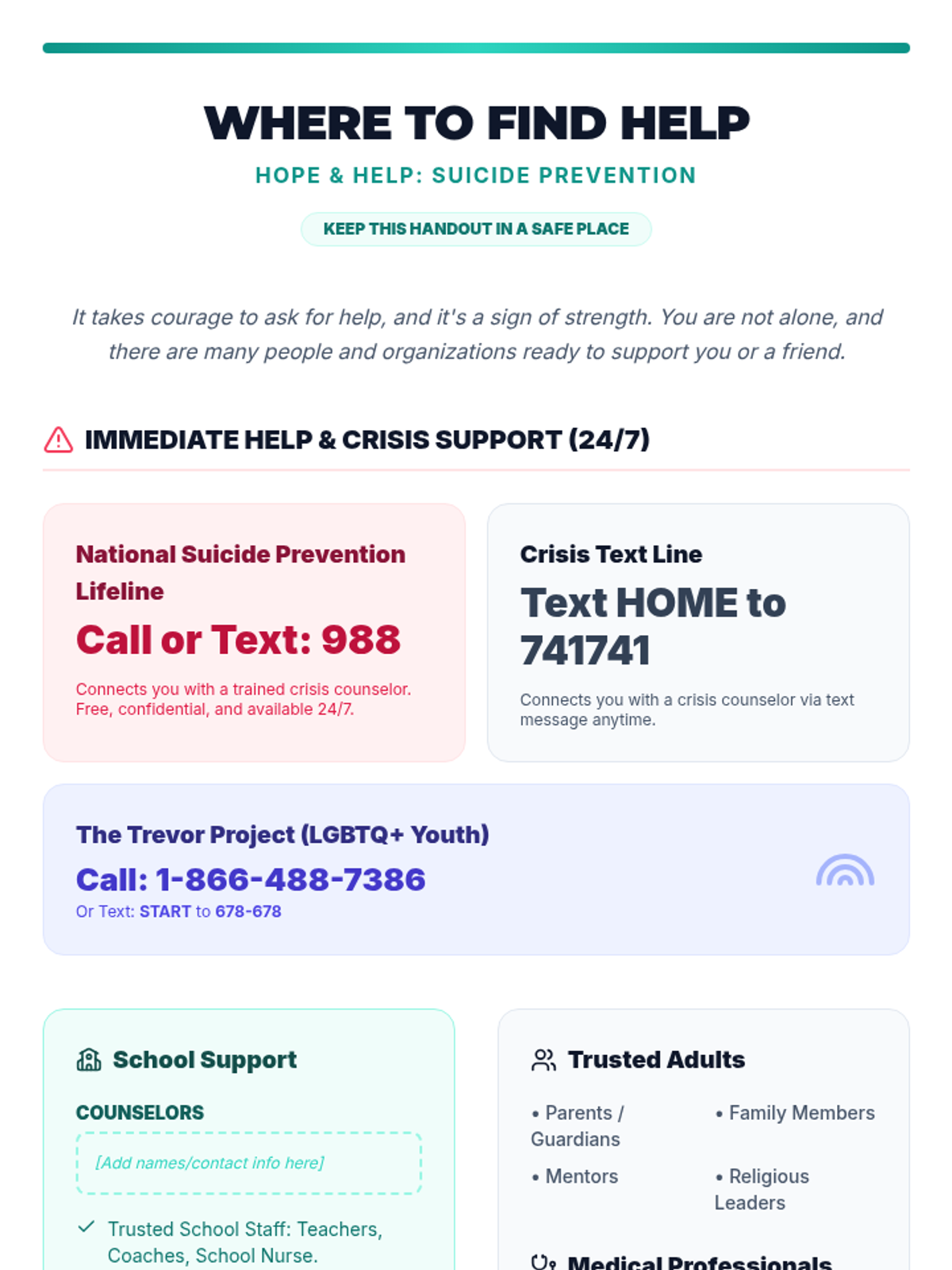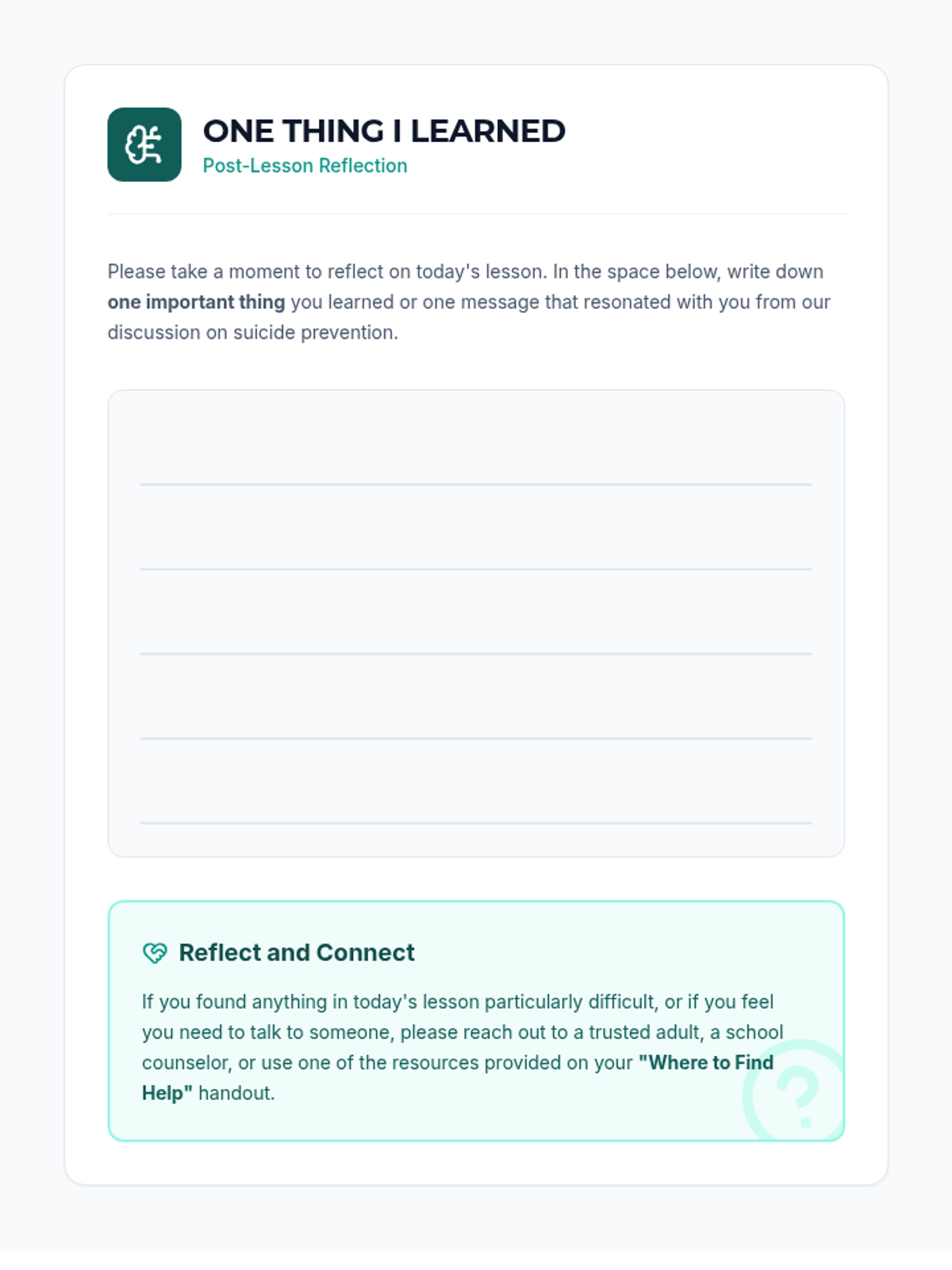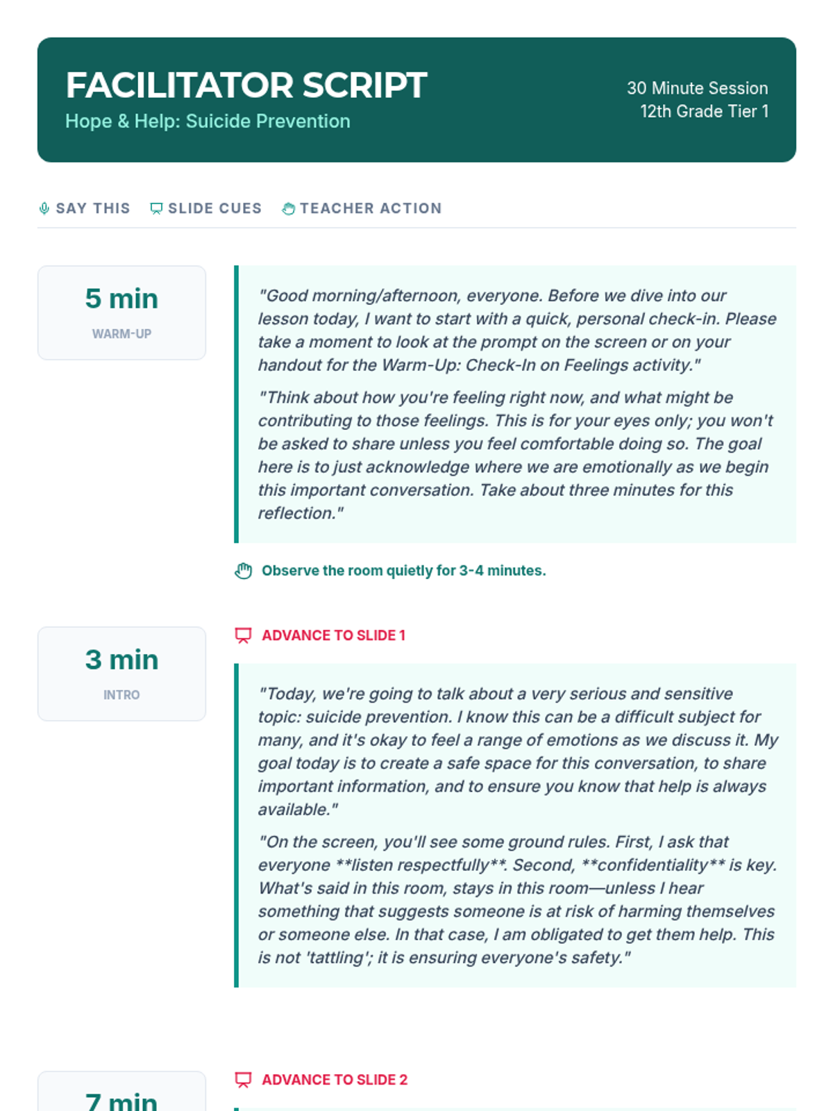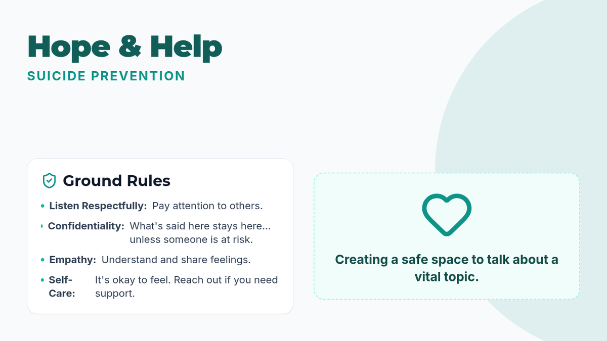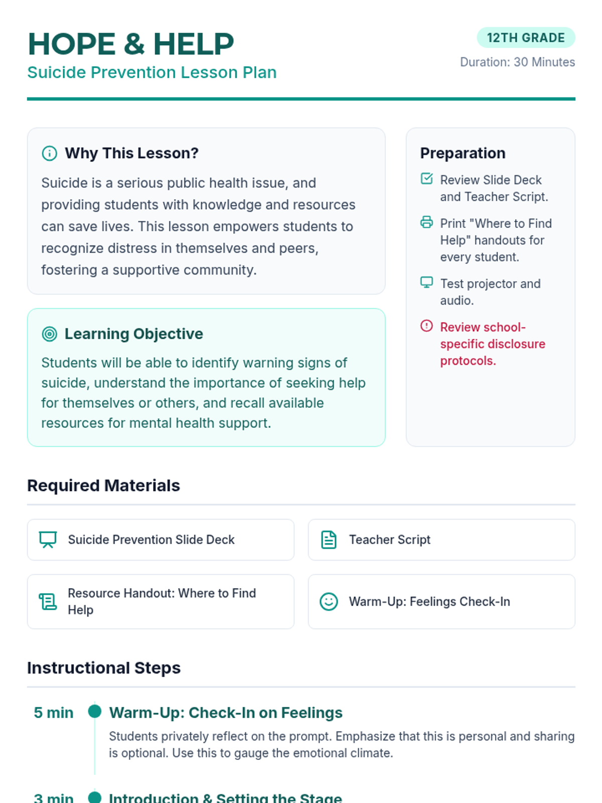 A crucial 30-minute suicide prevention lesson for 12th graders, focusing on recognizing warning signs, the ACT (Acknowledge, Care, Tell) framework, and connecting with resources.