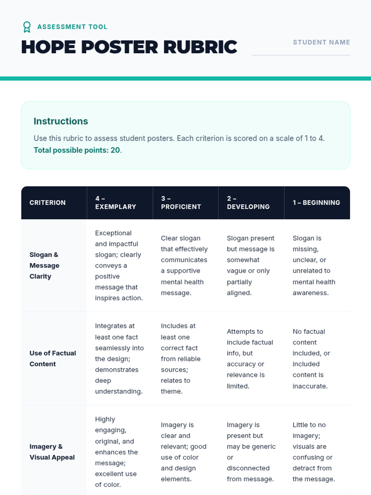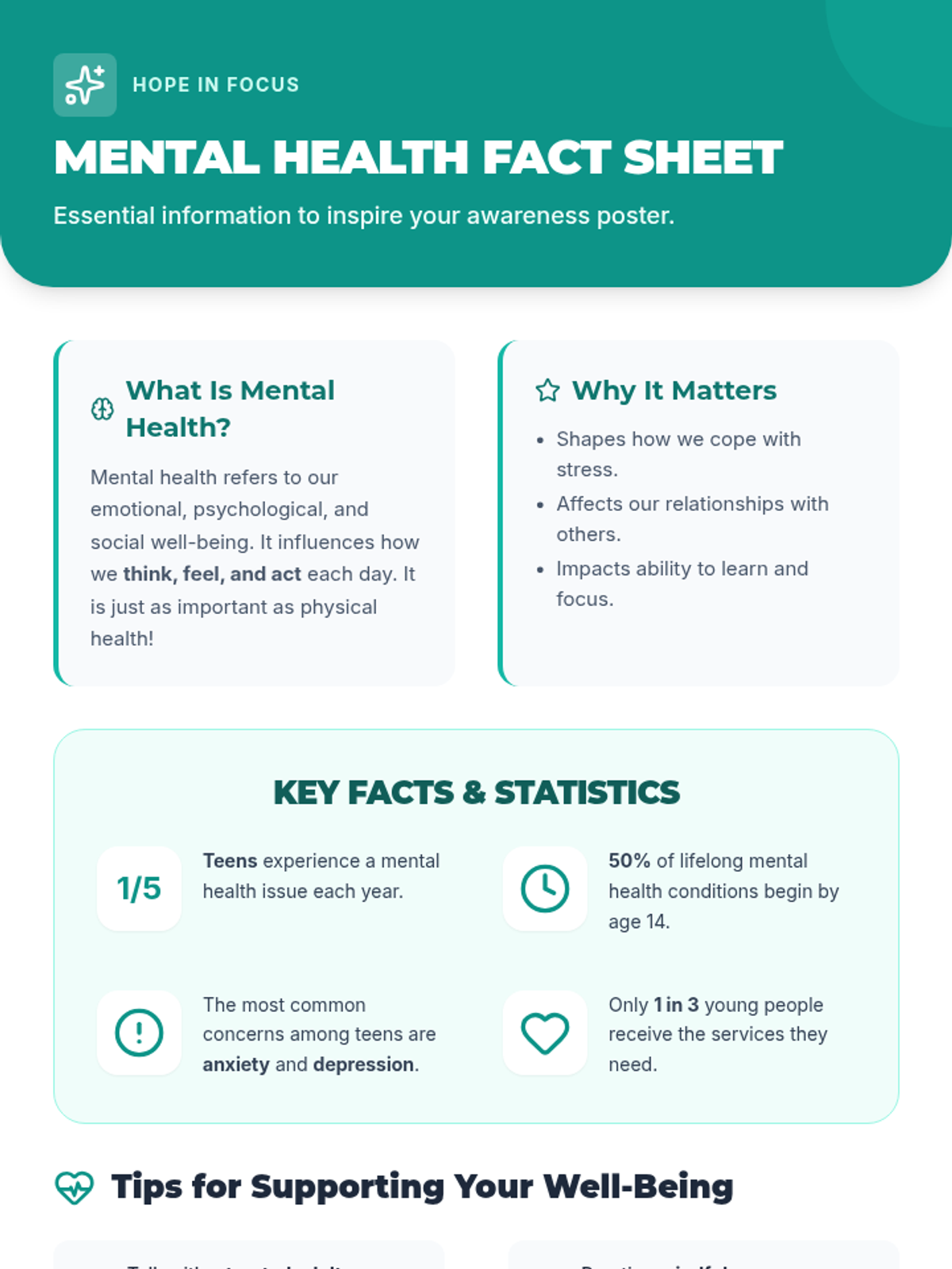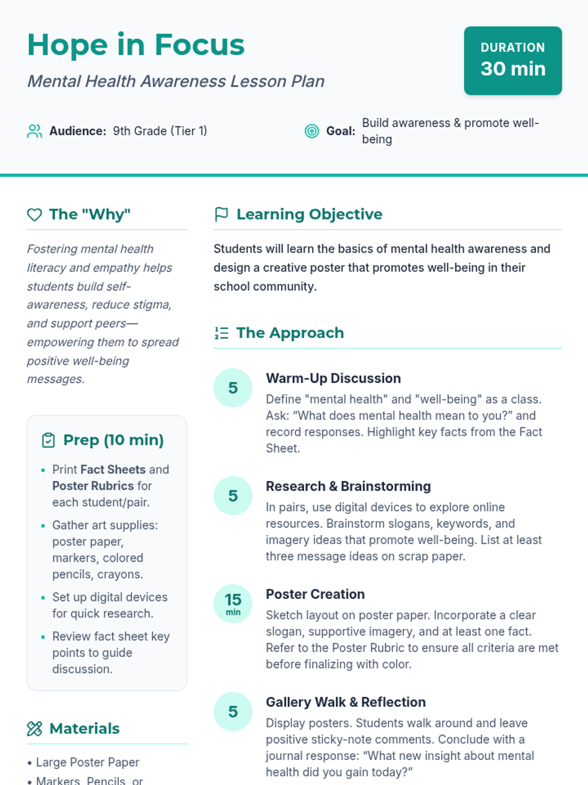 A 30-minute Tier 1 lesson for 9th graders focusing on mental health awareness, empathy, and visual communication through poster design.
