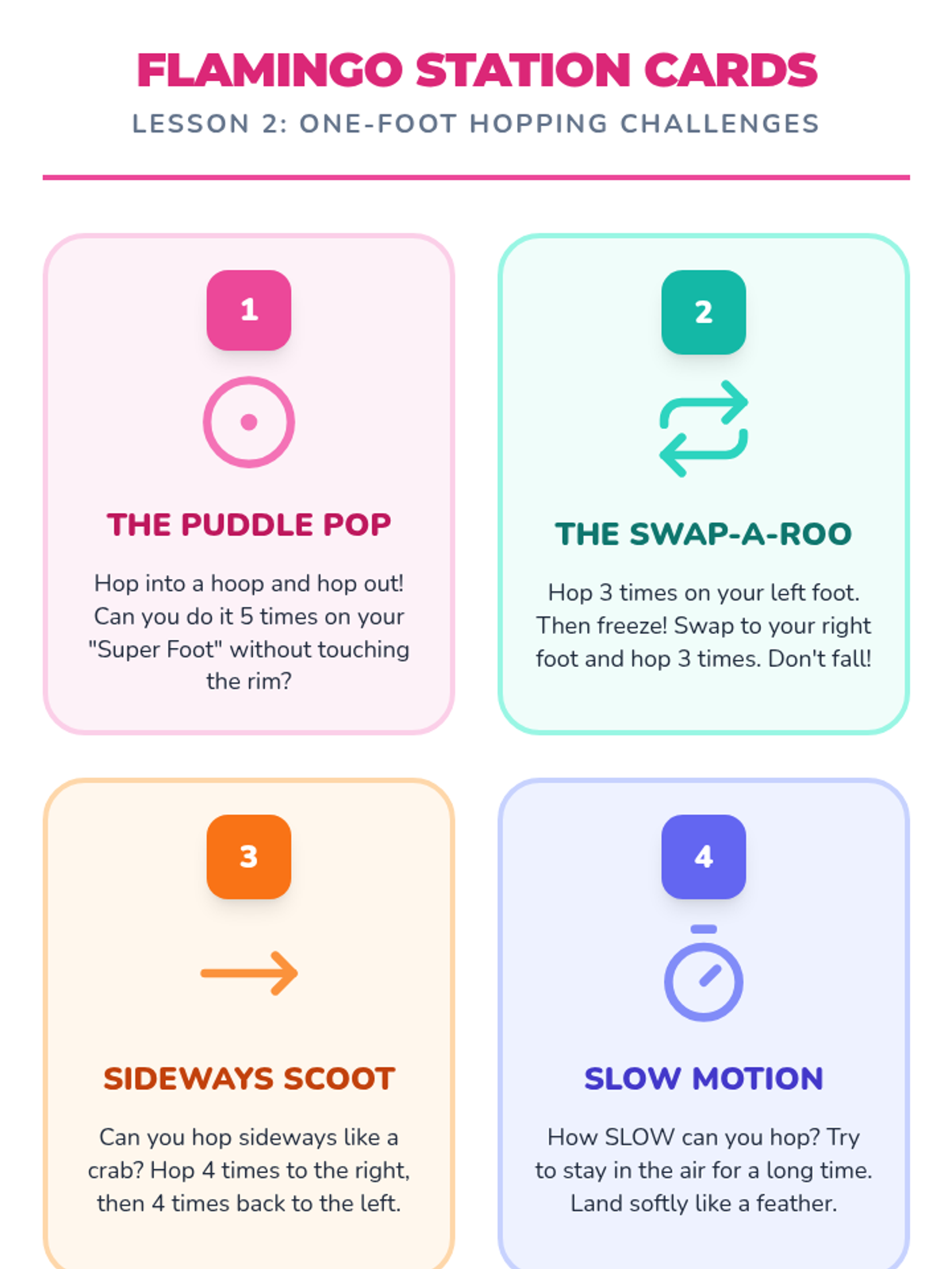 Students practice hopping on one foot, emphasizing balance and use of arms for stability.