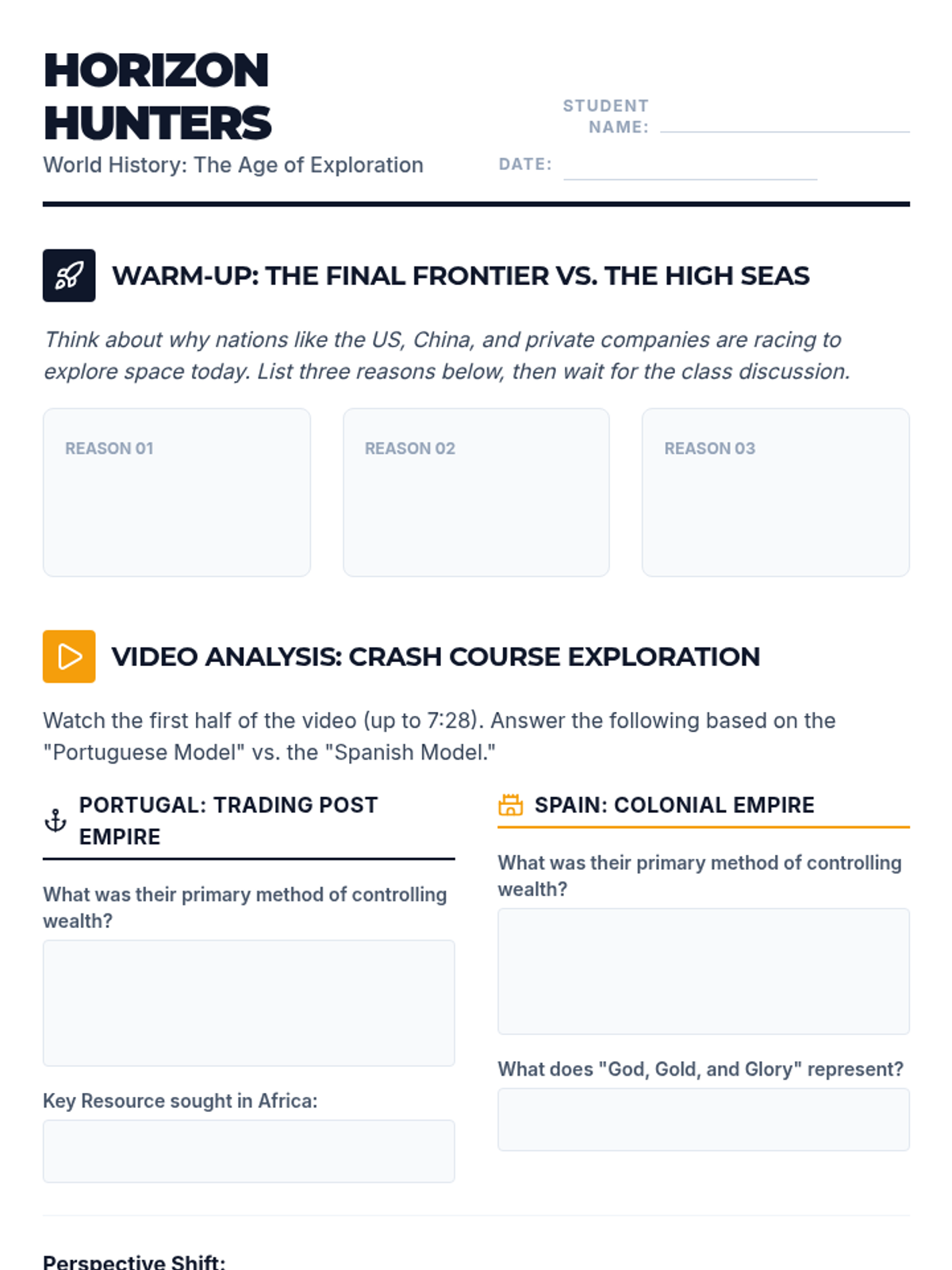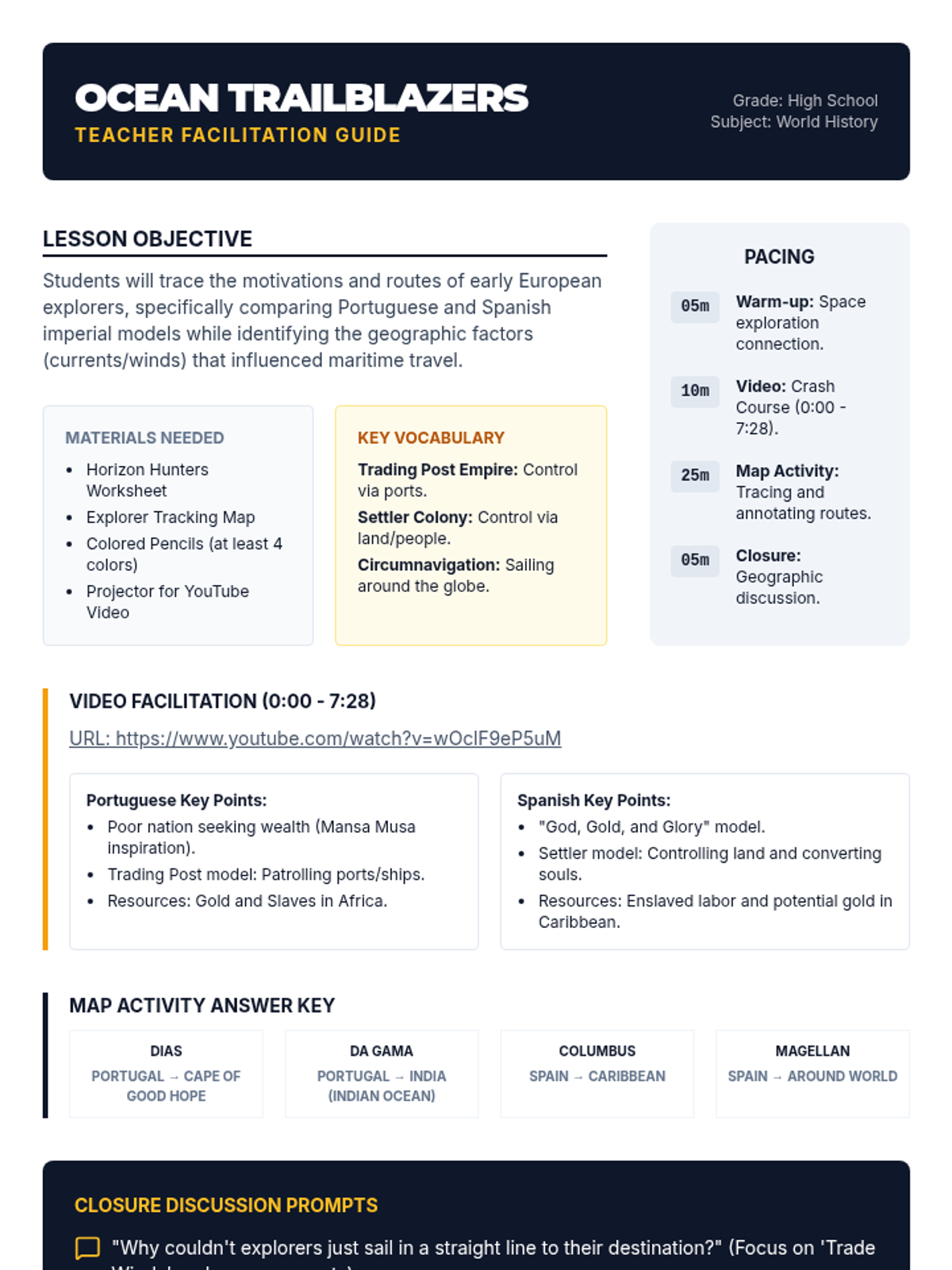 Students will investigate the economic and religious motivations behind the Age of Discovery, comparing the Portuguese 'Trading Post Empire' with the Spanish colonial model while mapping the major maritime routes of the 15th and 16th centuries.