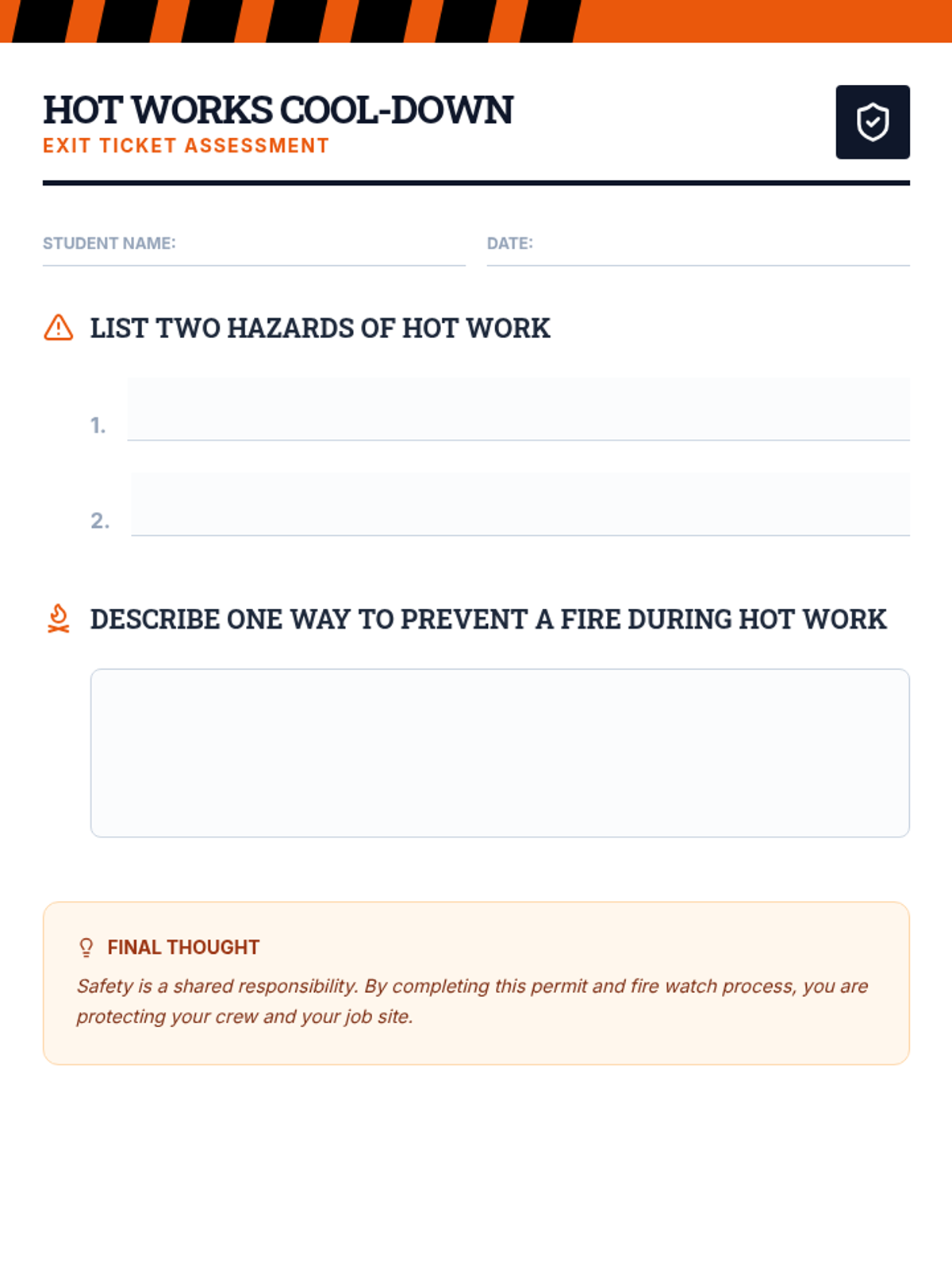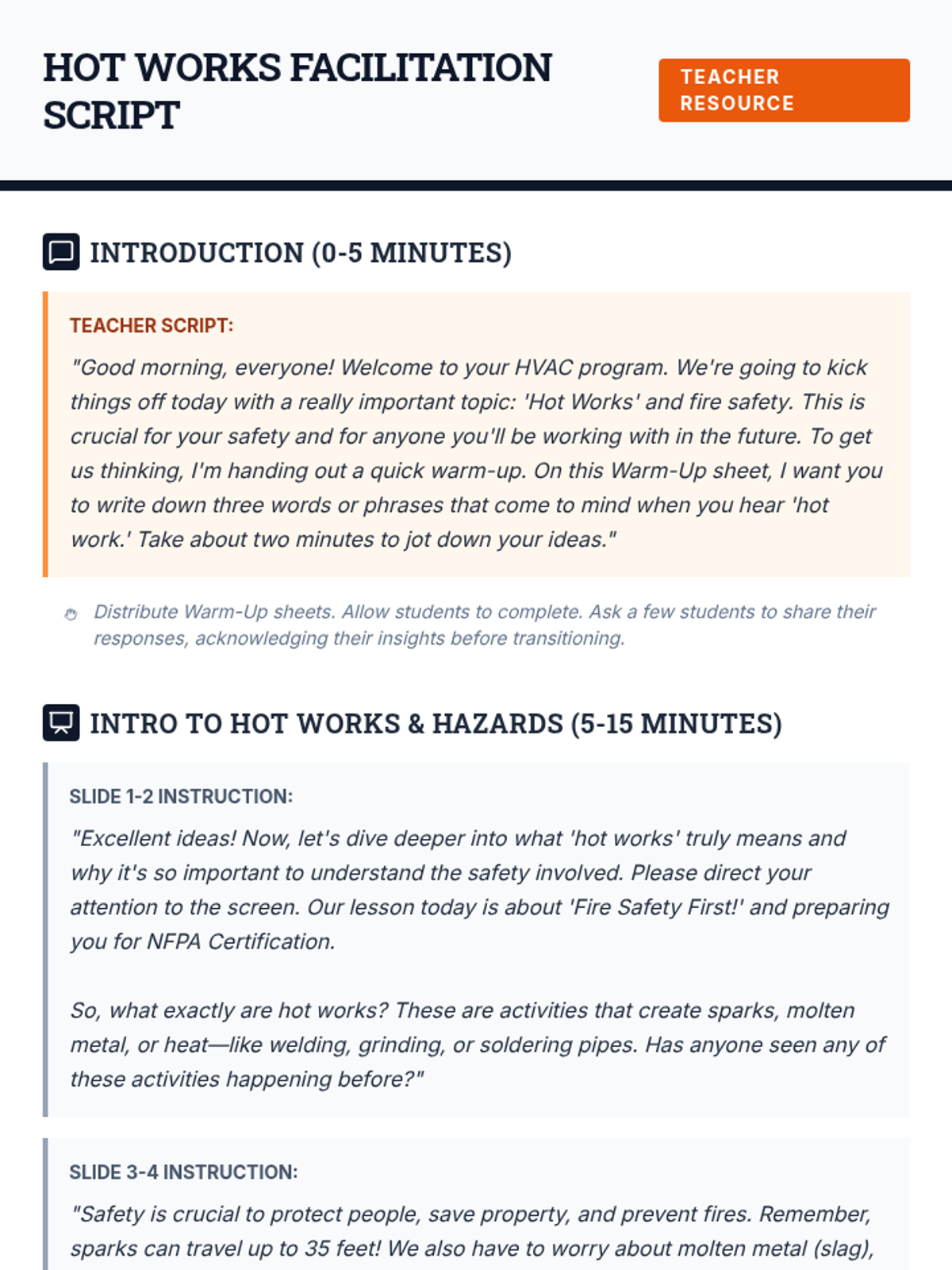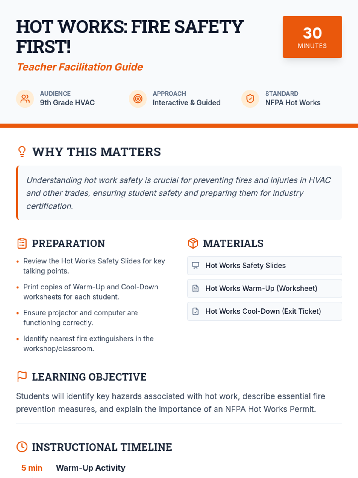 This lesson introduces incoming 9th-grade HVAC students to the critical safety principles of NFPA Hot Works, preparing them for certification. Students will learn about the hazards, precautions, and best practices to ensure a safe work environment.