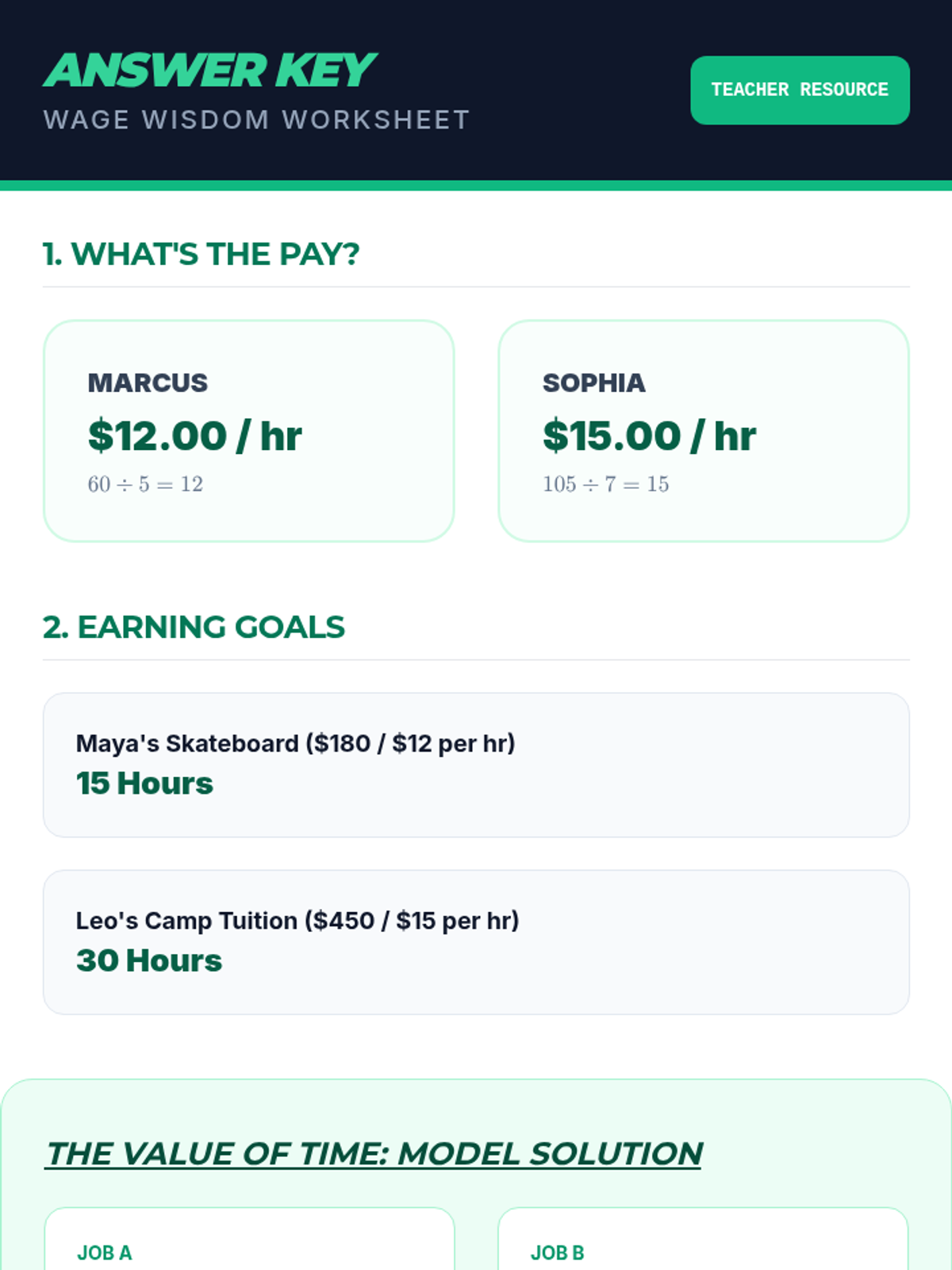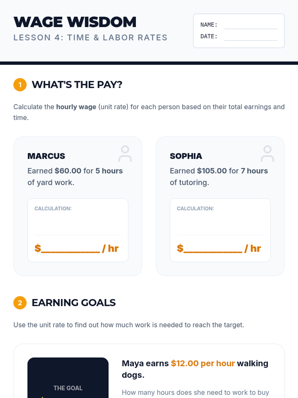 Extending unit rates to labor and time, students calculate hourly wages and service fees to solve problems regarding earnings and linear predictions.