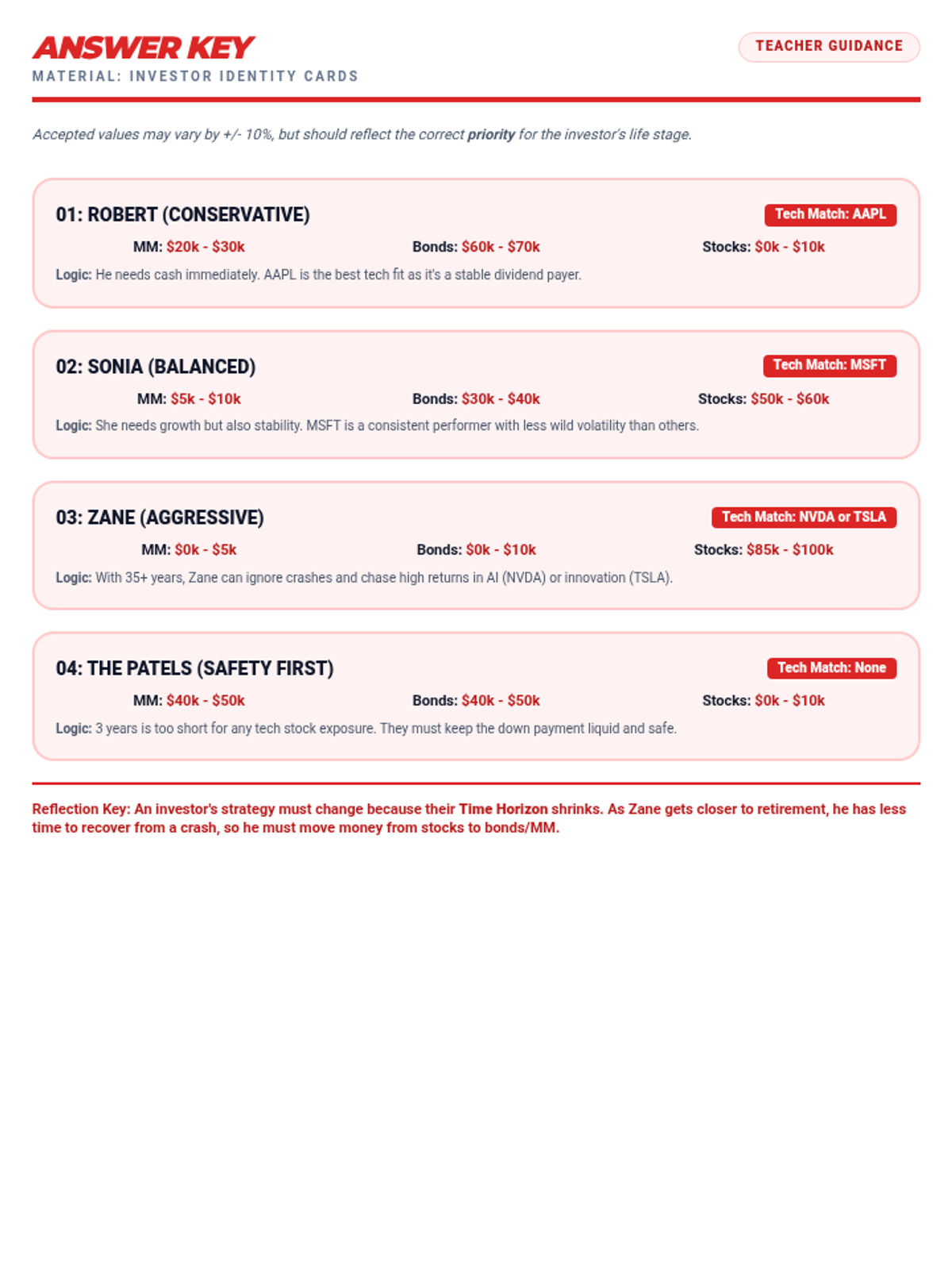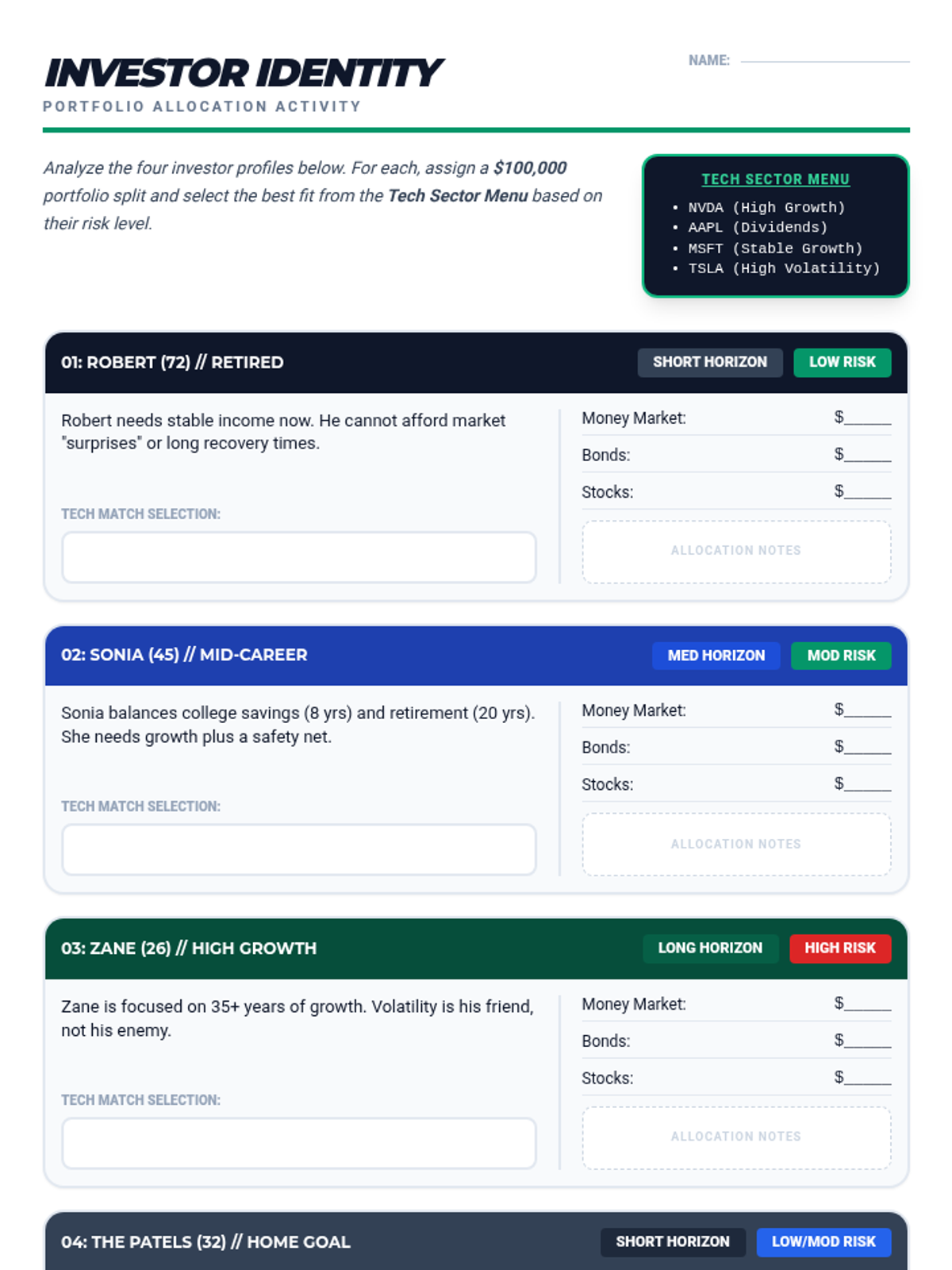 An introductory lesson on the fundamental building blocks of investing, covering stocks, bonds, and money market accounts with a focus on risk vs. return and diversification.