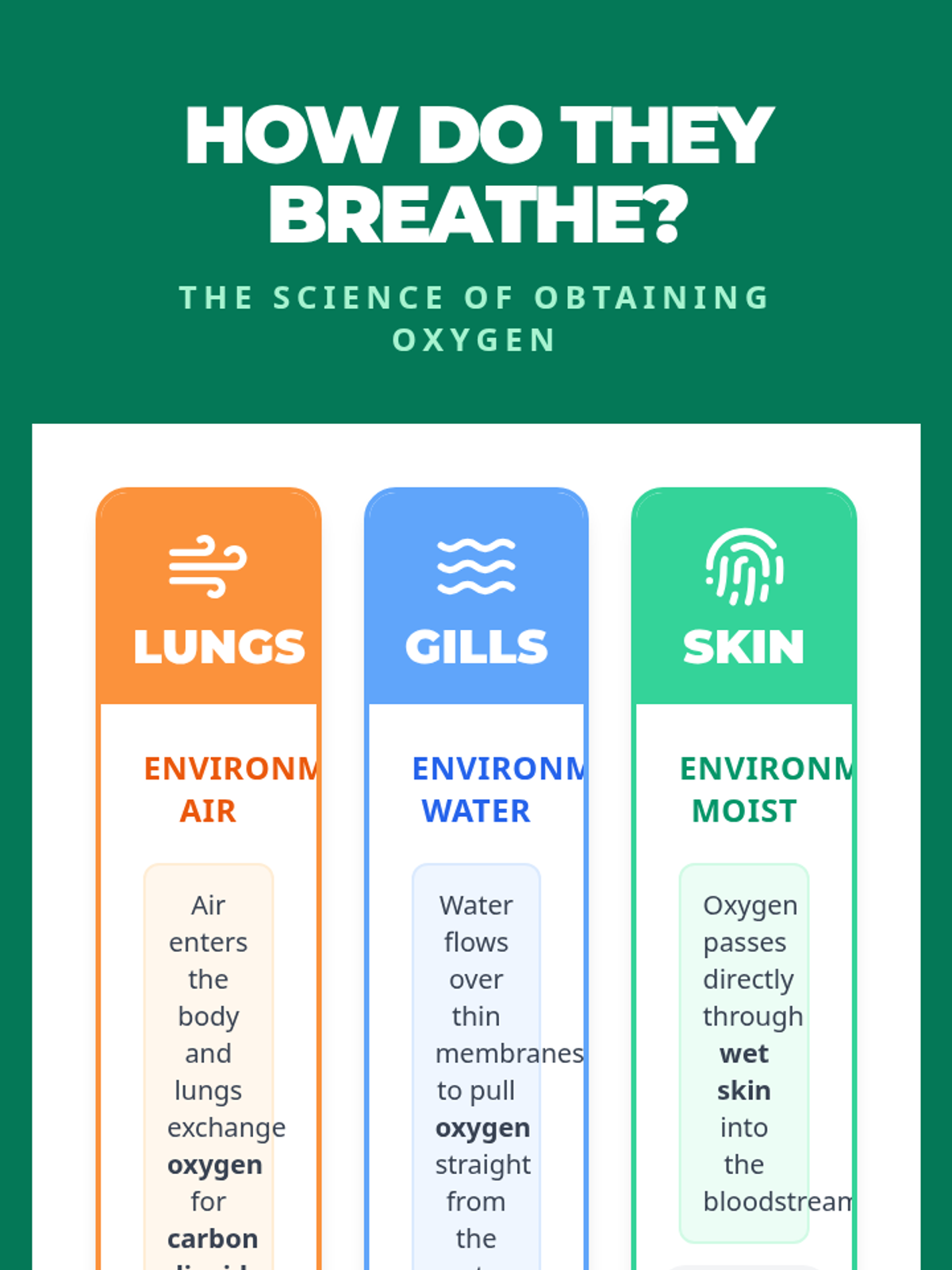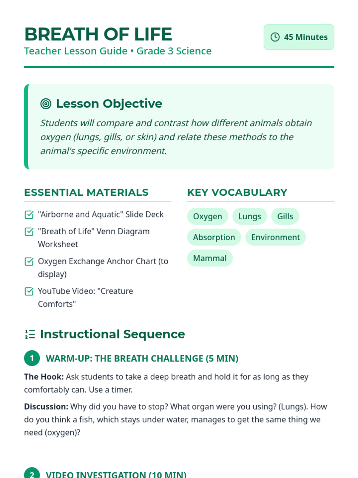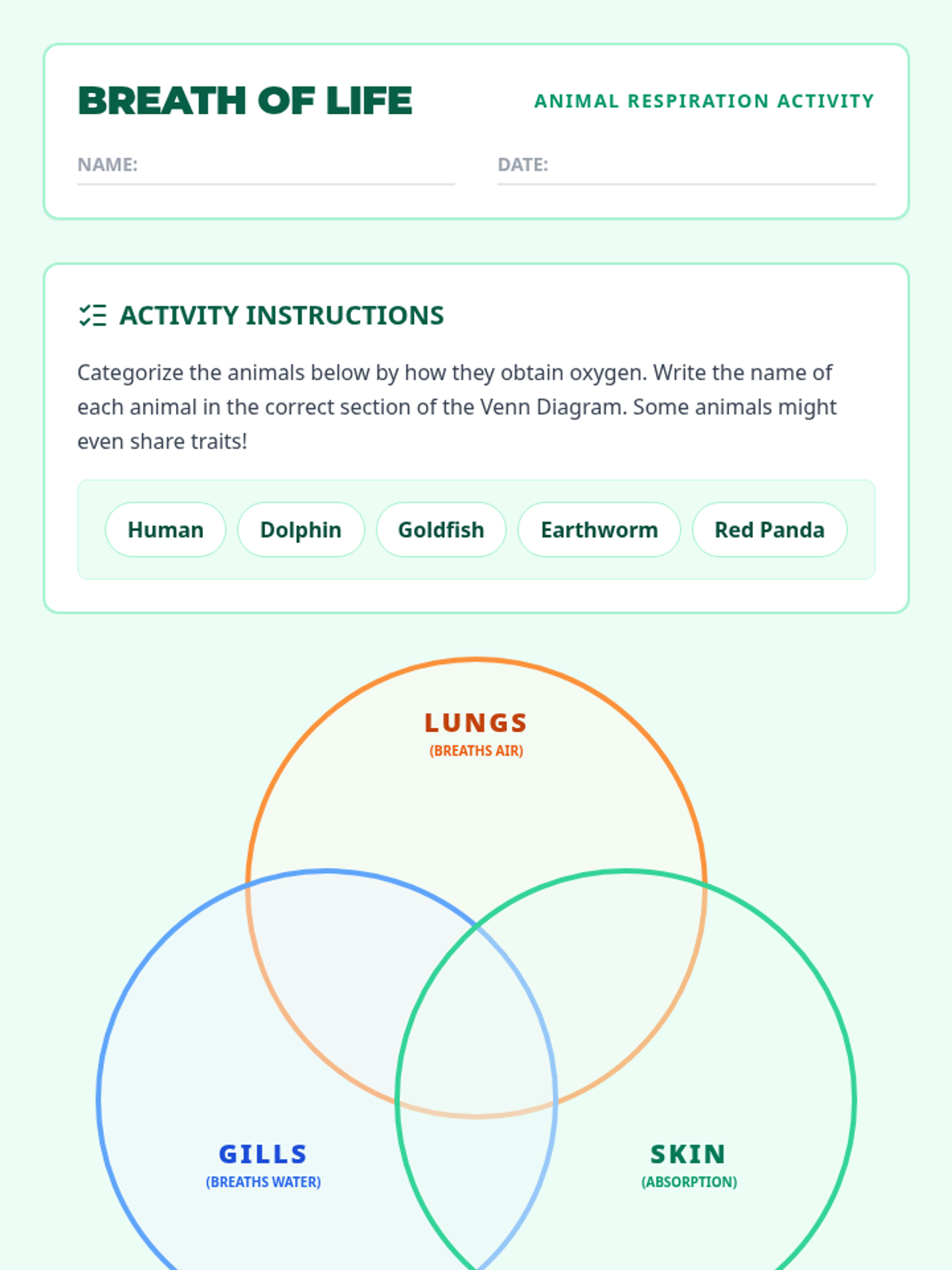 A 3rd-grade science lesson focused on how different animals obtain oxygen through lungs, gills, and skin, featuring a 3-way Venn diagram activity.