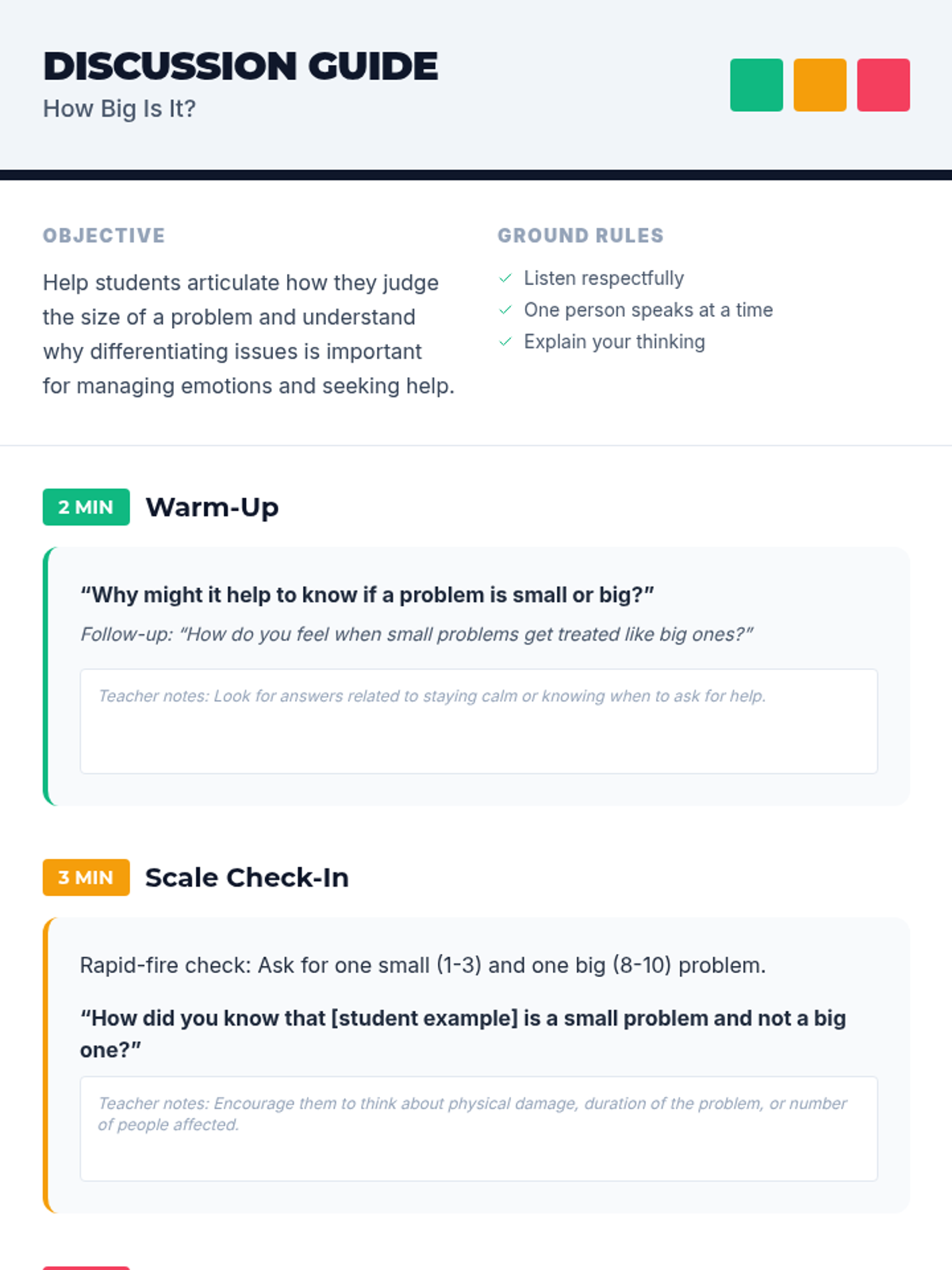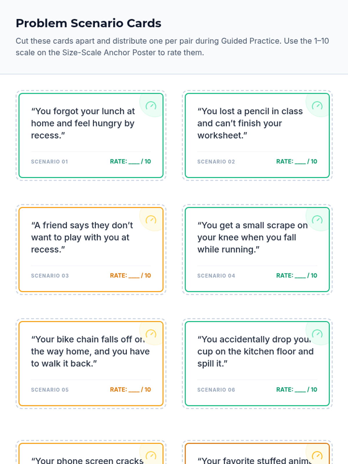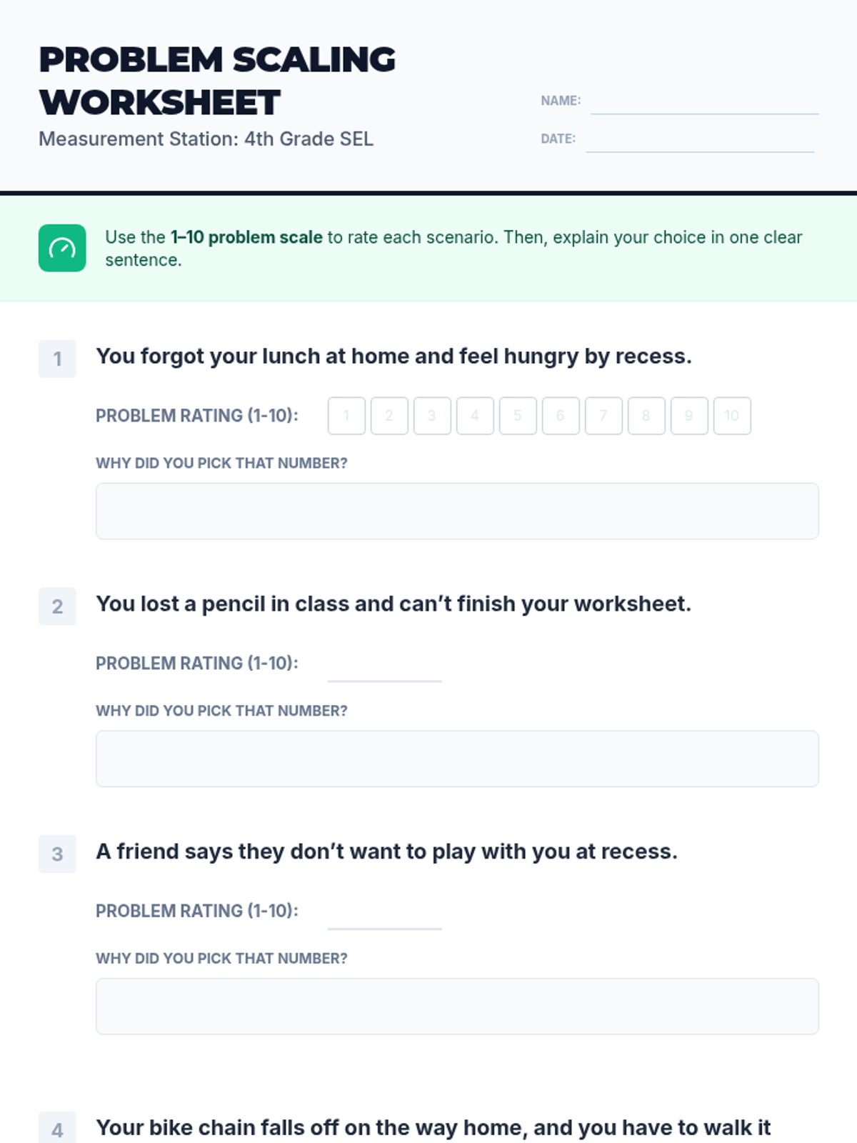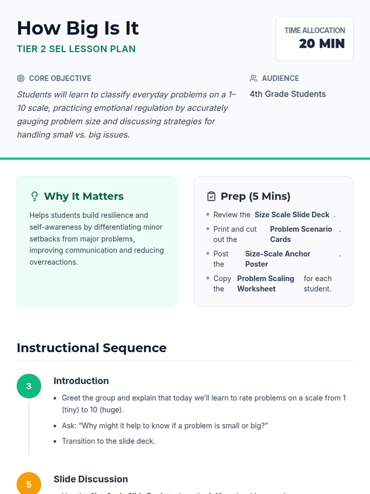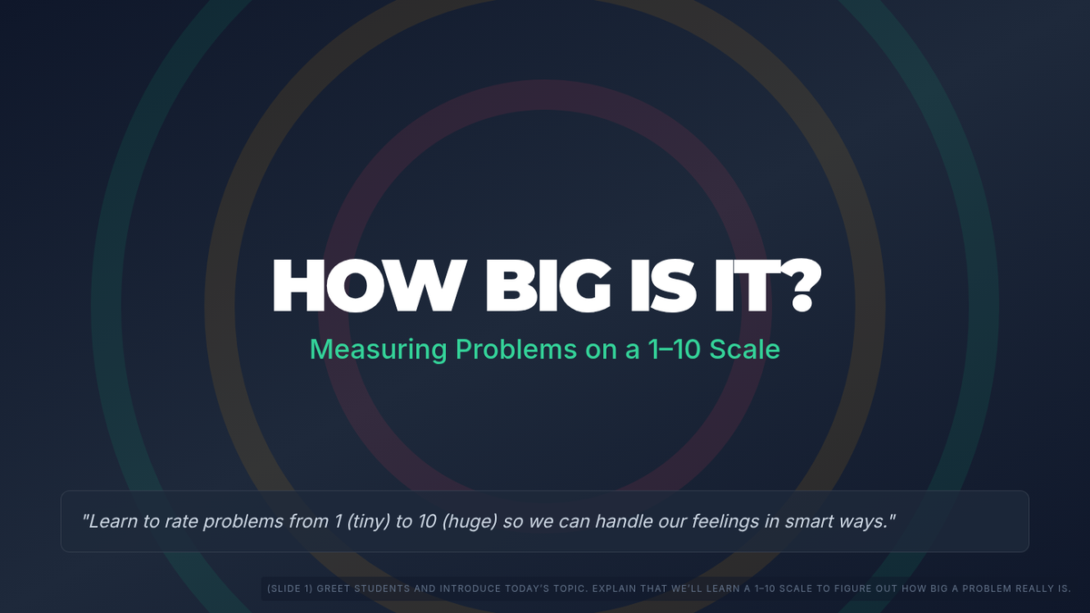 A 20-minute Tier 2 SEL lesson for 4th graders on using a 1–10 scale to gauge the size and impact of everyday problems, fostering emotional regulation and resilience.