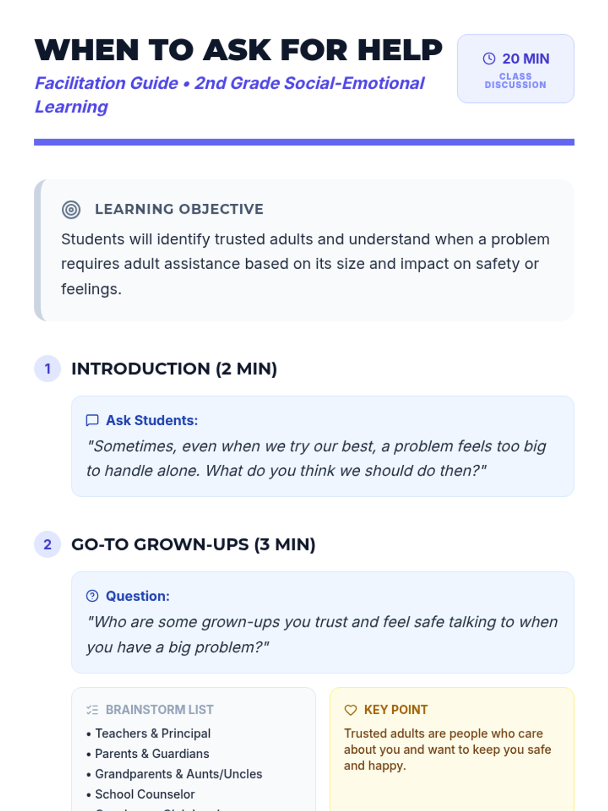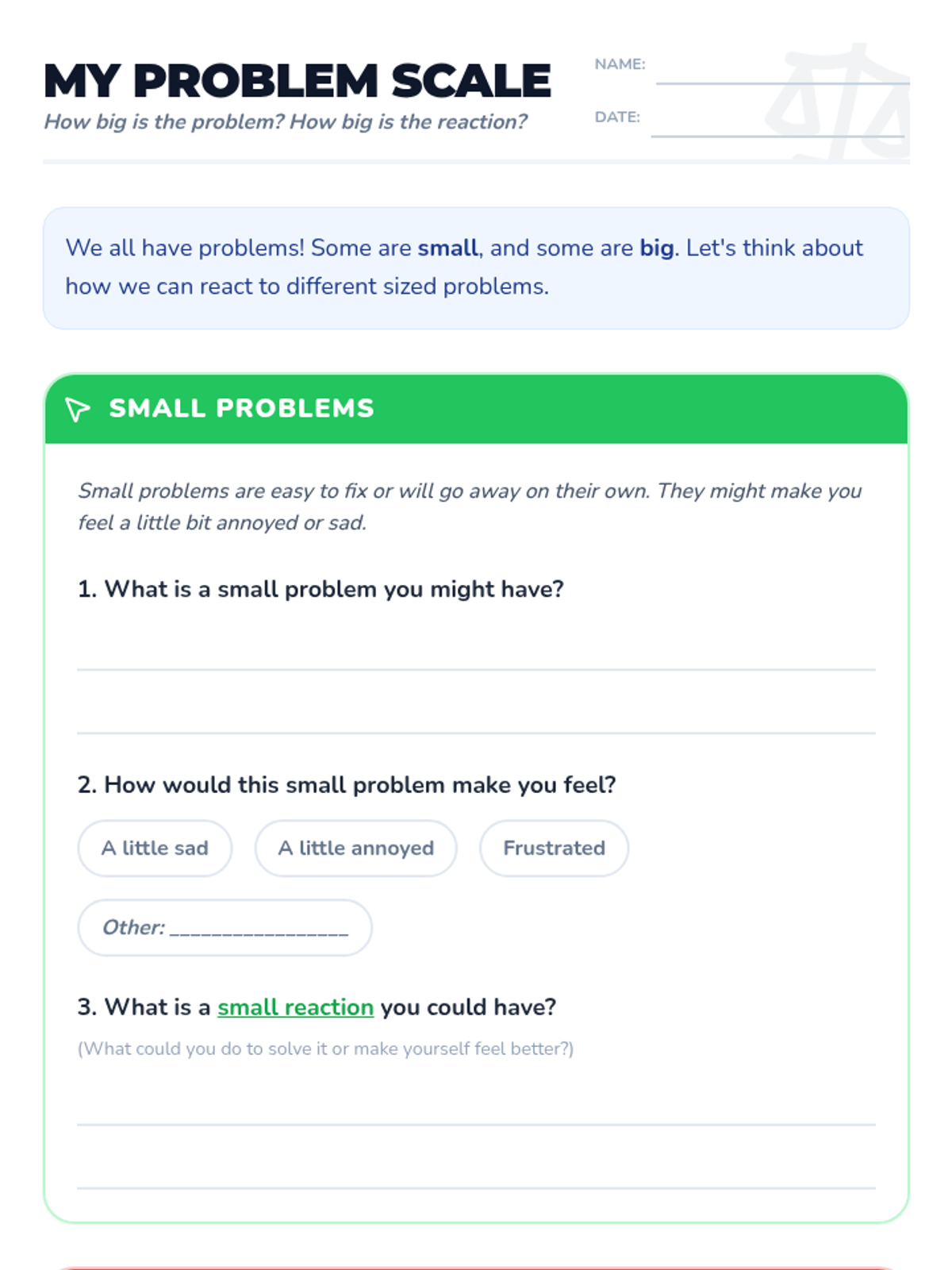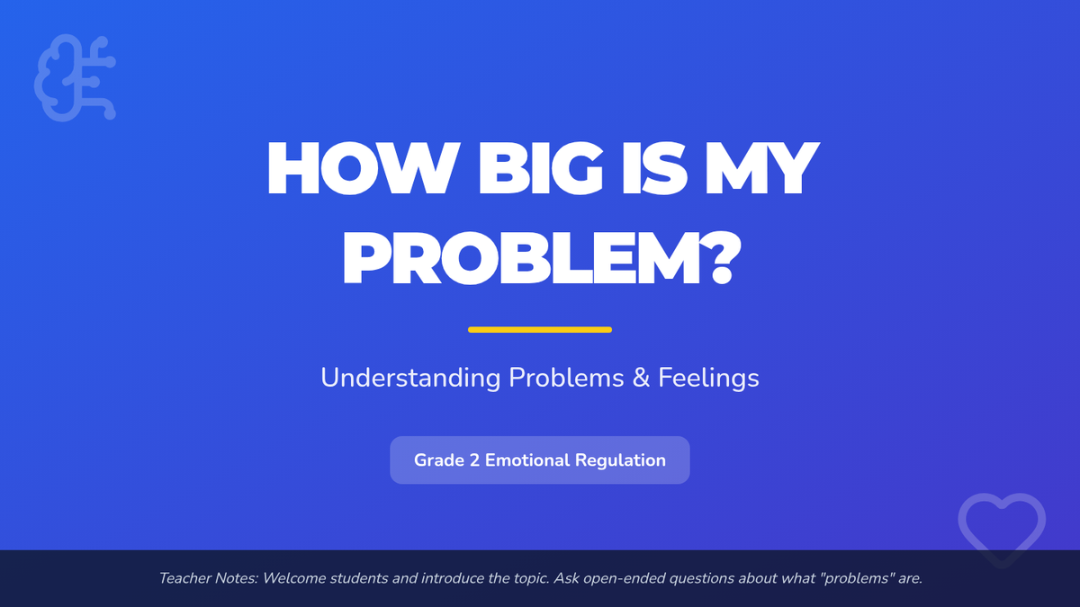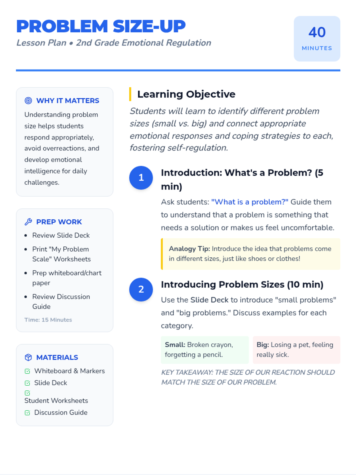 A 40-minute lesson for 2nd-grade students on identifying problem sizes (small vs. big) and matching their emotional reactions and coping strategies accordingly.