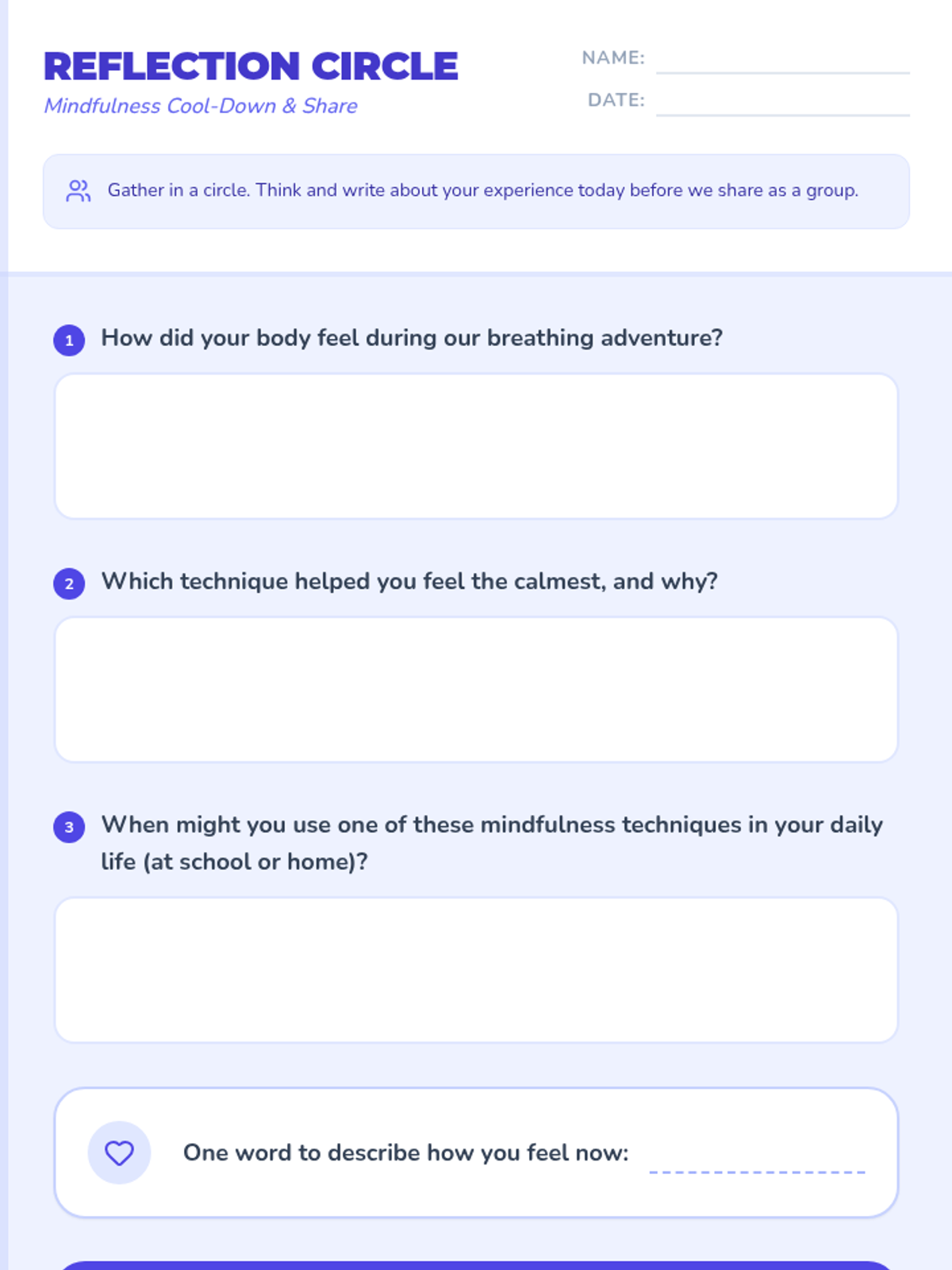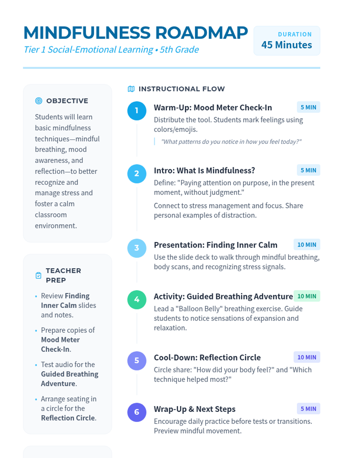 A 45-minute introductory mindfulness session for 5th graders to recognize stress signals and practice calming techniques like deep breathing and body scans.