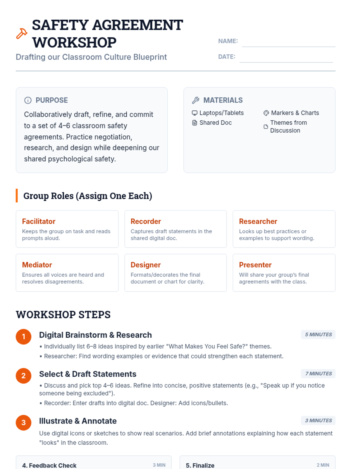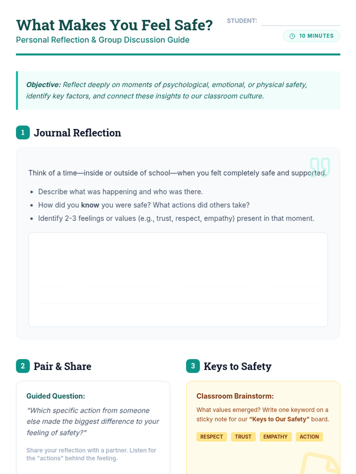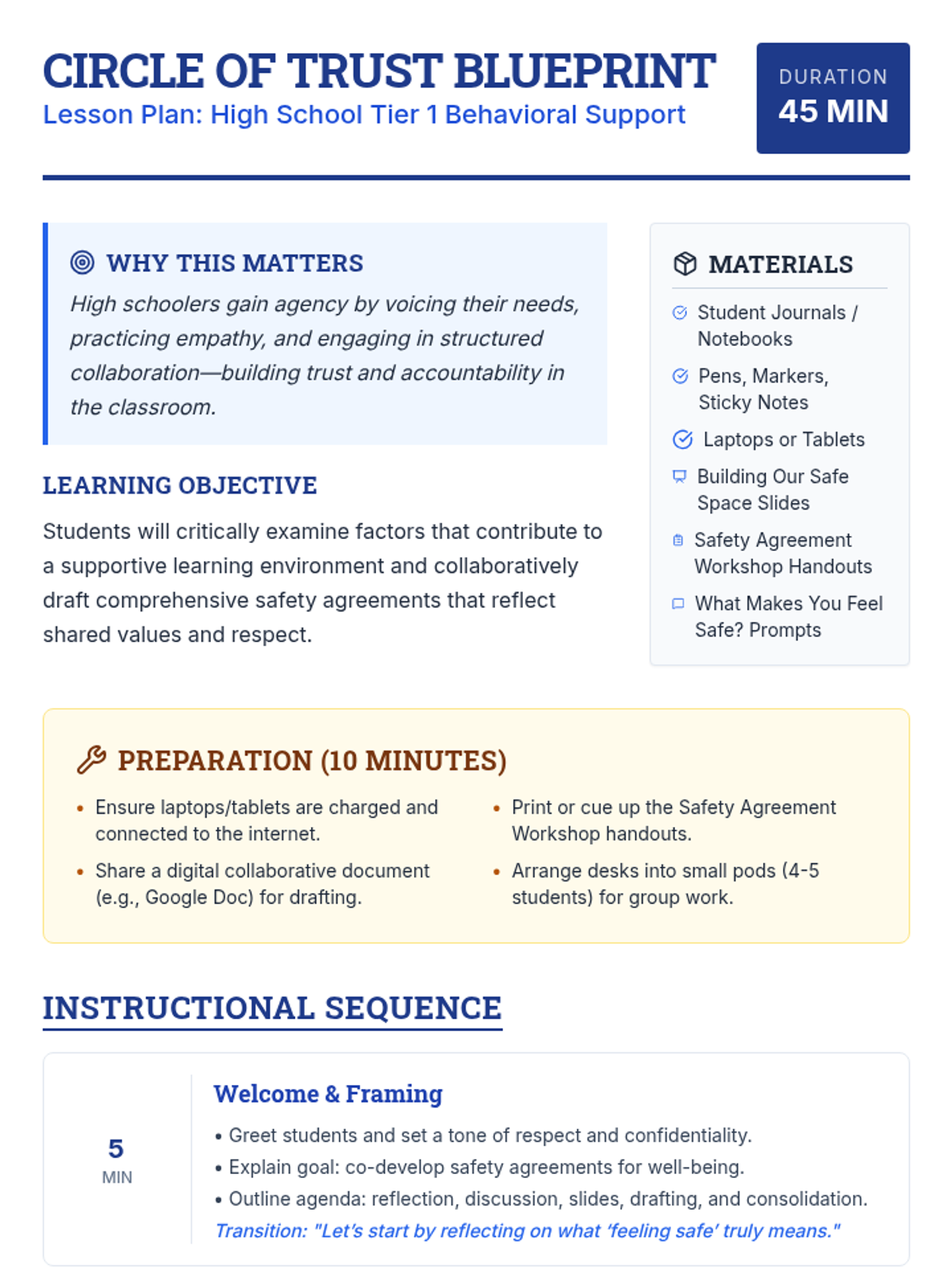 In this 45-minute Tier 1 behavioral supports lesson for high schoolers, students collaborate to co-create shared safety agreements that foster an inclusive and respectful environment. This lesson empowers teens to voice their needs, build mutual understanding, and uphold a positive classroom culture.
