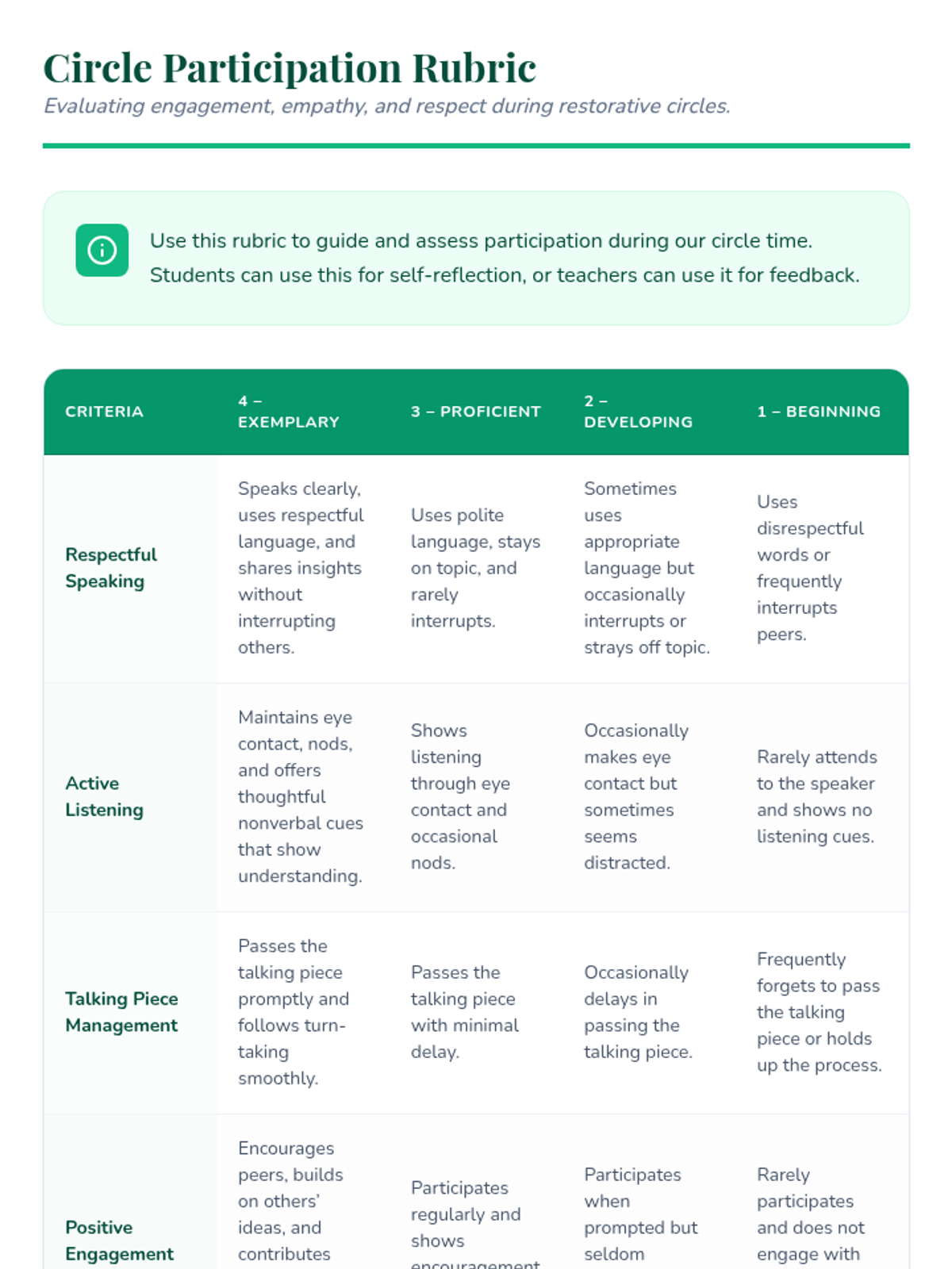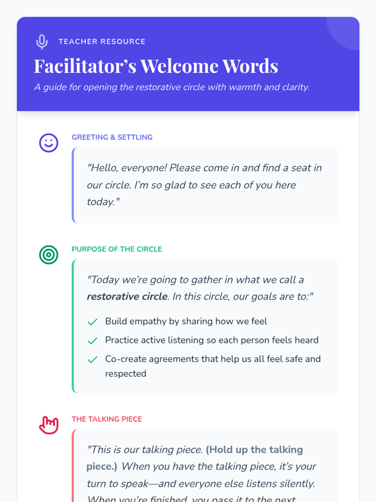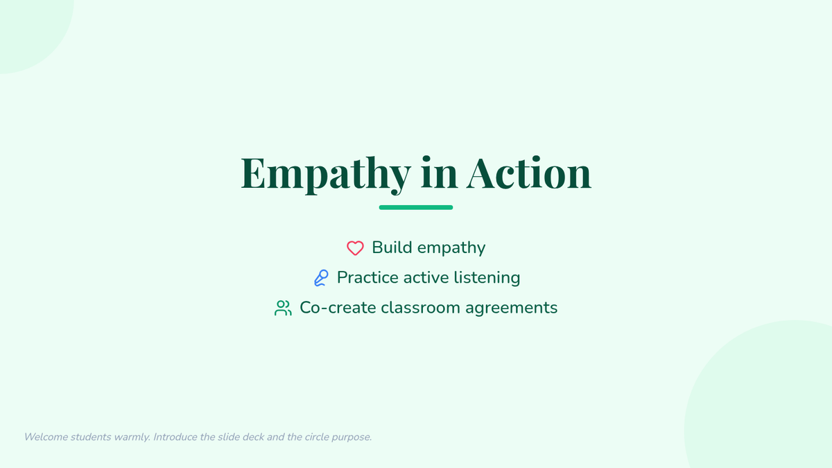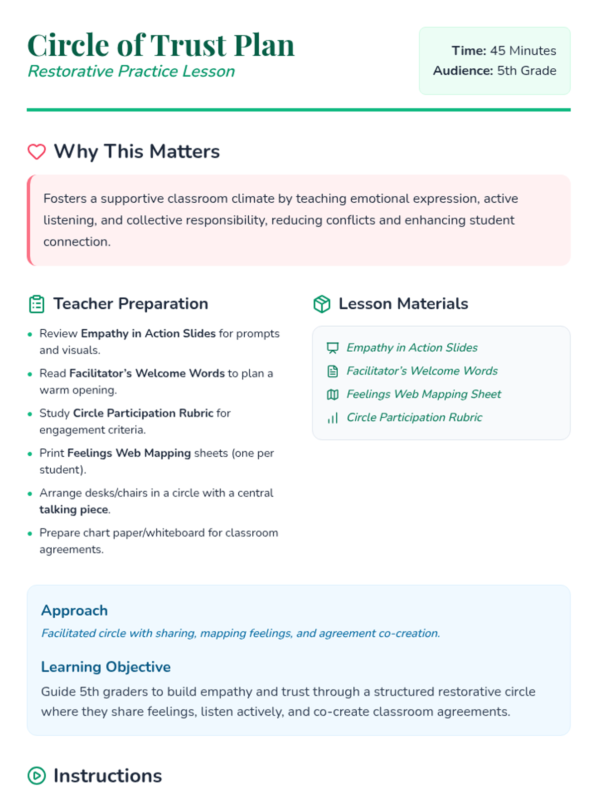 A 45-minute restorative circle lesson for 5th graders to build empathy, trust, and co-create a positive classroom climate through sharing feelings and collaborative agreements.