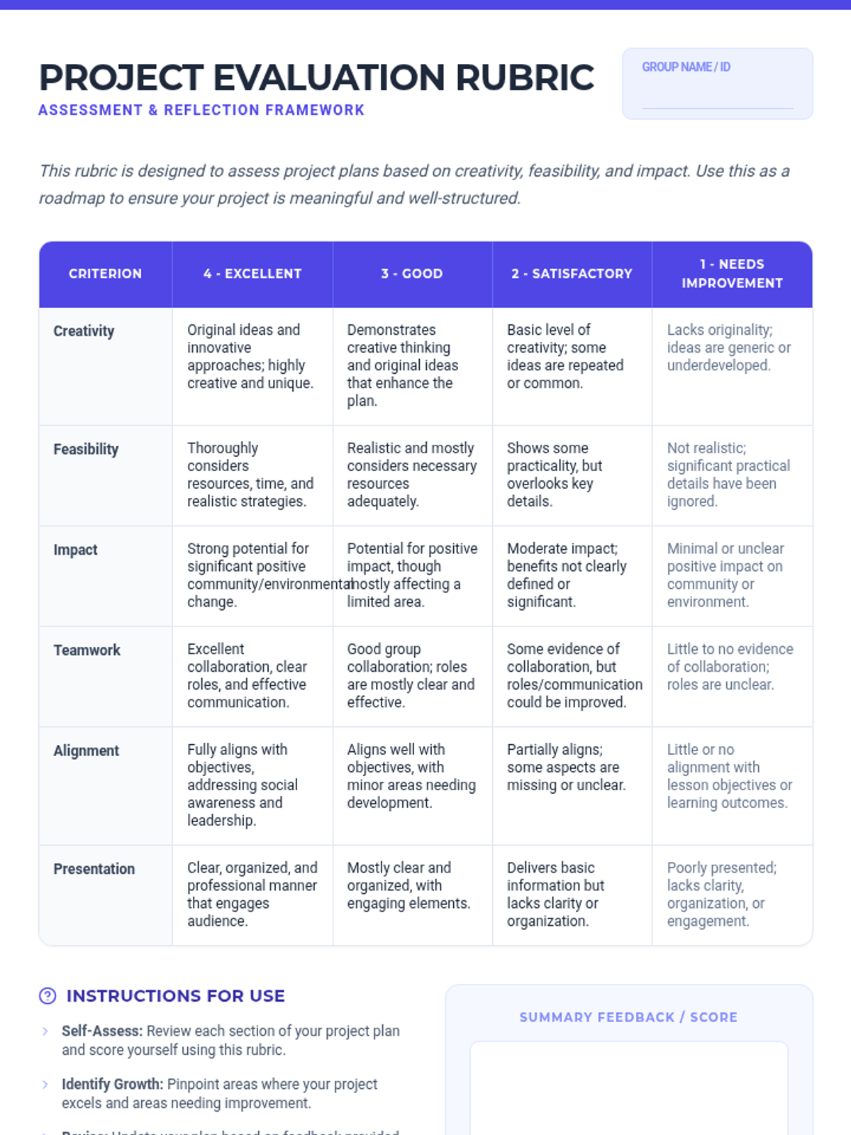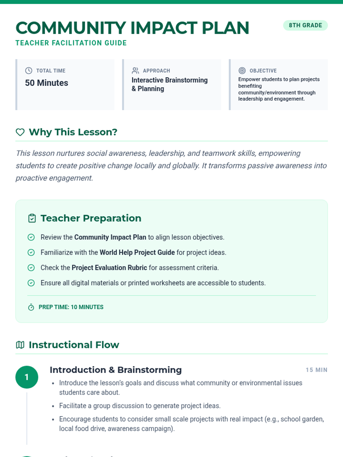 A lesson where 8th-grade students brainstorm and plan small group projects to make a positive impact on their community or the environment, fostering leadership and social awareness.