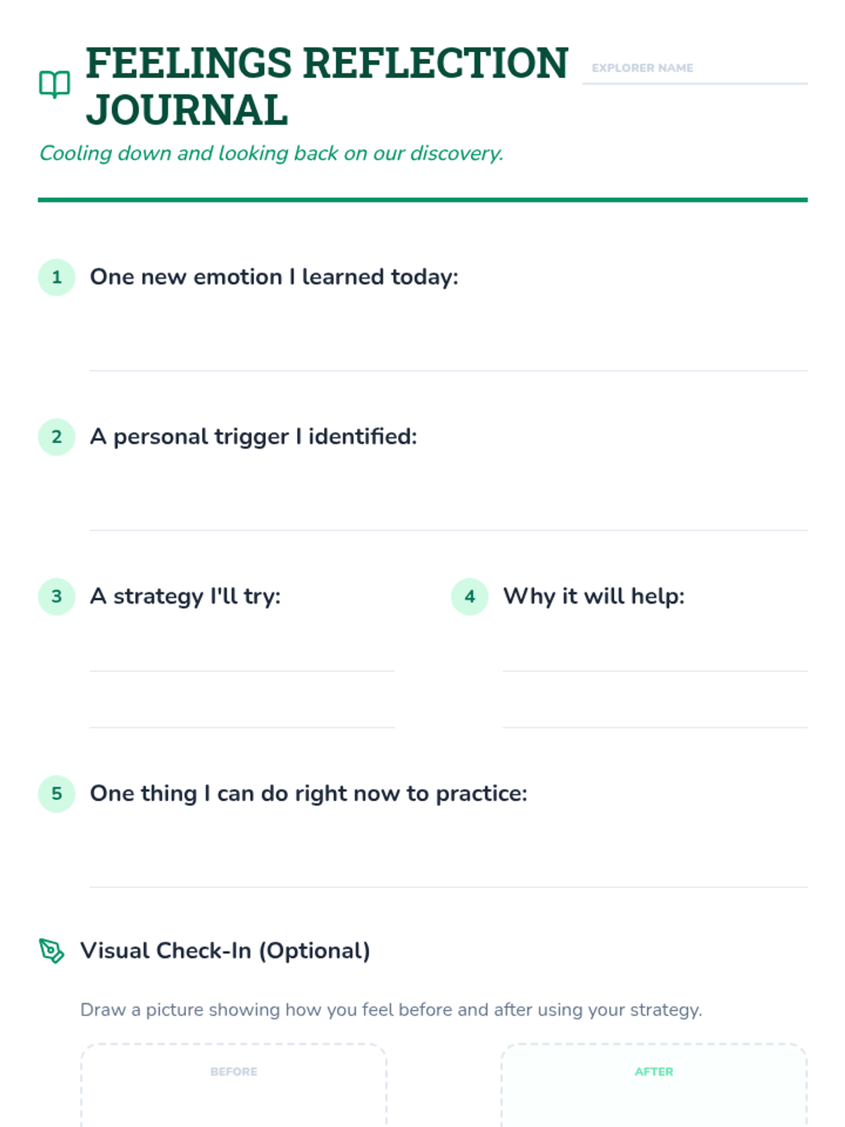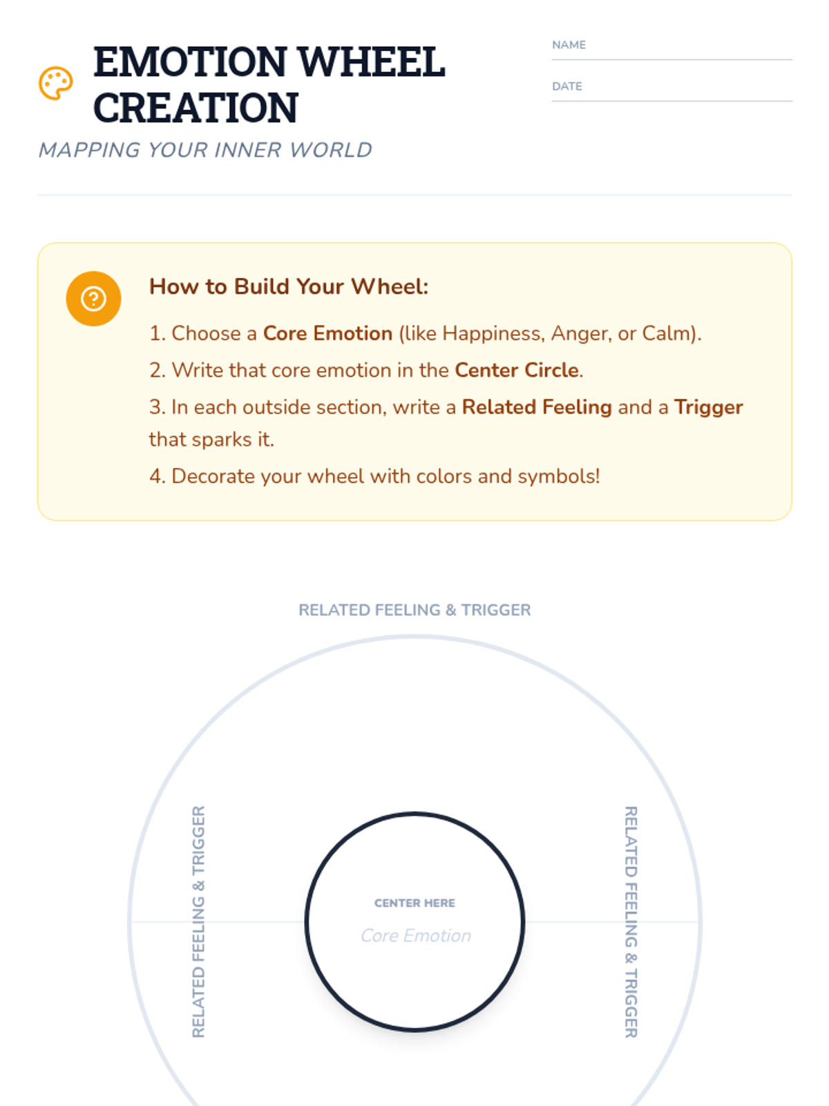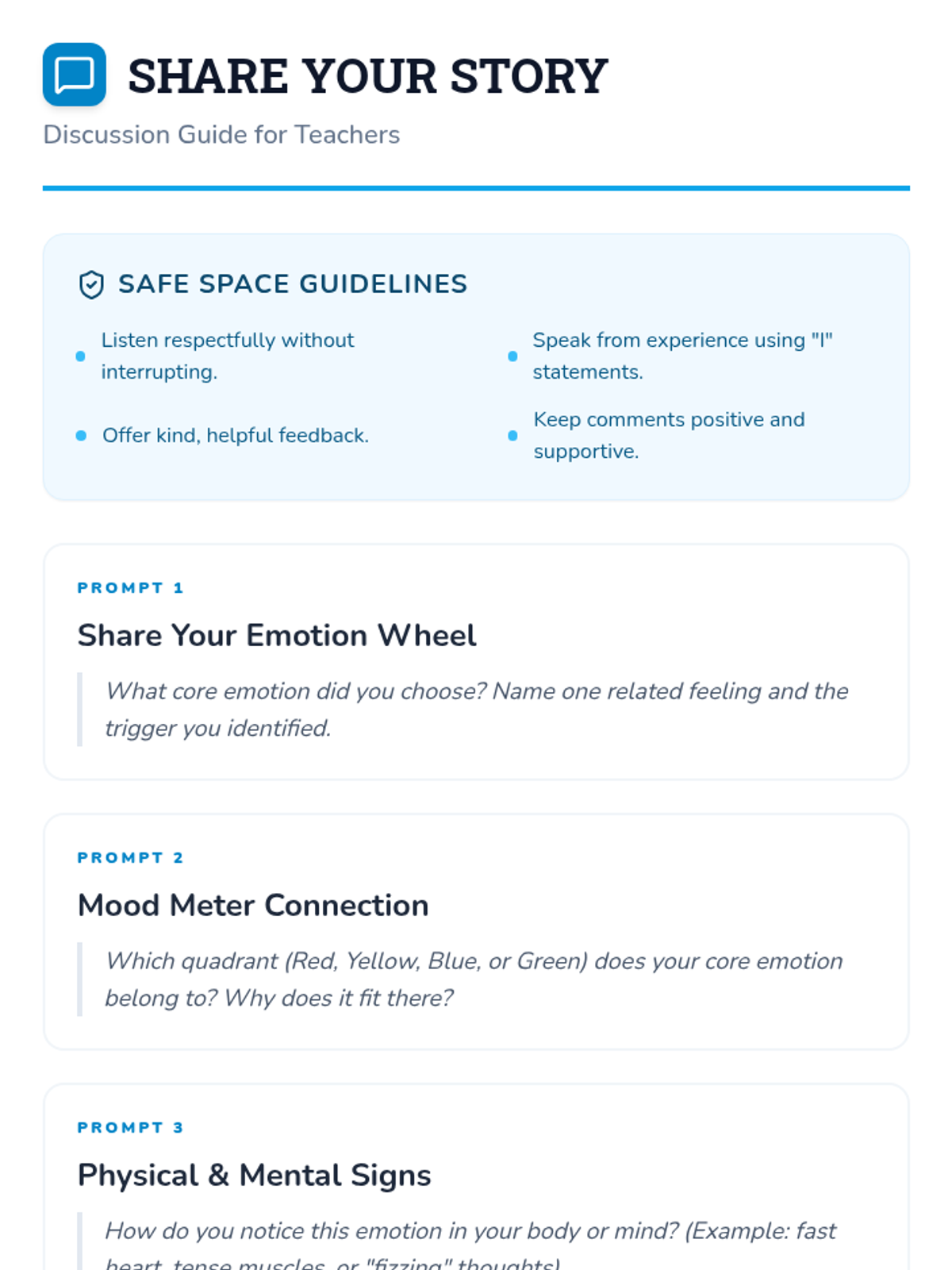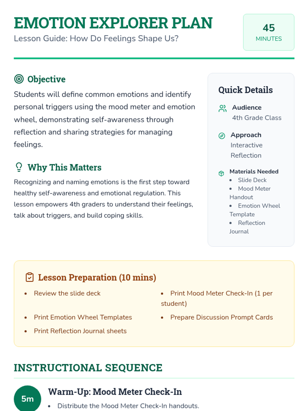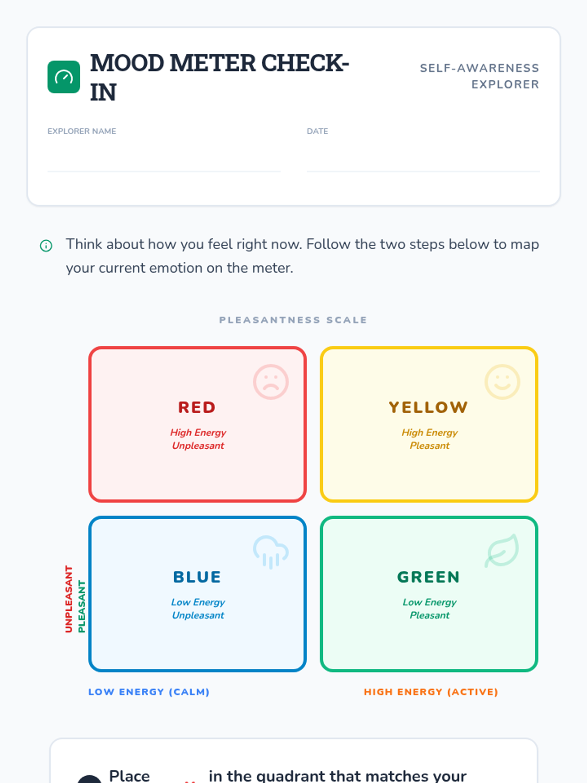 An engaging 45-minute social-emotional learning lesson for 4th graders focusing on self-awareness. Students explore the Mood Meter, identify personal triggers, and create emotion wheels to better understand and manage their feelings.