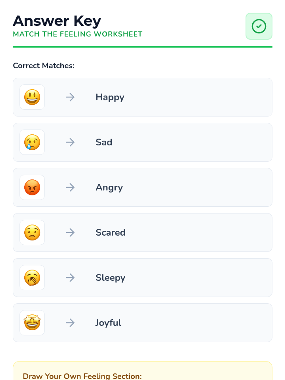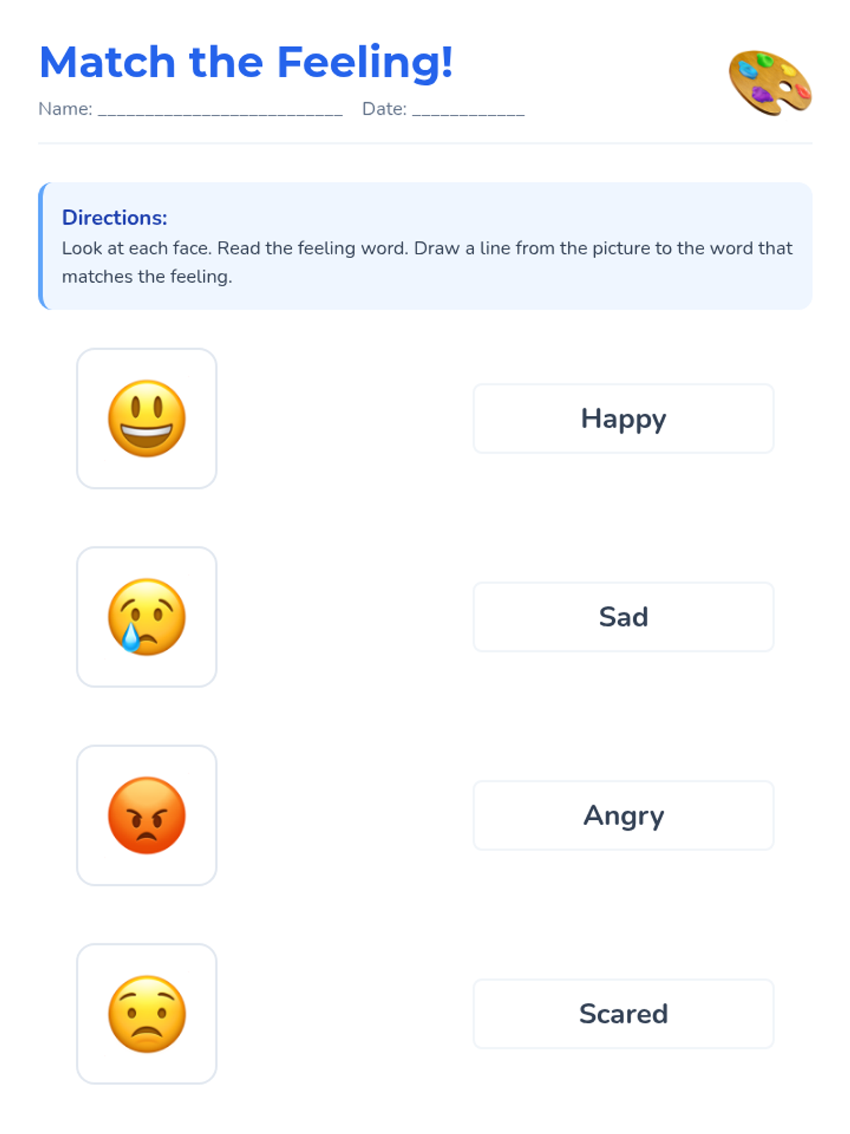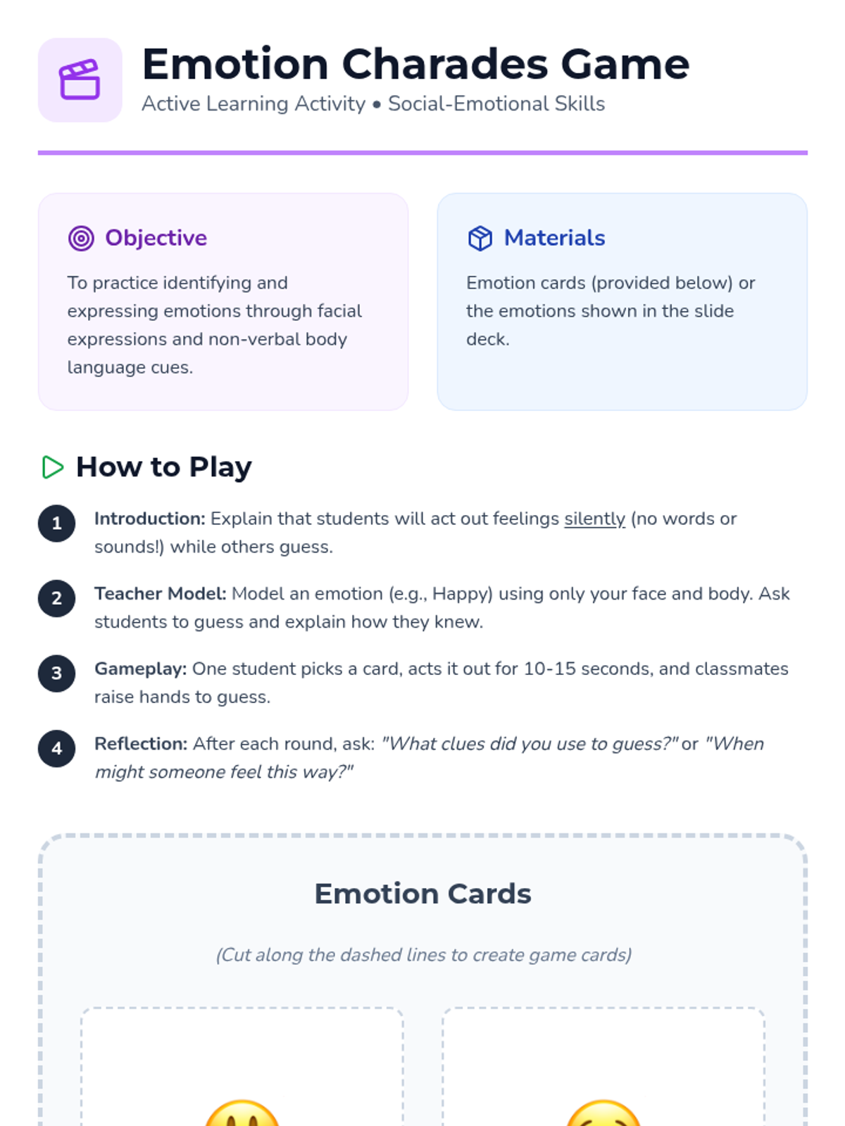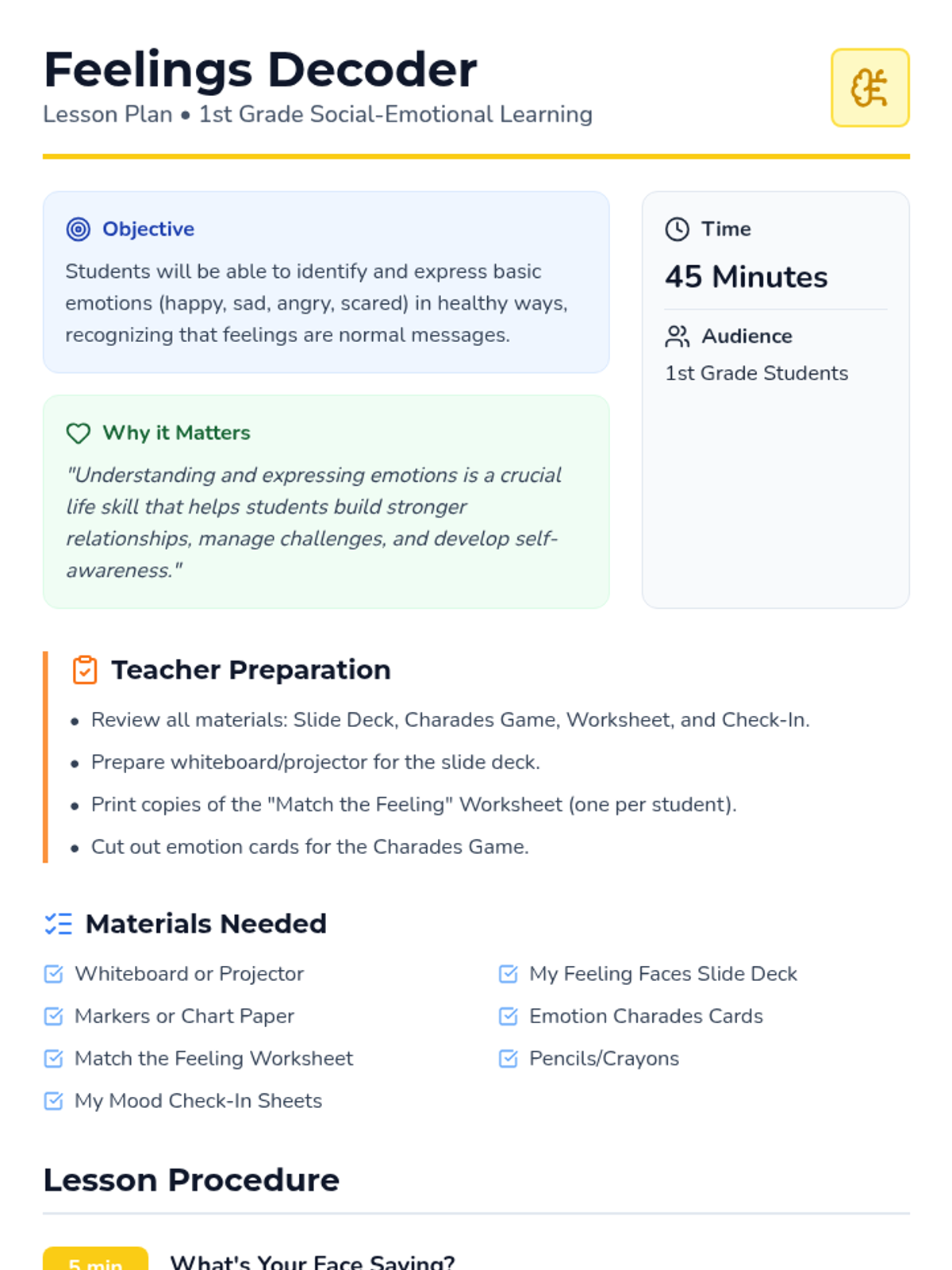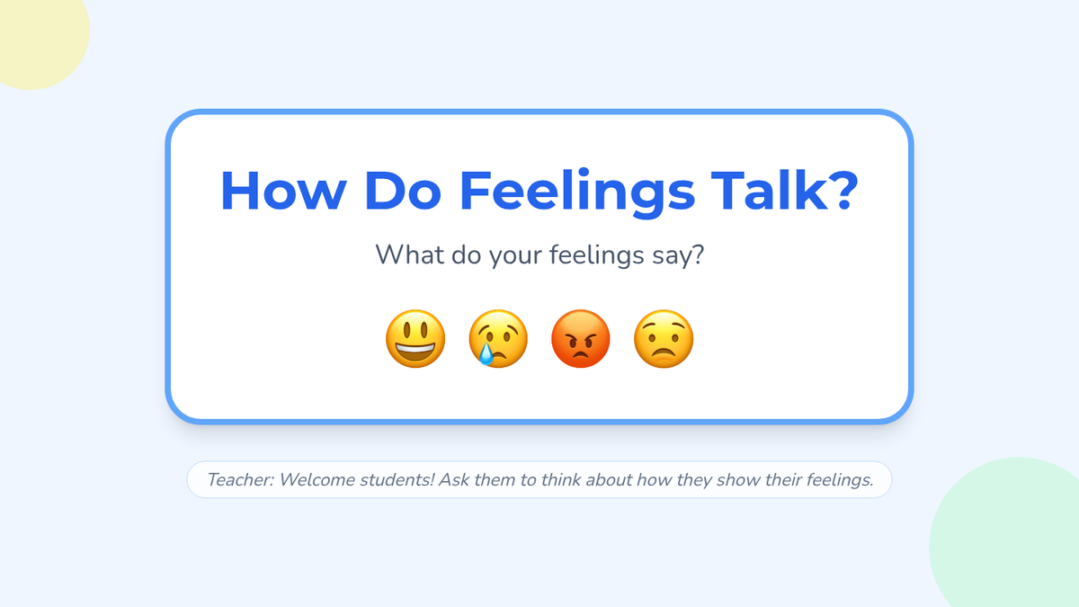 A 1st-grade lesson helping students identify and express basic emotions (happy, sad, angry, scared) using visual cues, charades, and reflection activities.