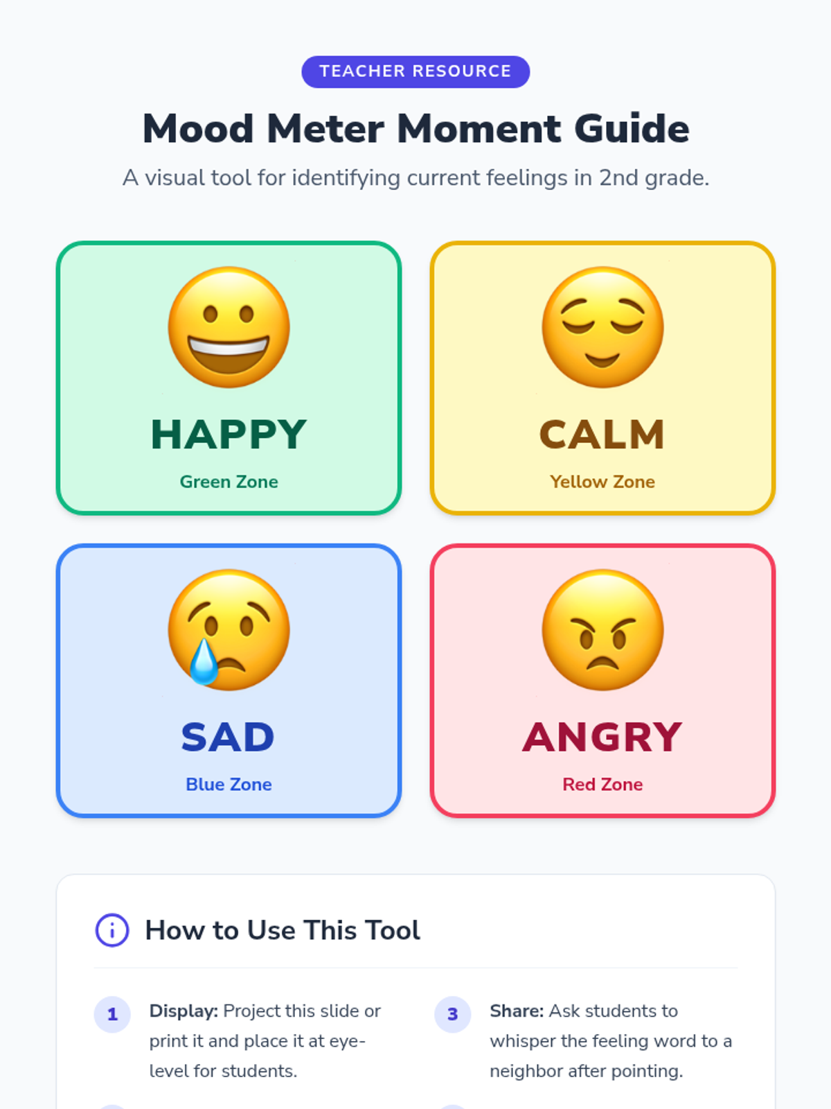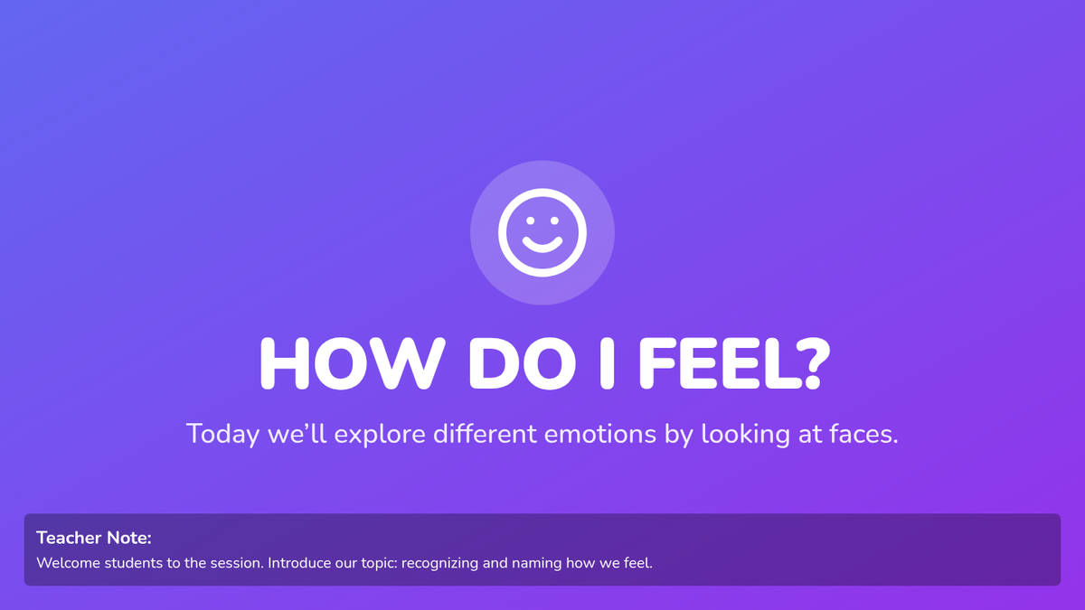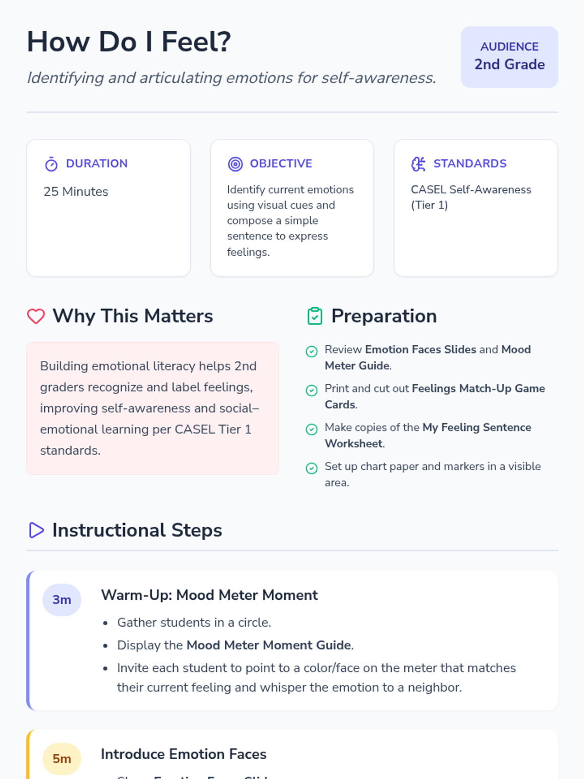 A 25-minute SEL lesson for 2nd graders focused on identifying and naming emotions through visual cues, interactive play, and reflective writing. Students will explore 6 core emotions and practice articulating their feelings using a mood meter and sentence frames.