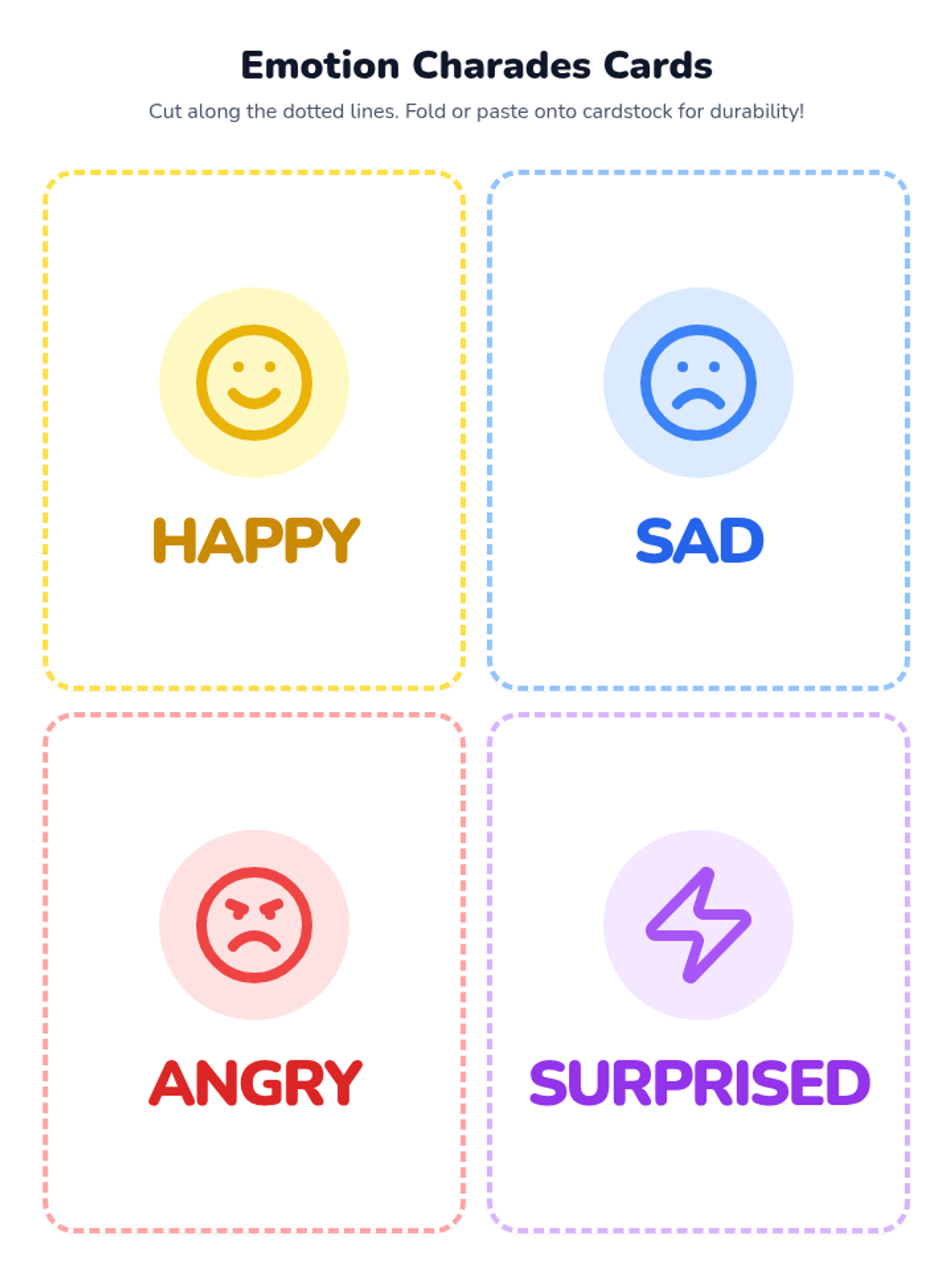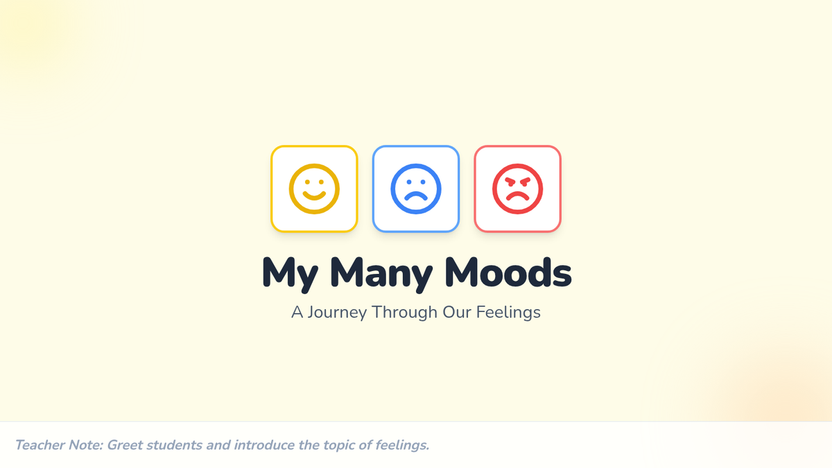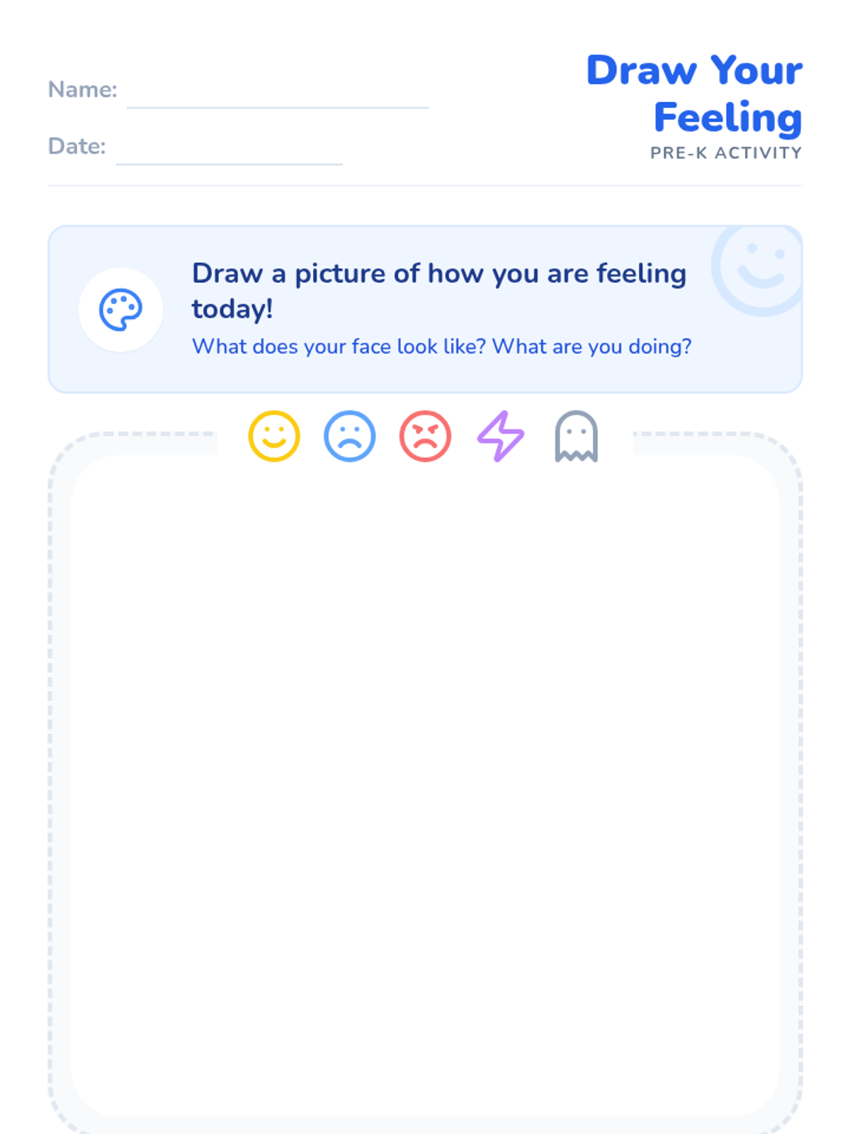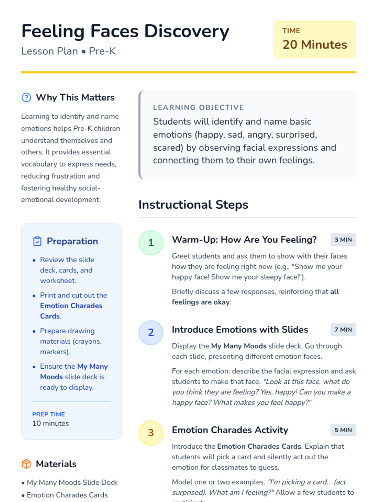 This lesson helps Pre-K students identify and name basic emotions (happy, sad, angry, surprised, scared) through interactive discussion, a slide presentation, charades, and a drawing activity. It provides foundational emotional vocabulary to support self-regulation and communication.