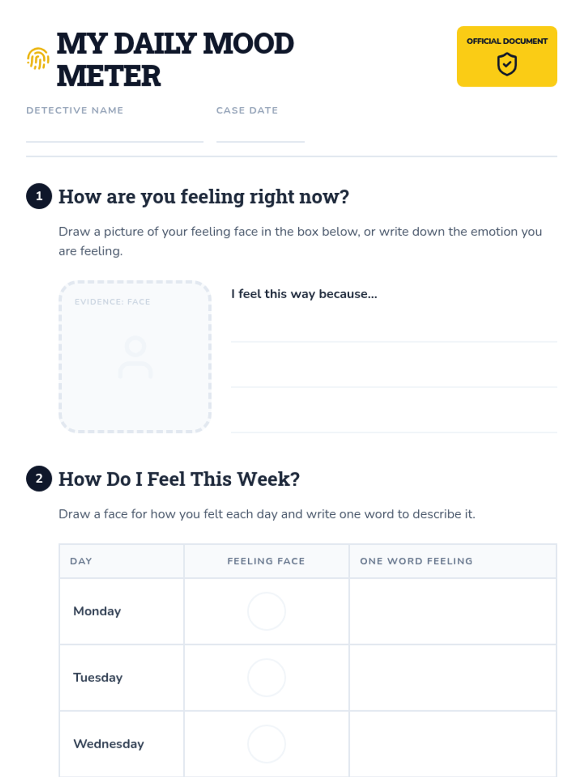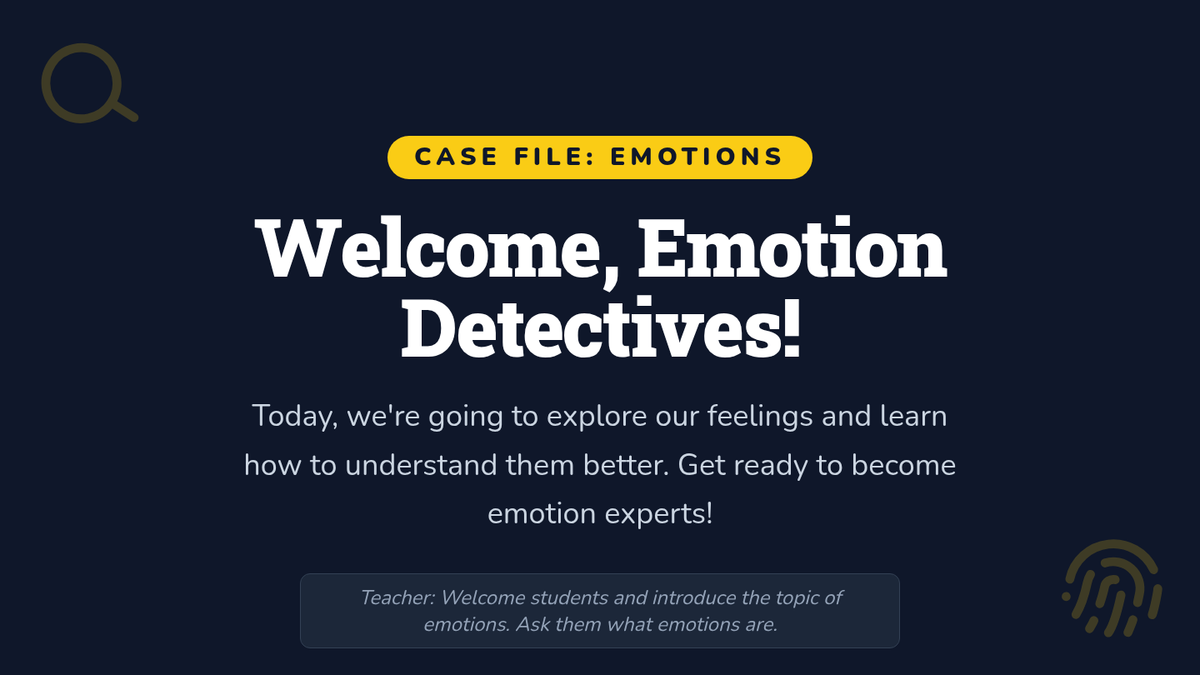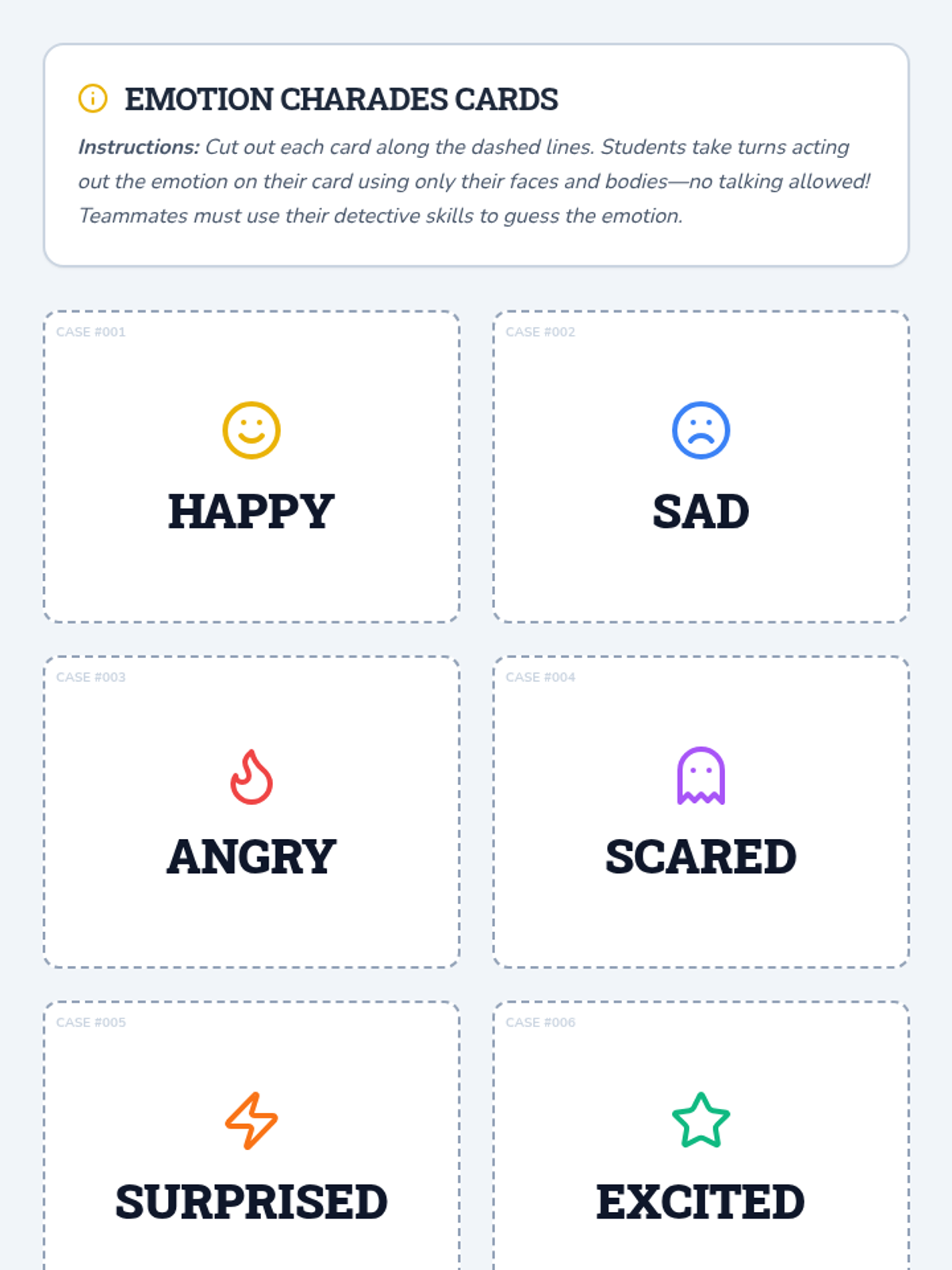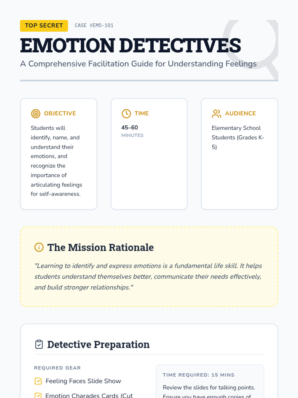 A lesson focused on helping elementary students identify, name, and understand their emotions through interactive discussion, a slide presentation, charades, and a tracking worksheet.