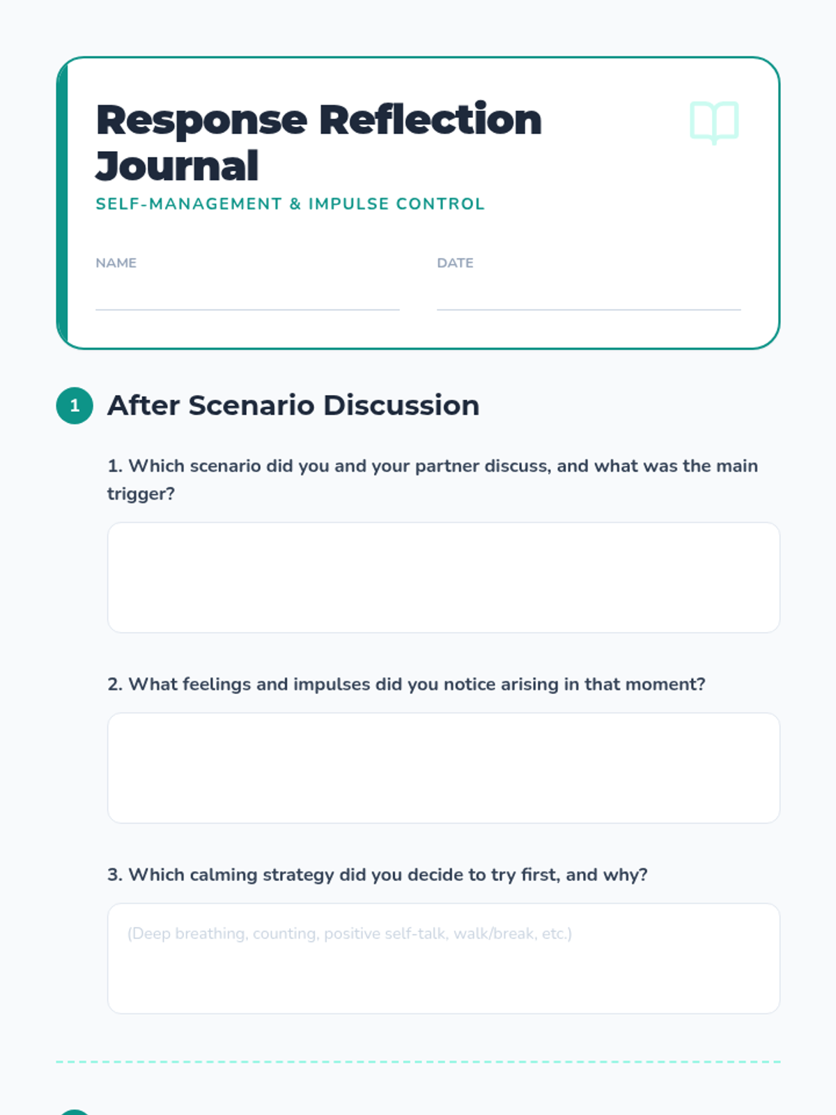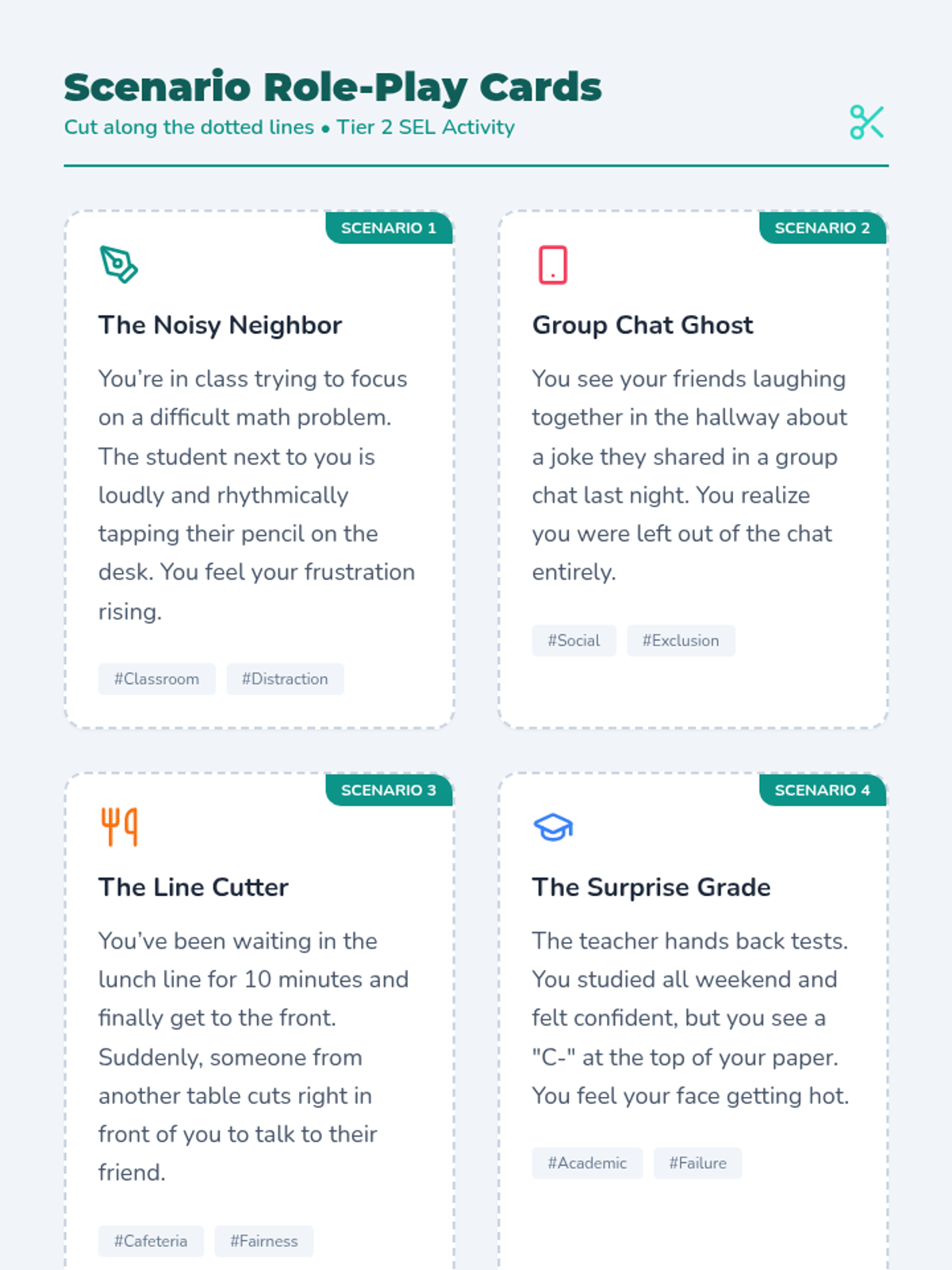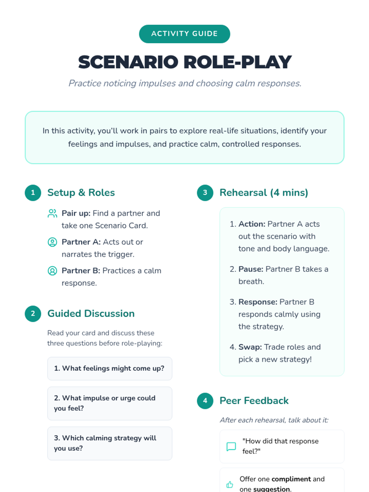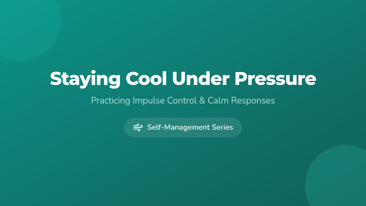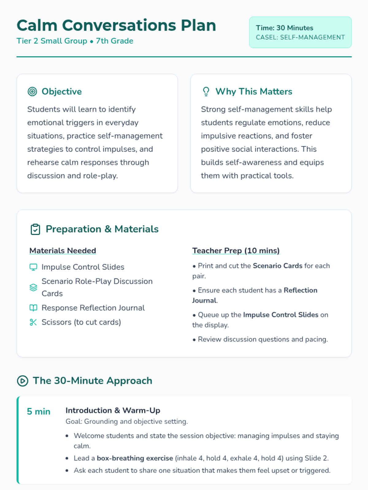 A 30-minute Tier 2 small-group session for 7th graders focused on impulse control and emotion regulation. Students learn to identify triggers, practice box breathing, and rehearse calm responses through scenario-based role-play.