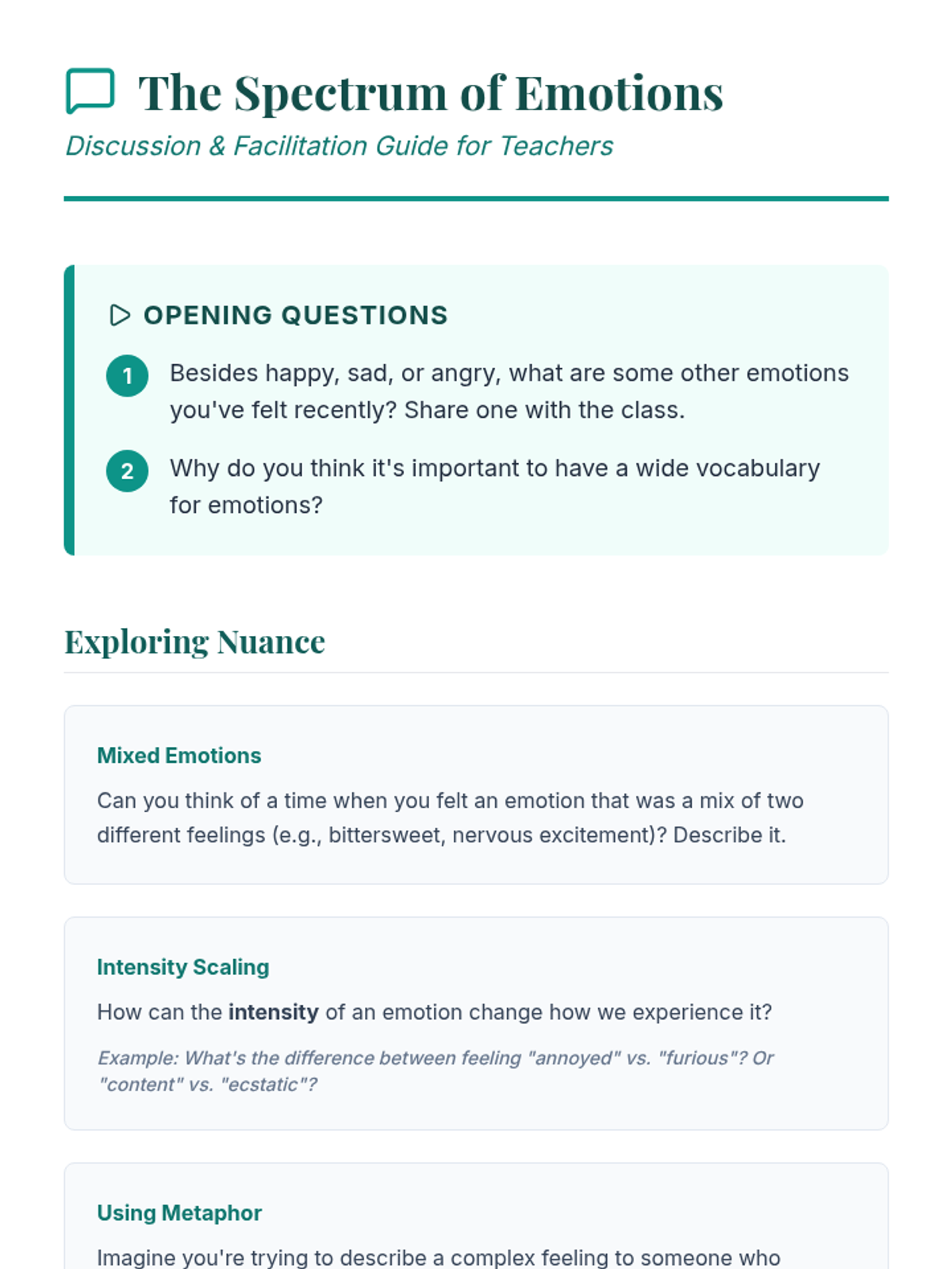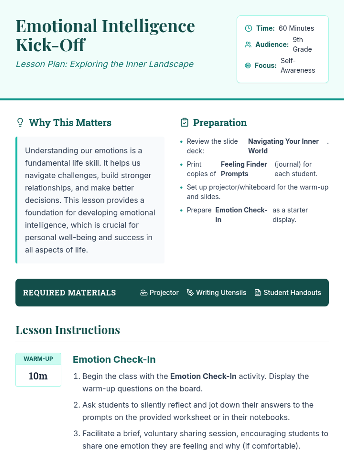 A 60-minute introductory lesson for 9th graders to explore the complexity of emotions, develop emotional vocabulary, and practice self-reflection through journaling and discussion.
