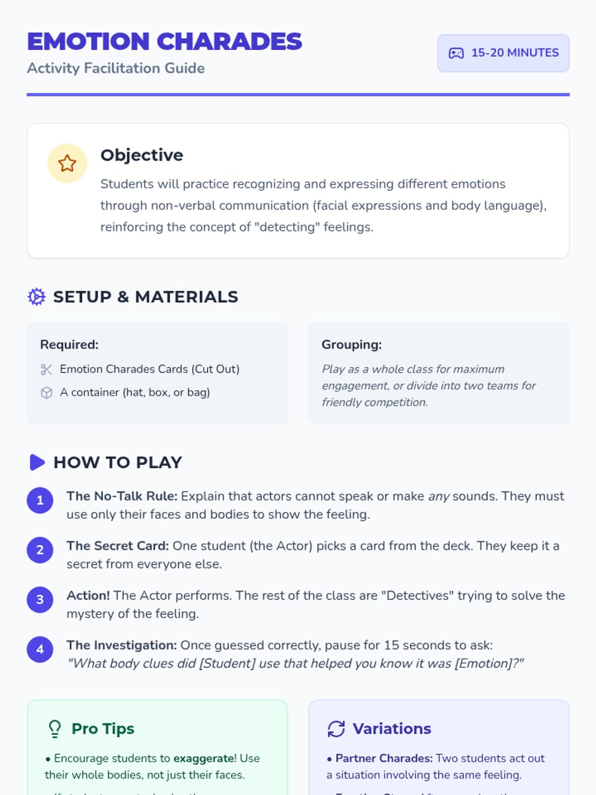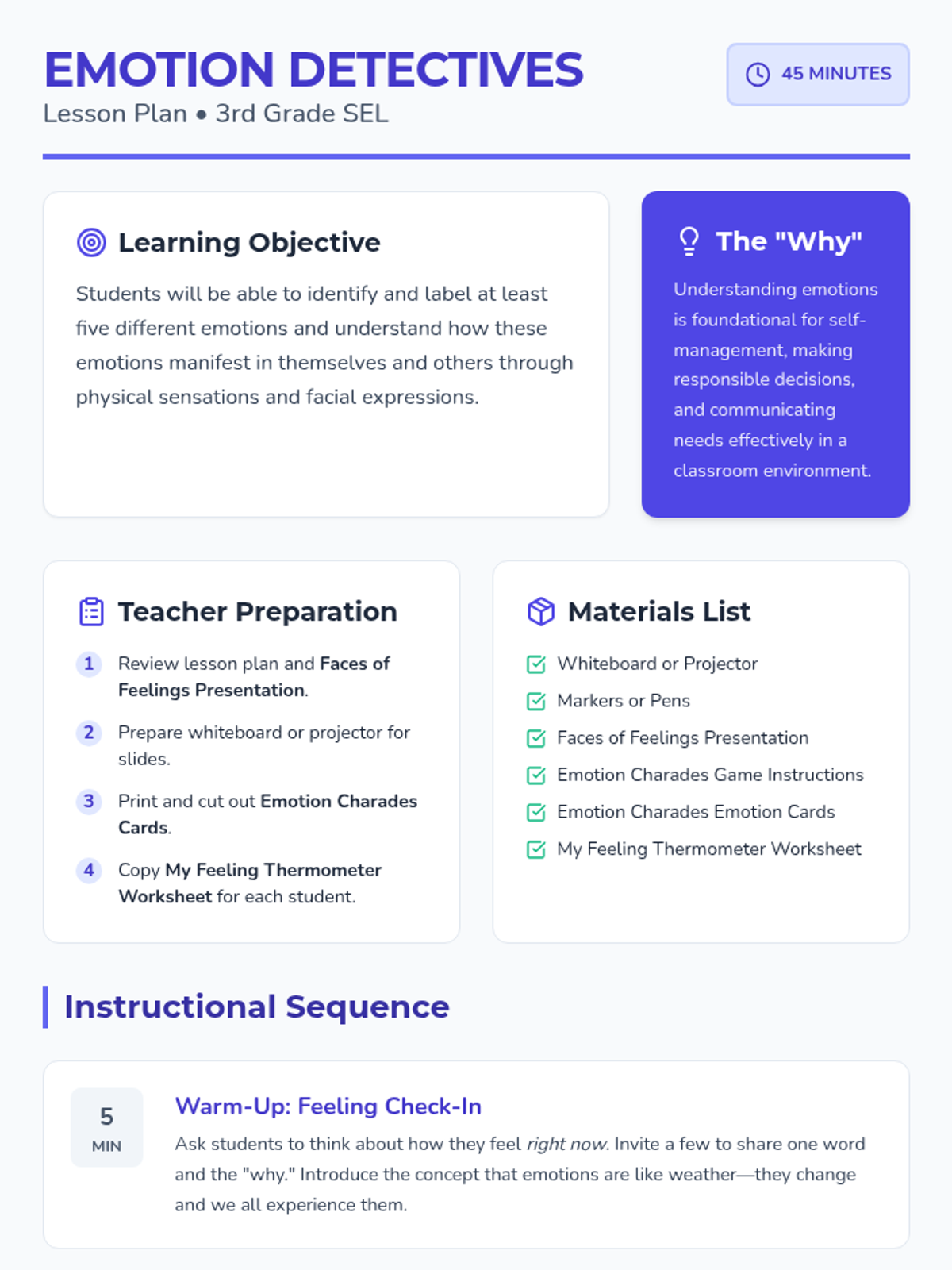A 45-minute social-emotional learning lesson for 3rd graders focused on identifying, labeling, and understanding the intensity of various emotions. Students use detective skills to recognize physical cues and facial expressions in themselves and others.