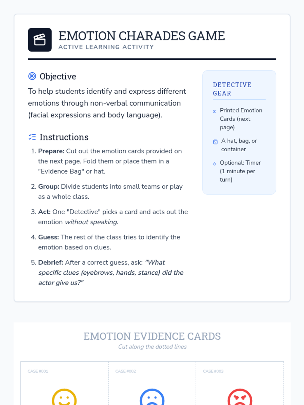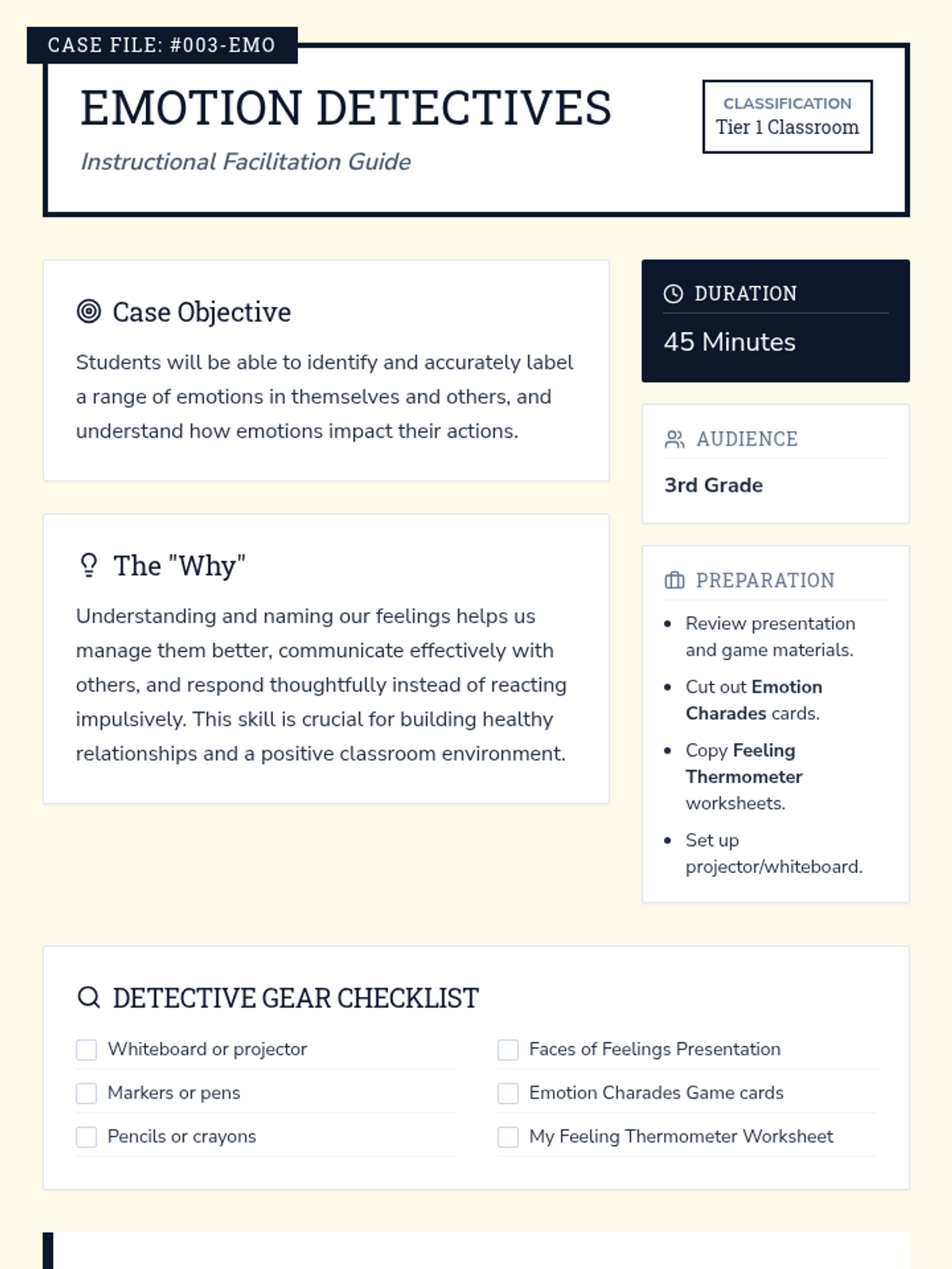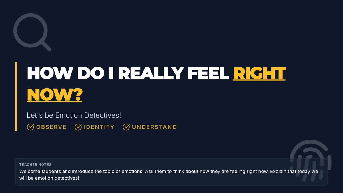 A 45-minute lesson for 3rd graders focused on identifying and labeling emotions. Students act as 'Emotion Detectives' to observe facial expressions, body language, and physical sensations associated with different feelings.