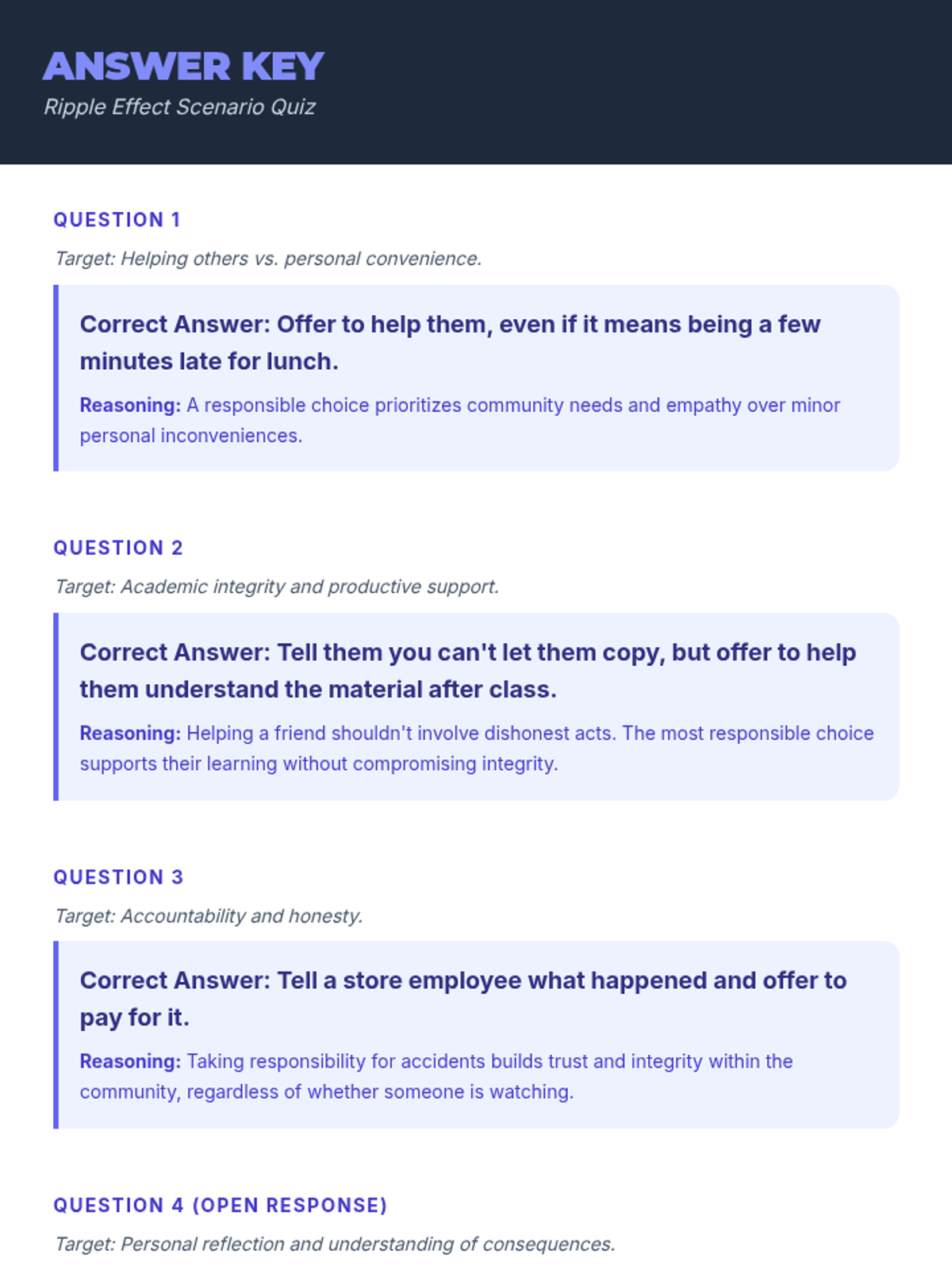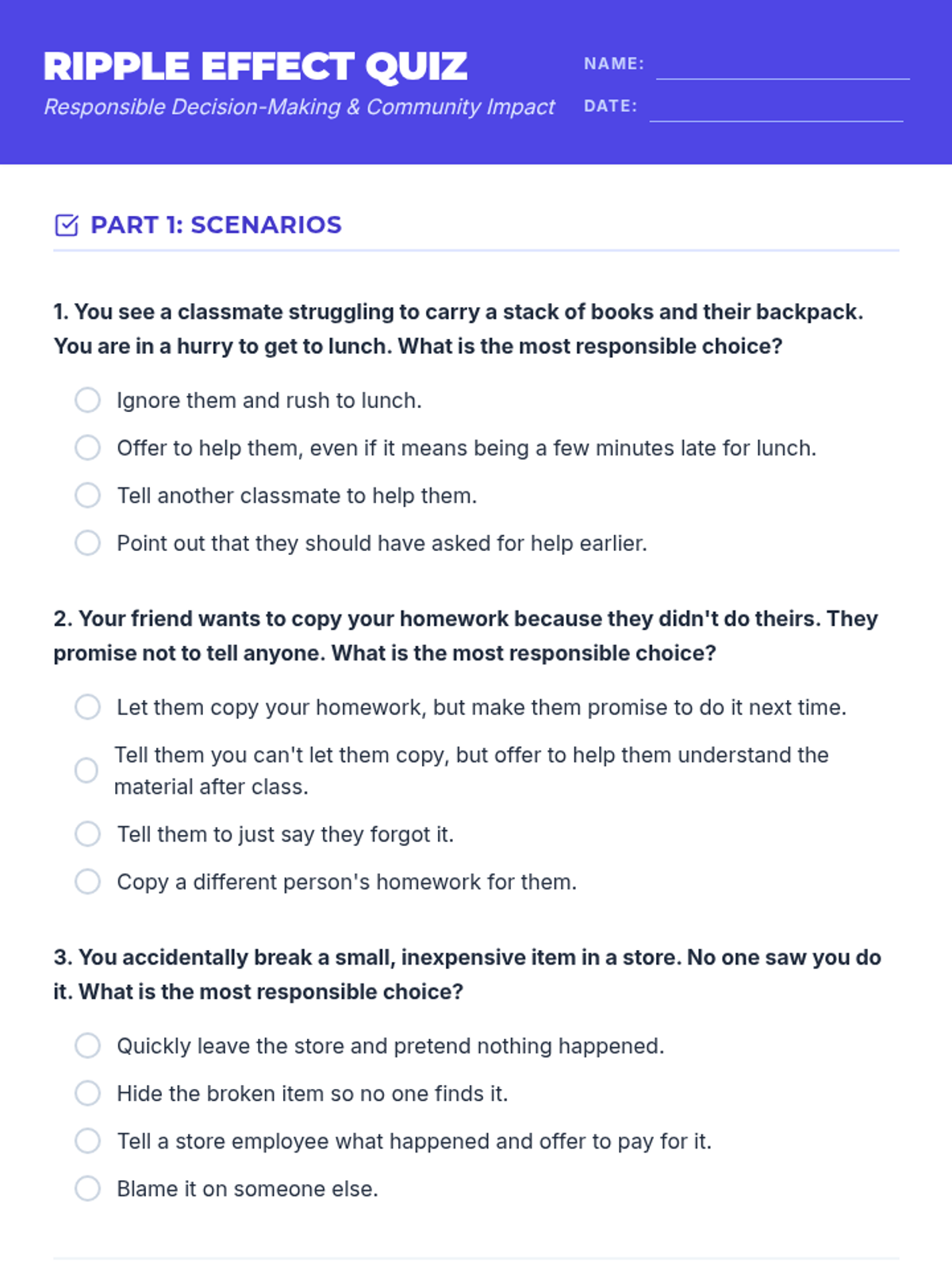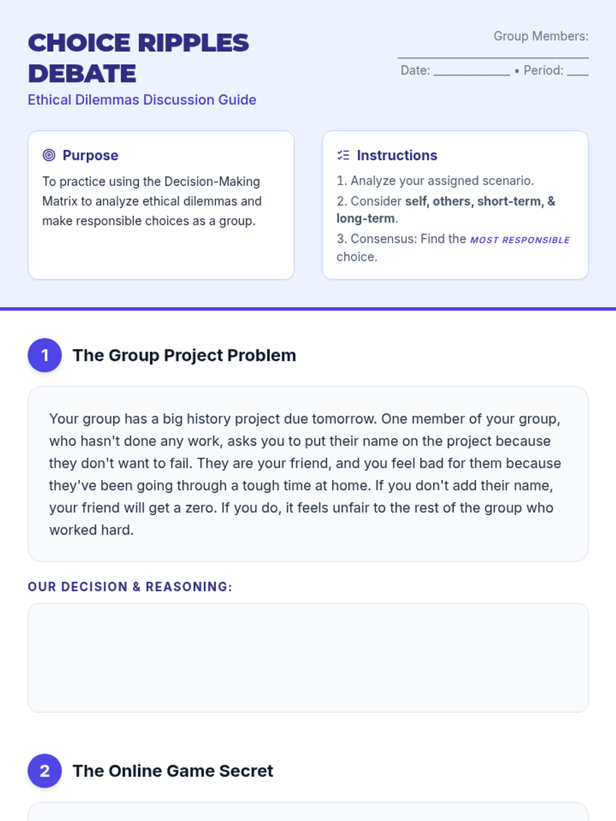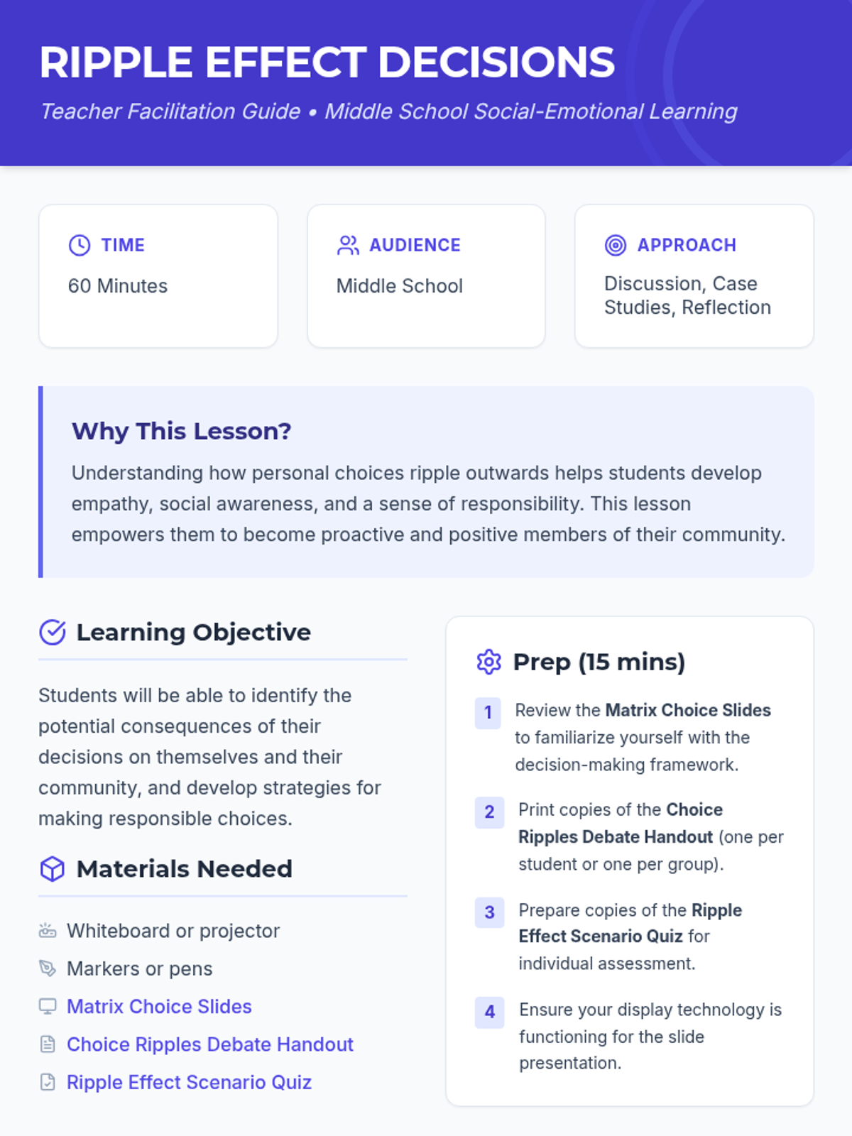 This lesson explores responsible decision-making and the 'ripple effect' of choices on the community, using a decision-making matrix and ethical dilemma debates.