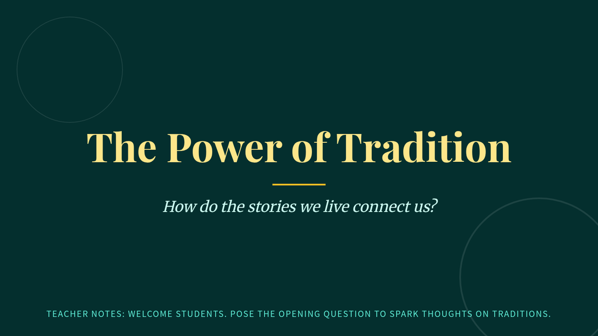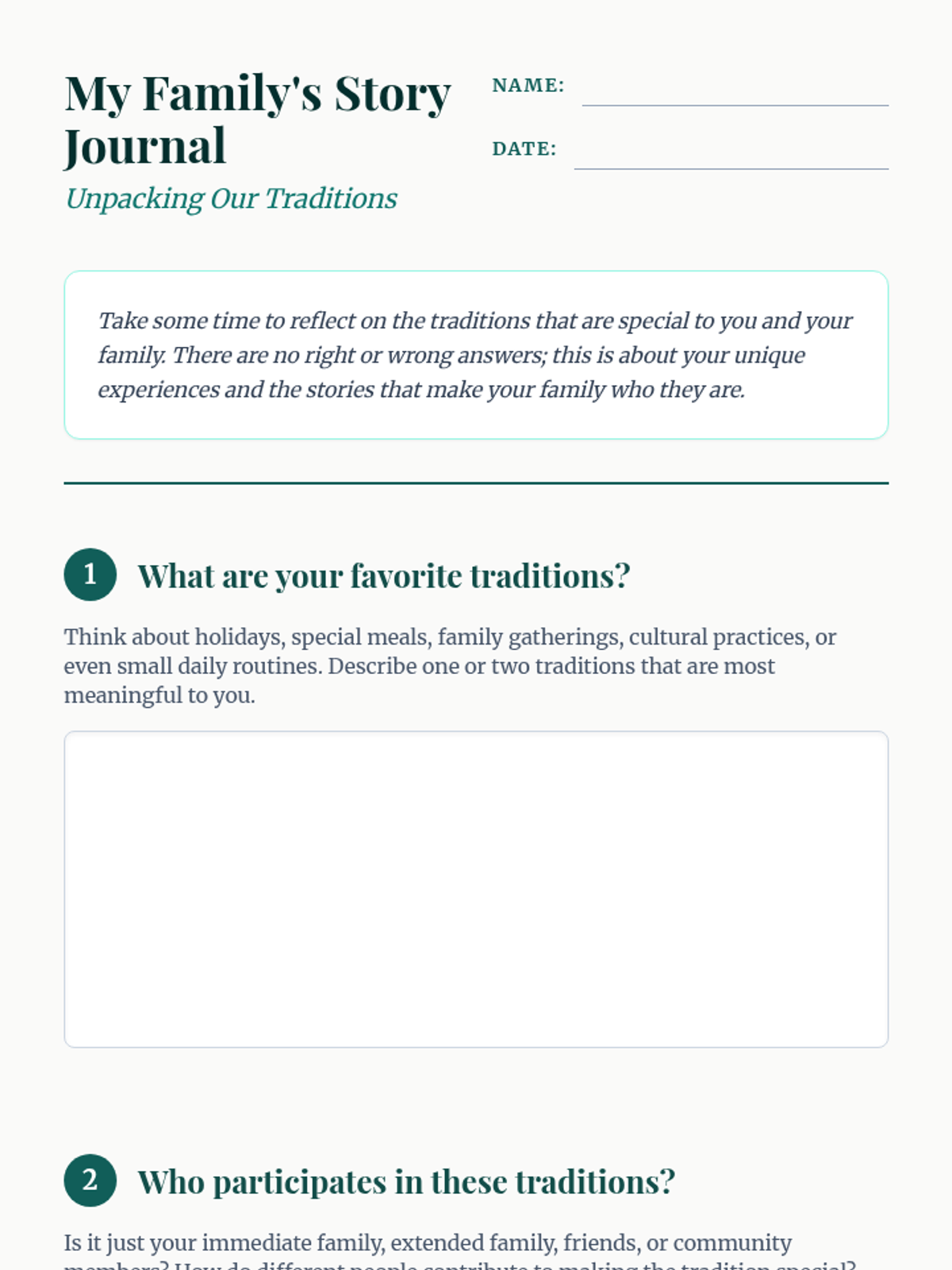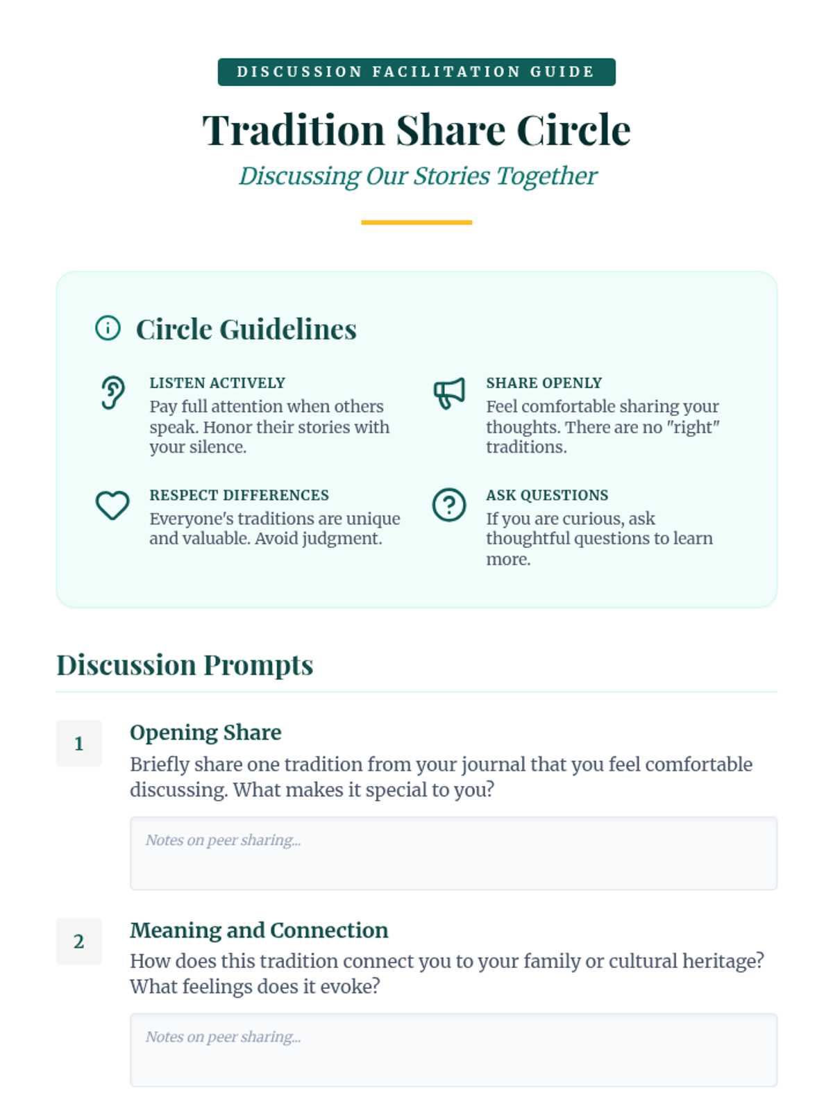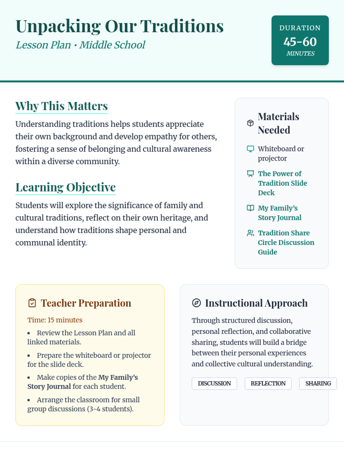 A middle school lesson exploring family and cultural traditions, heritage, and identity through reflection and peer discussion.