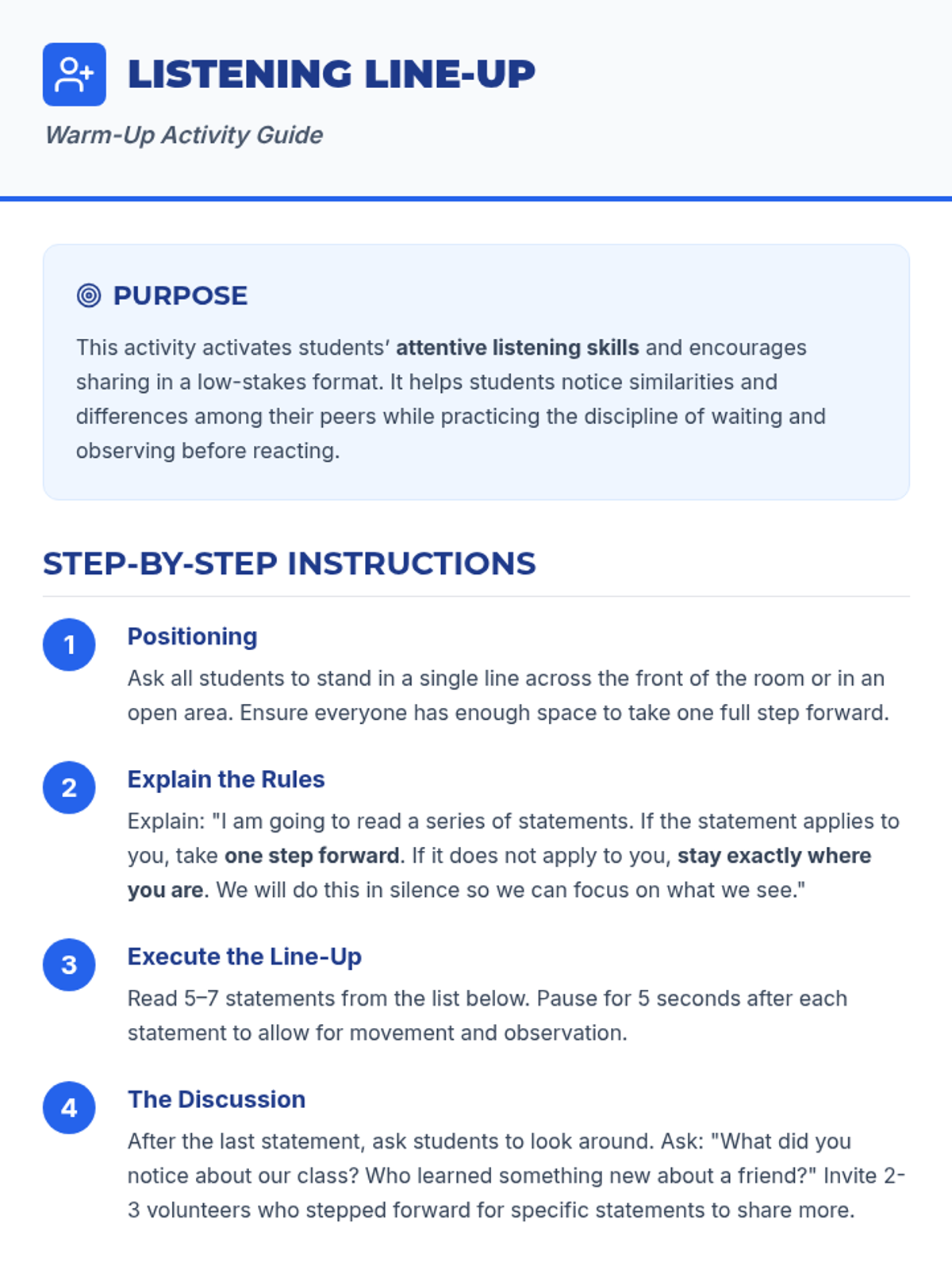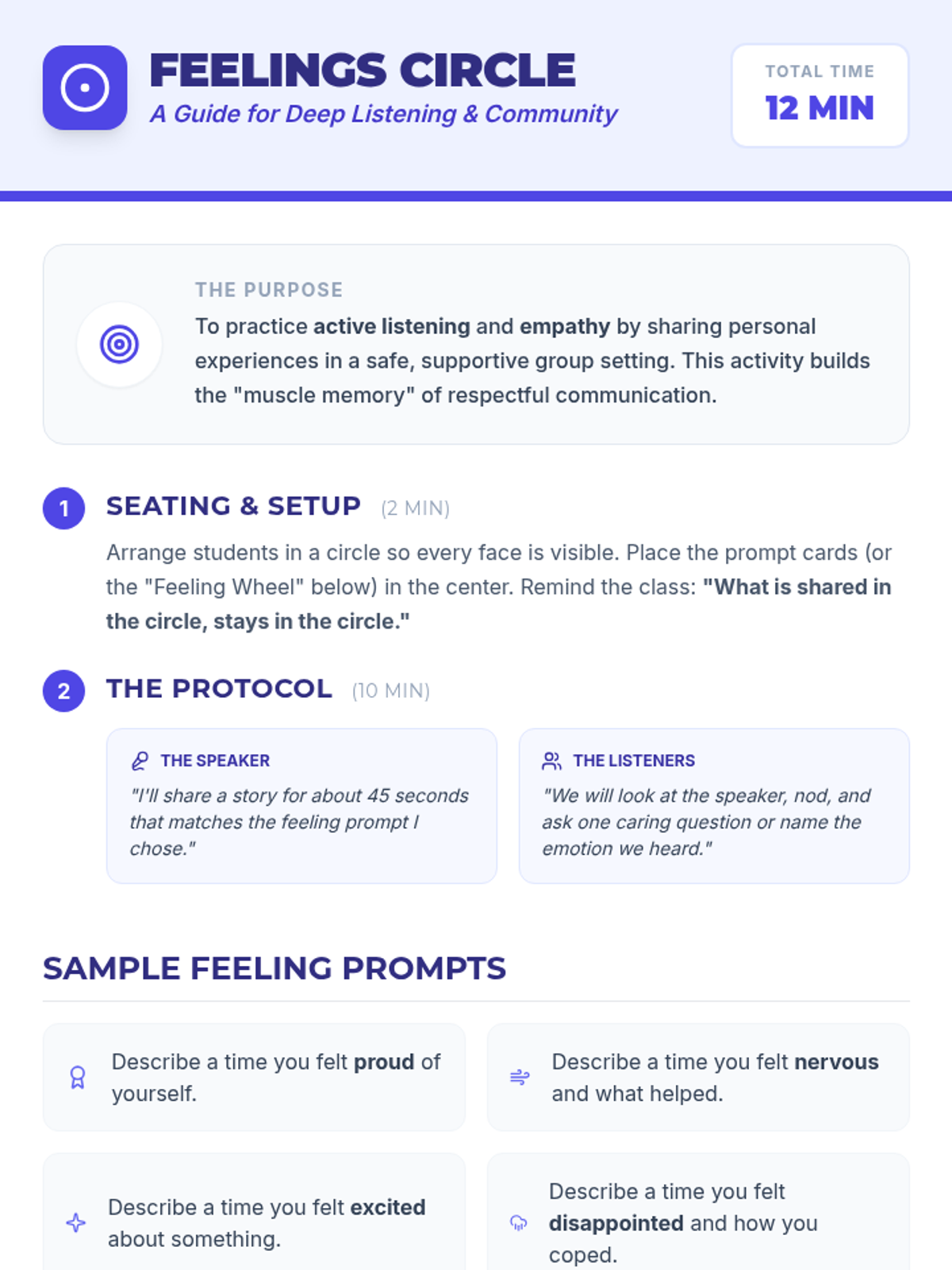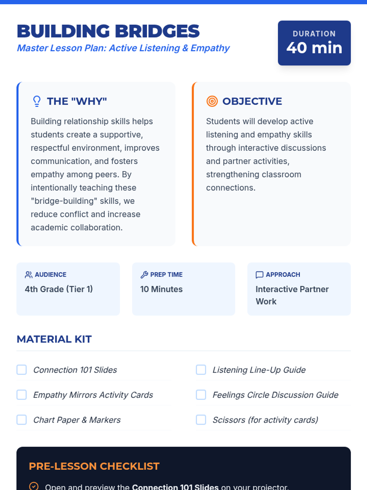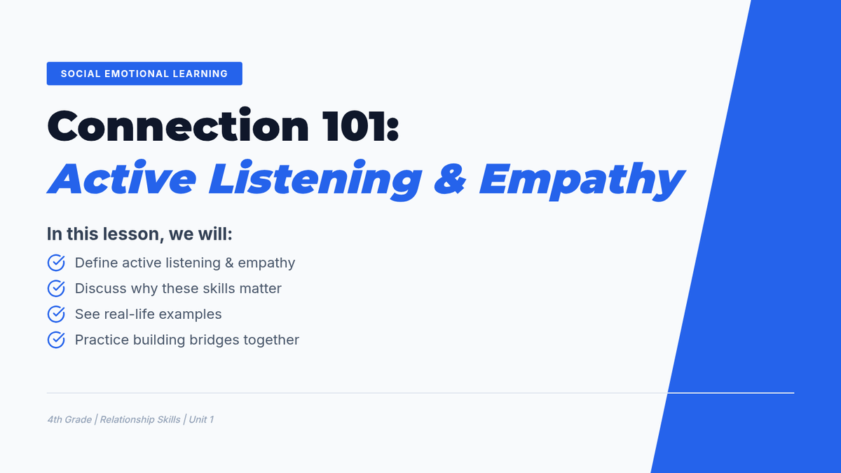 A collaborative 4th-grade lesson that introduces students to active listening and empathy through interactive activities and guided discussions to build a supportive classroom community.