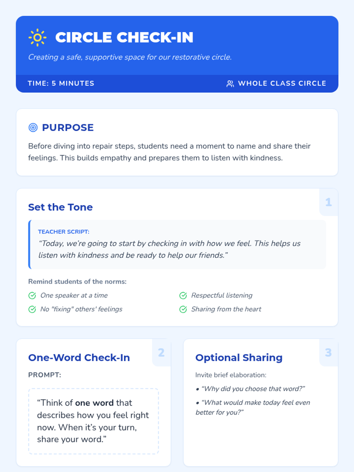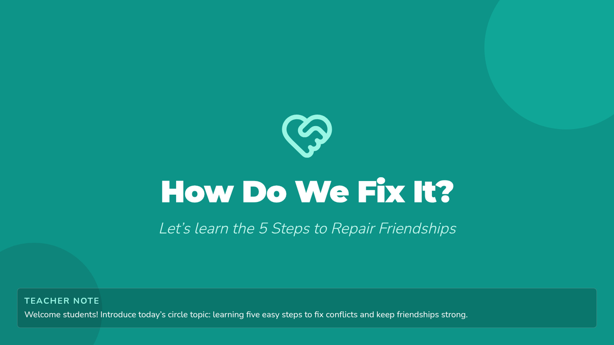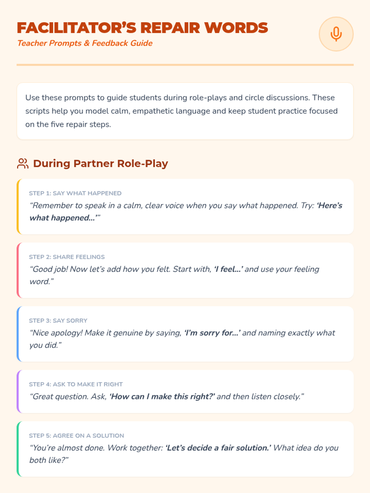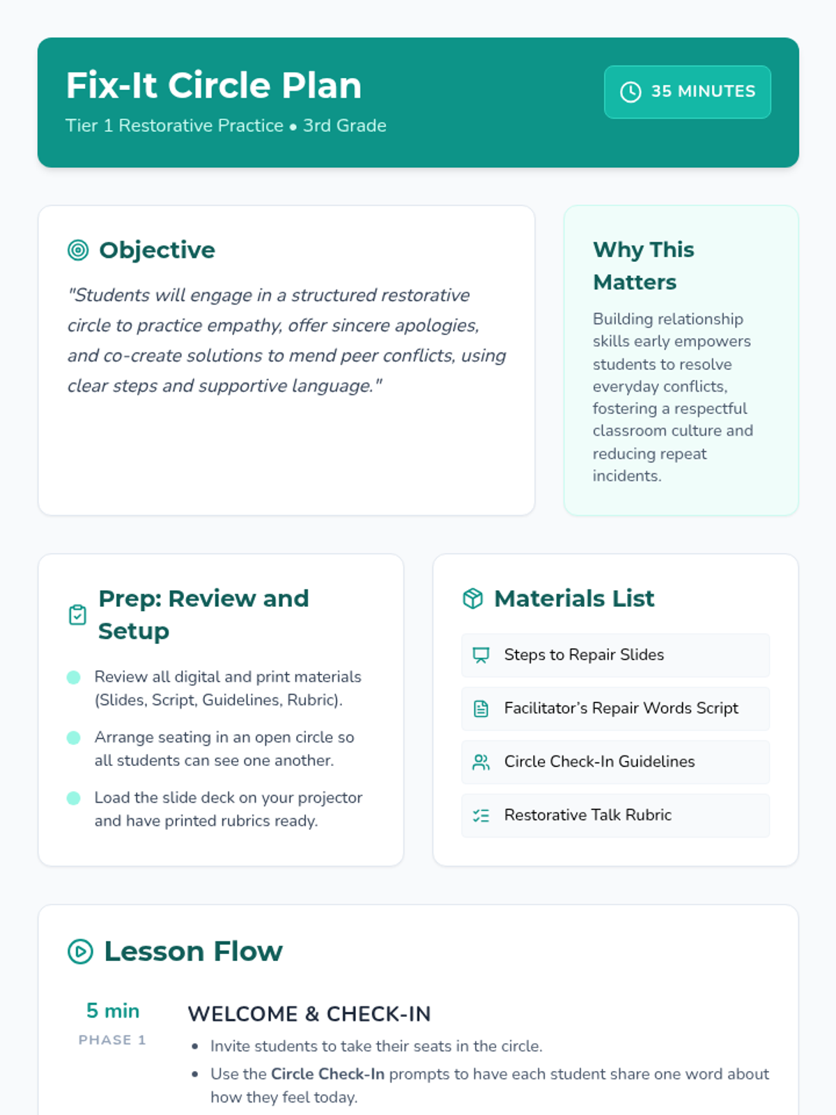 In this Tier 1 restorative circle lesson, 3rd graders will practice empathy, apology, and collaborative problem-solving to mend relationships using structured steps and supportive language.