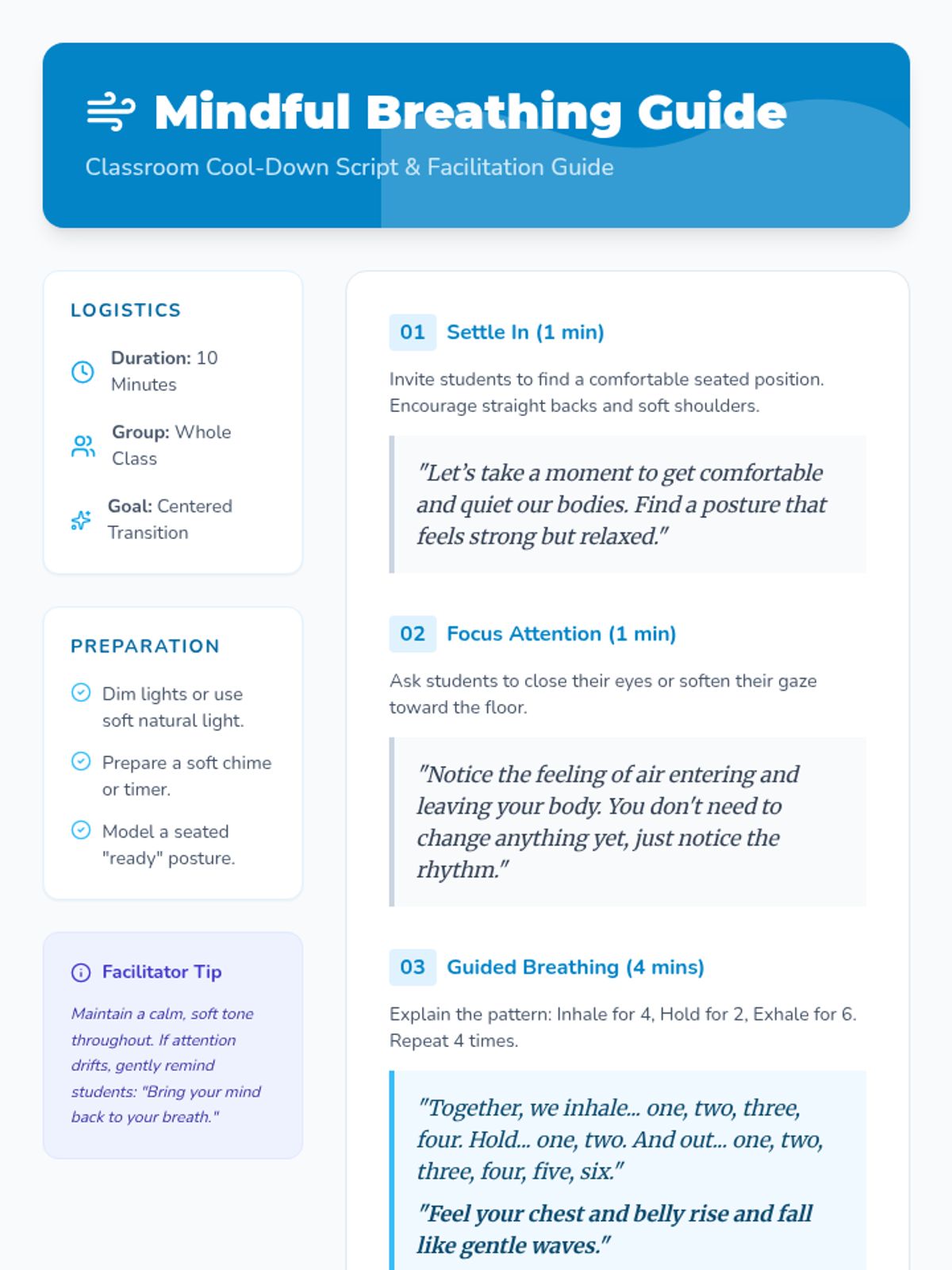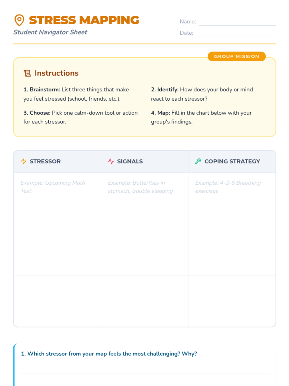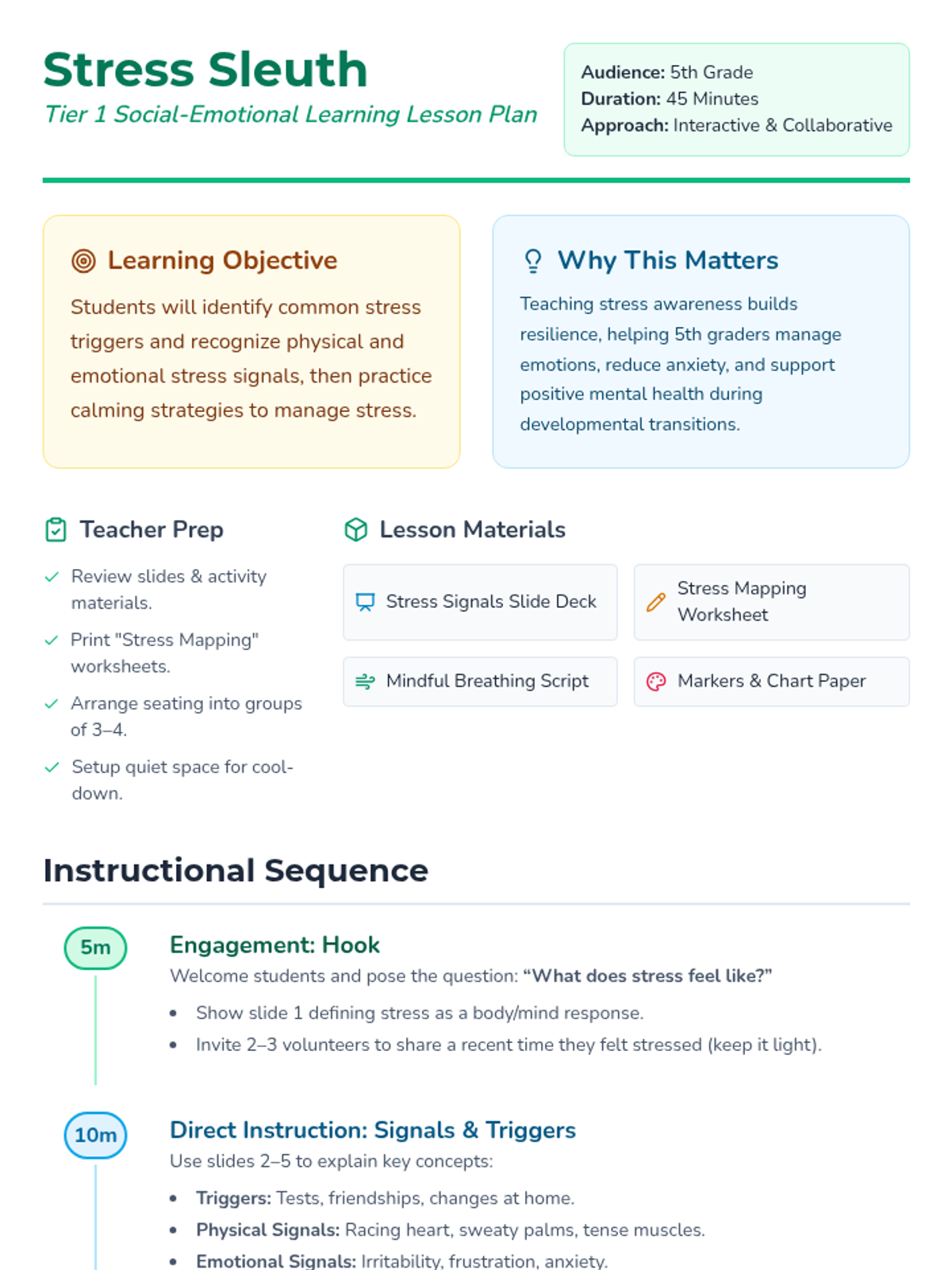 A 45-minute Tier 1 lesson for 5th graders that teaches students how to identify personal stress triggers and signals while practicing effective coping strategies. Students engage in collaborative mapping and guided mindful breathing to build resilience and self-awareness.