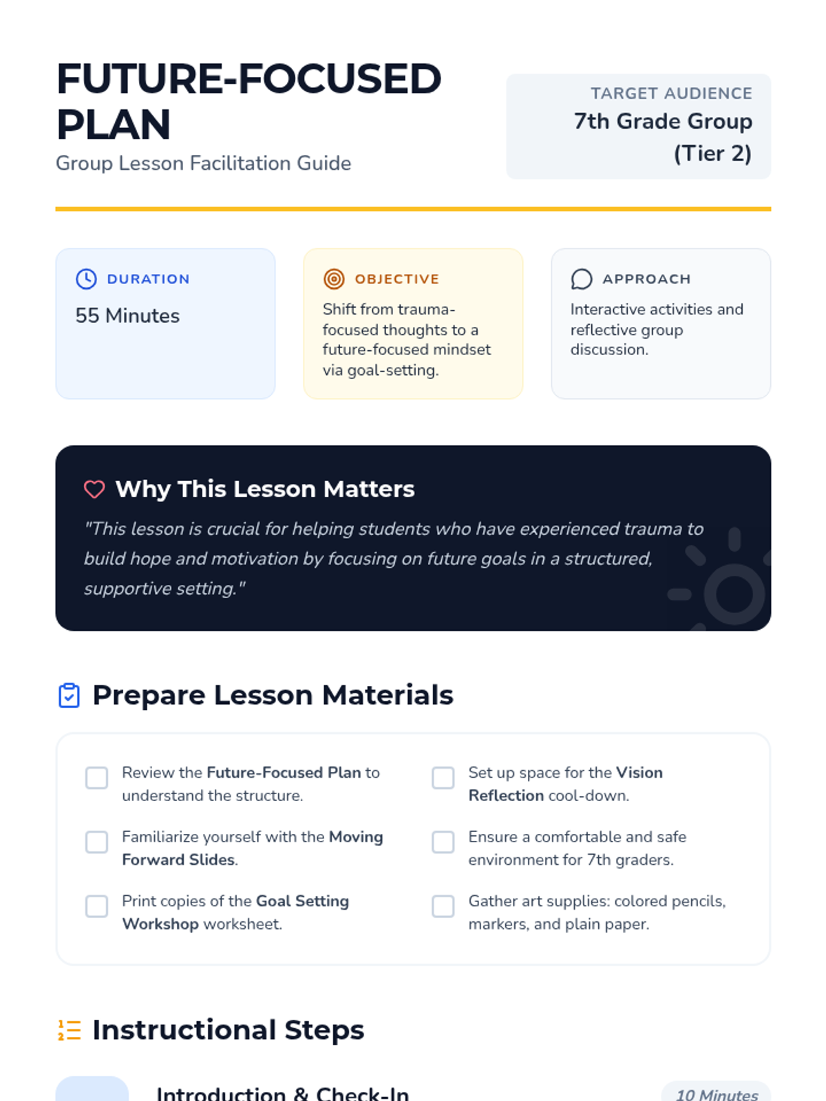 A Tier 2 group lesson for 7th graders focused on overcoming trauma through future-focused goal setting and positive visualization.