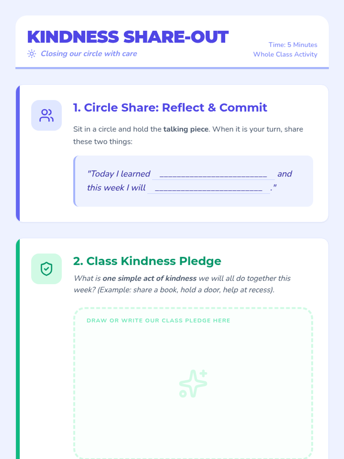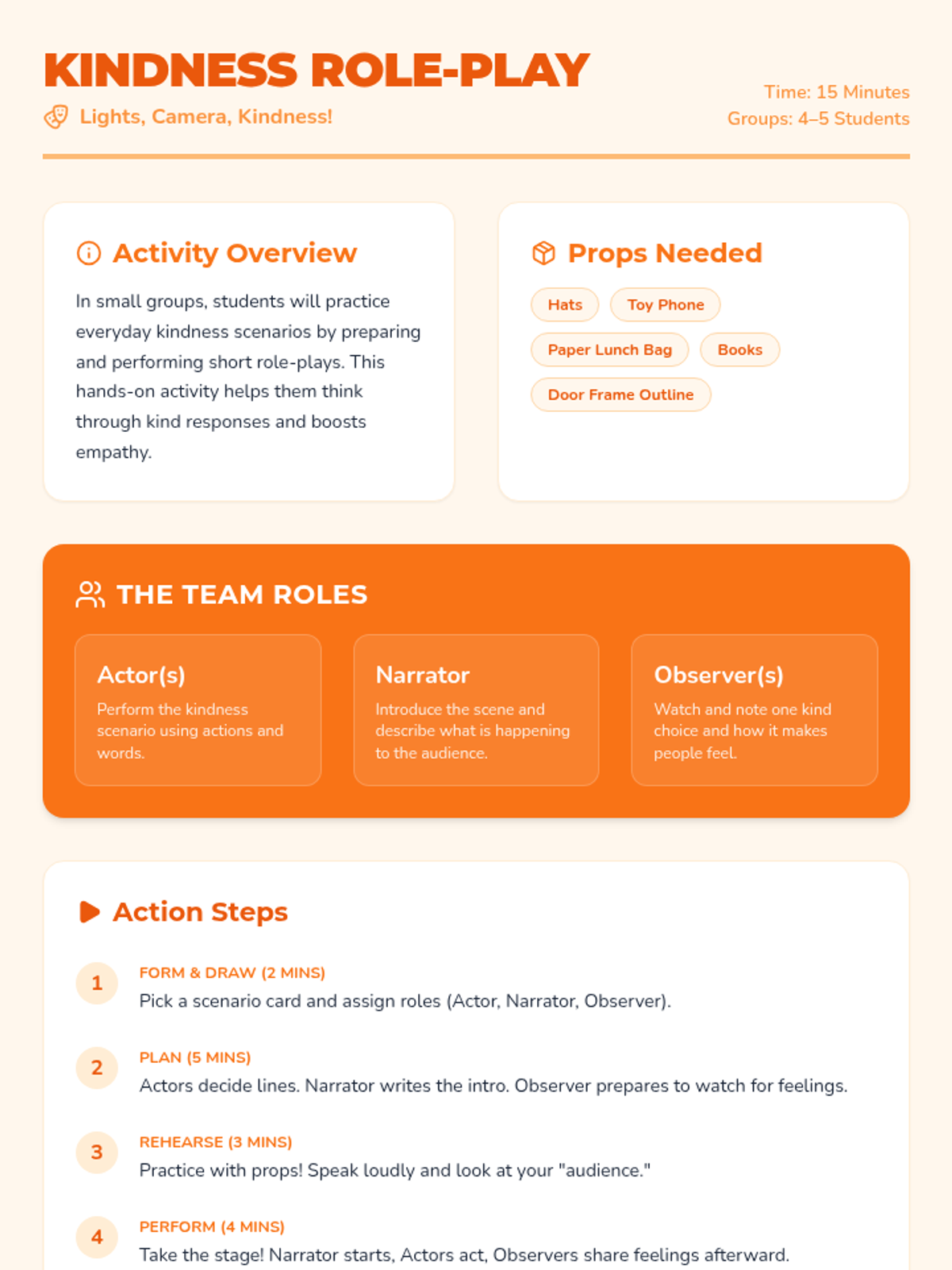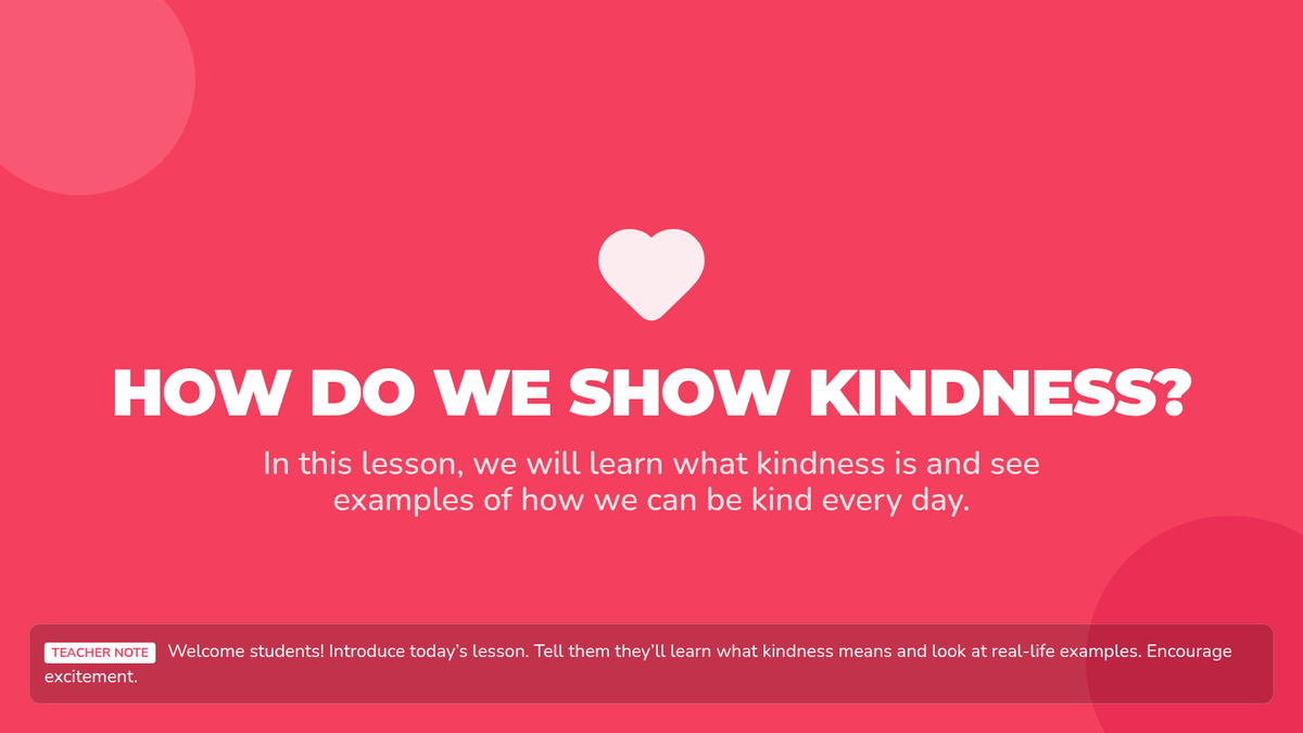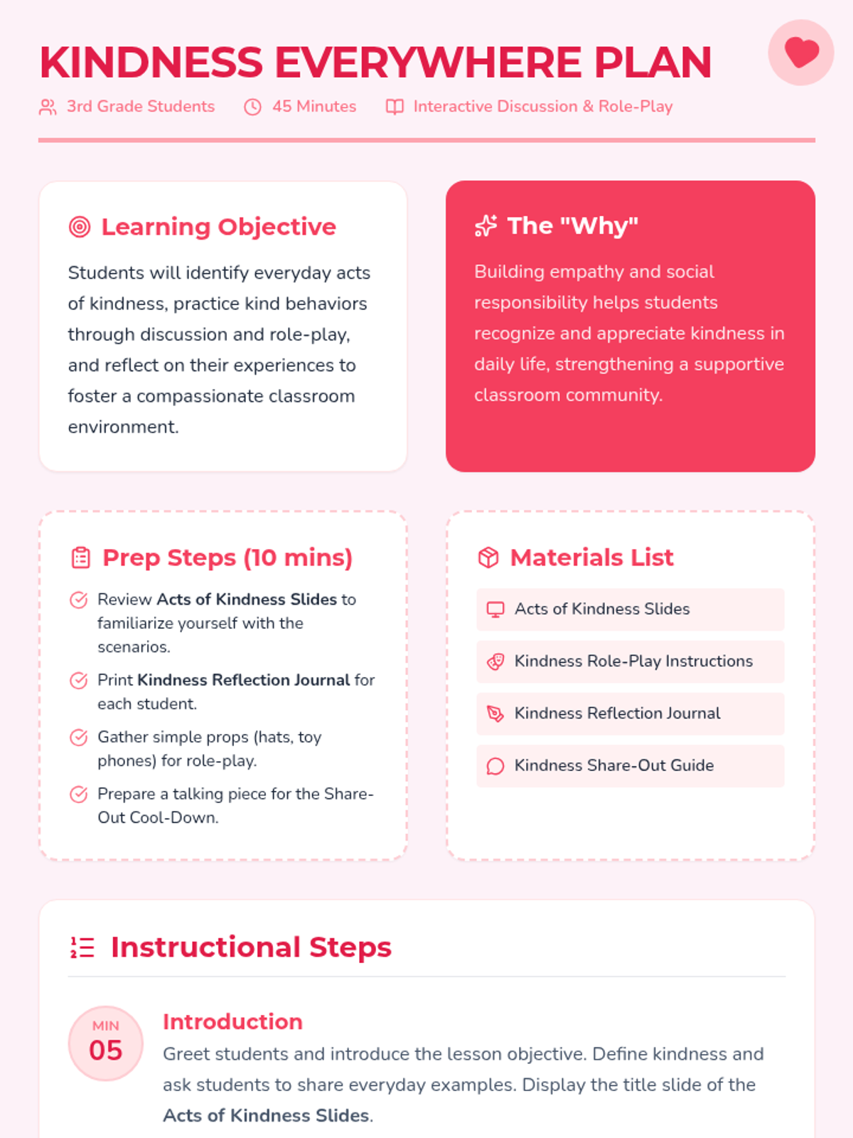 A 45-minute 3rd grade lesson where students explore, practice, and reflect on everyday acts of kindness to build a compassionate classroom community.