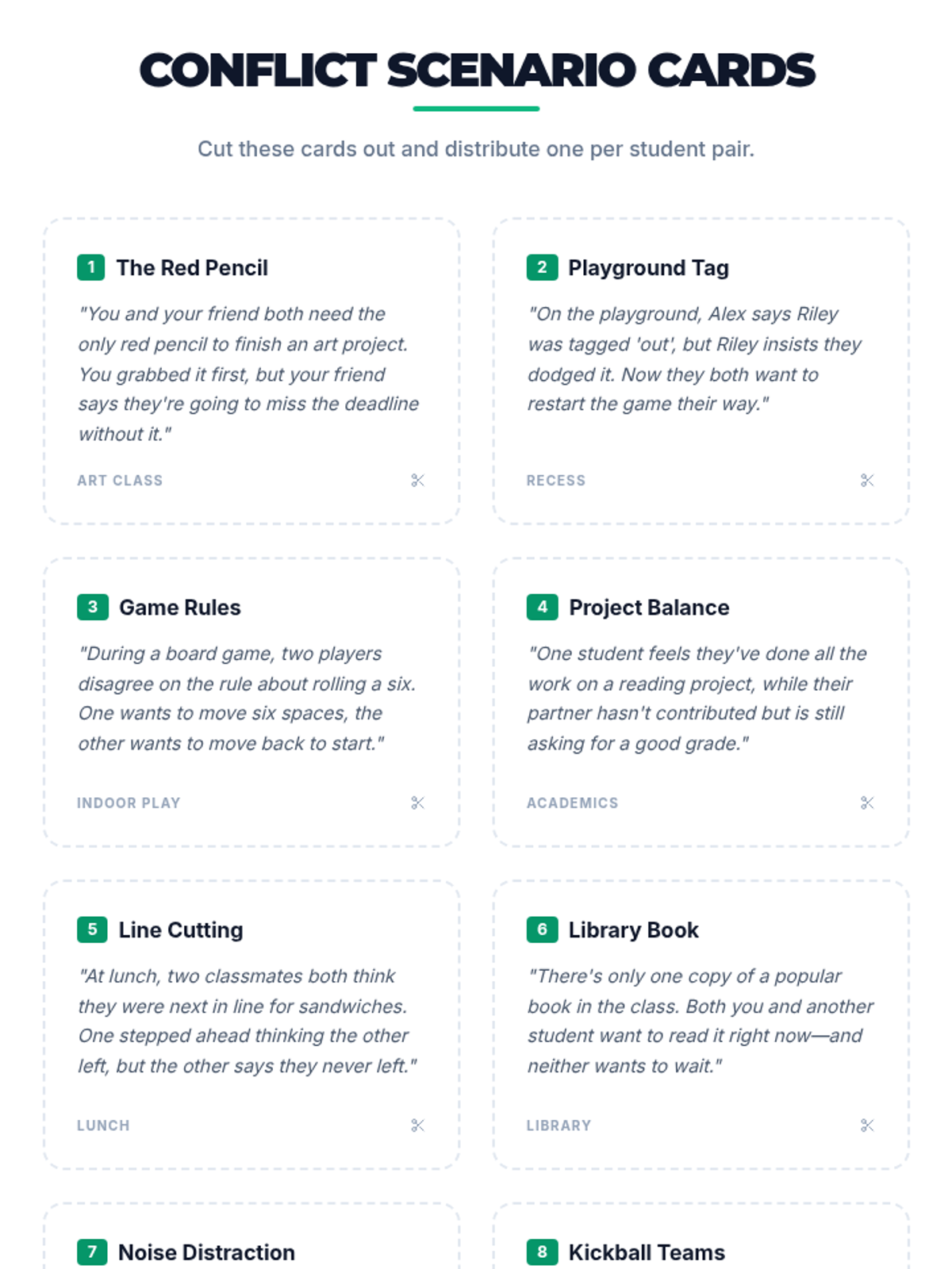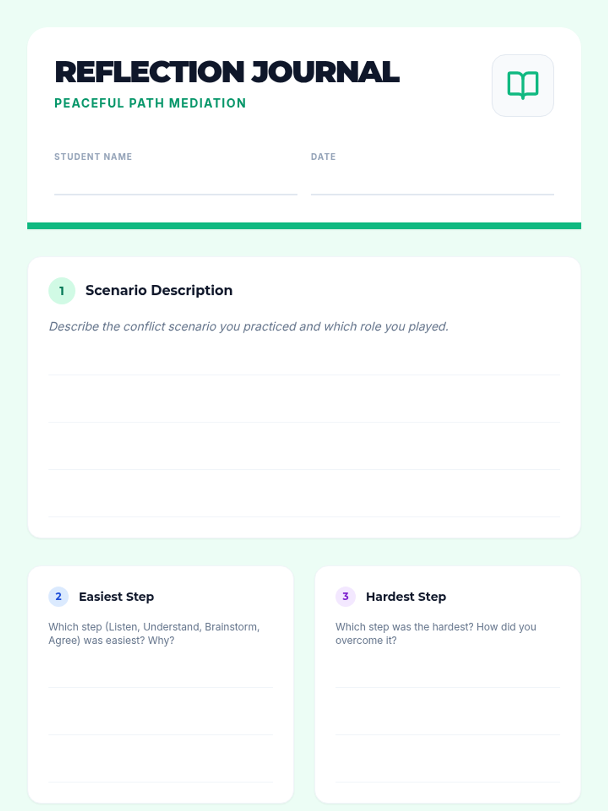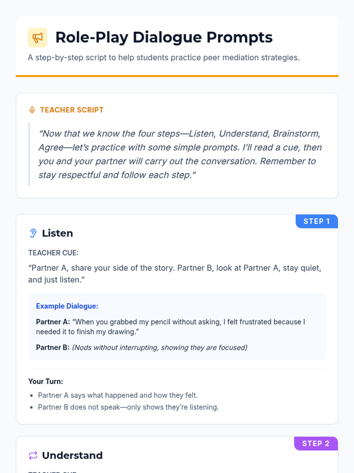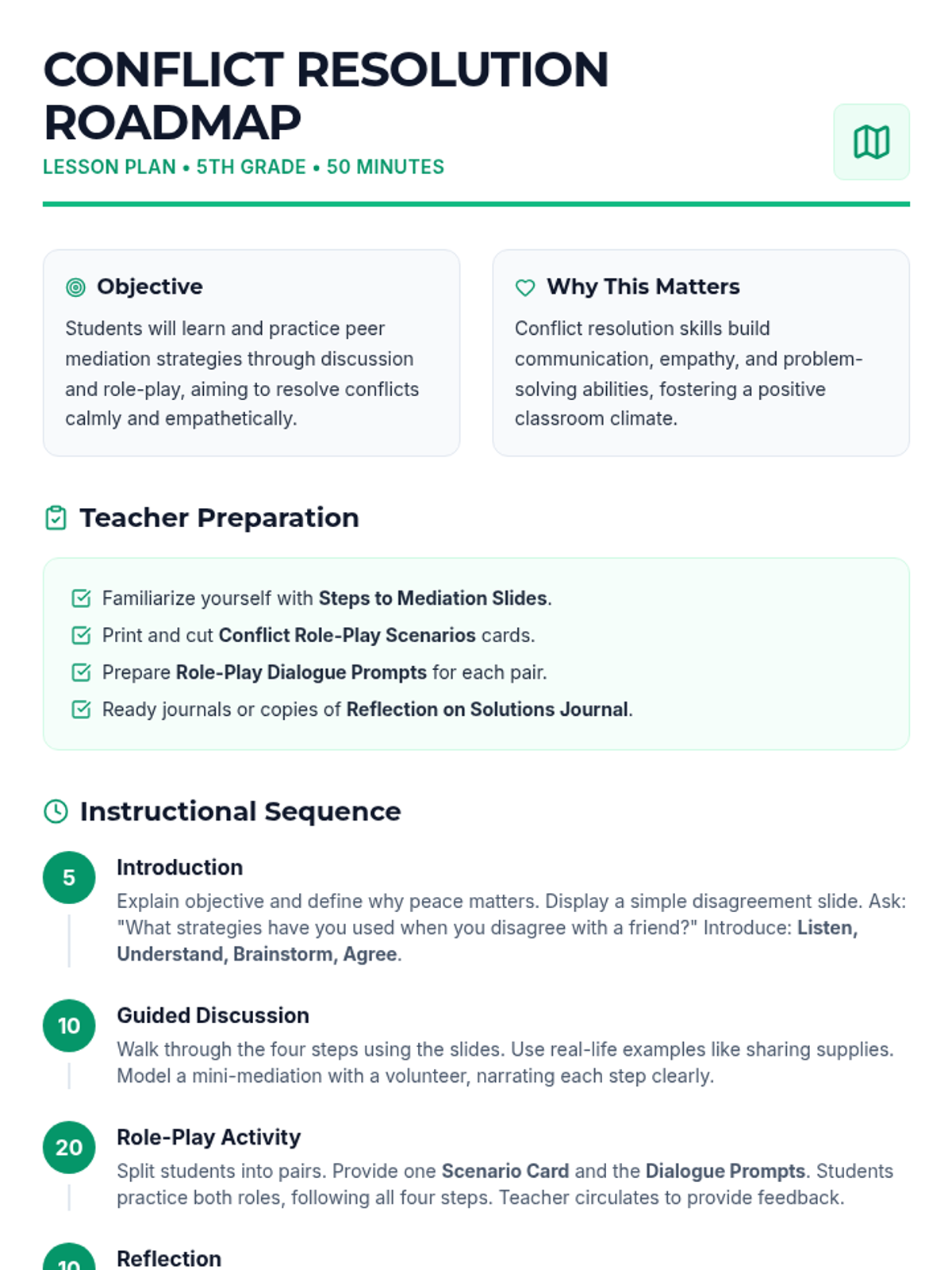 A guided discussion and role-play session teaching peer mediation strategies. Students practice peaceful solutions to everyday disagreements, building their communication and empathy skills.
