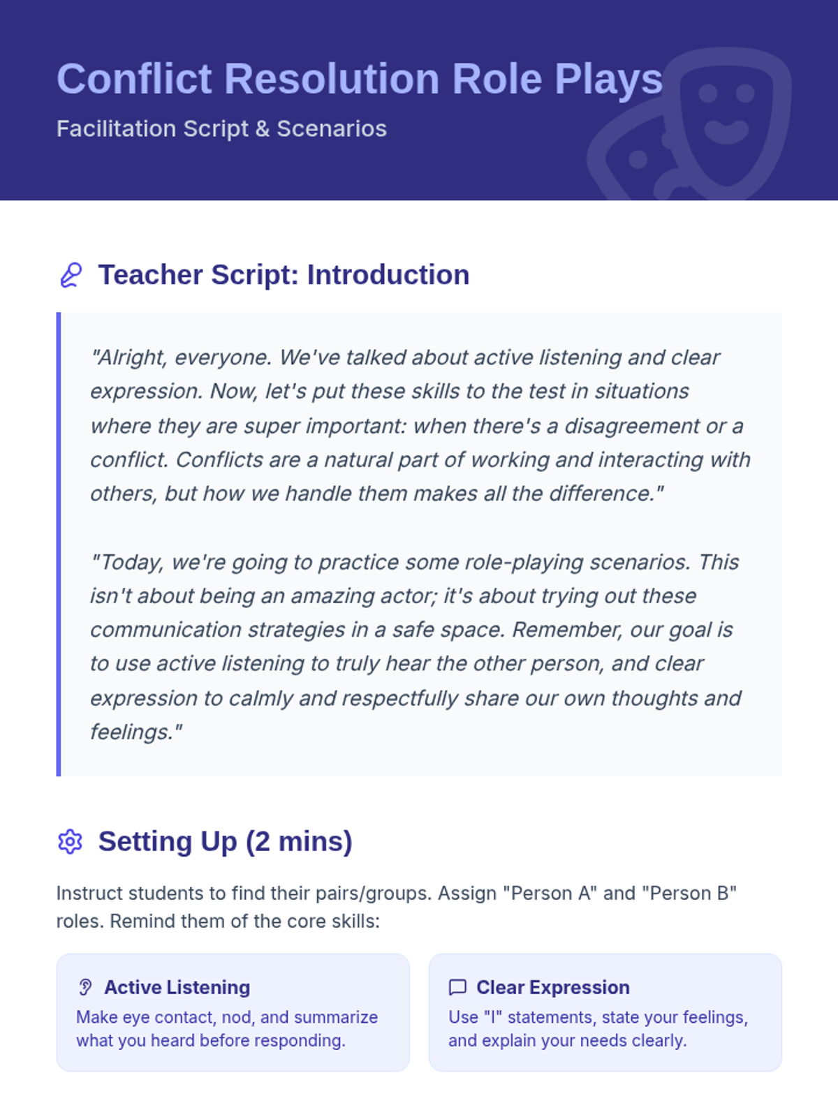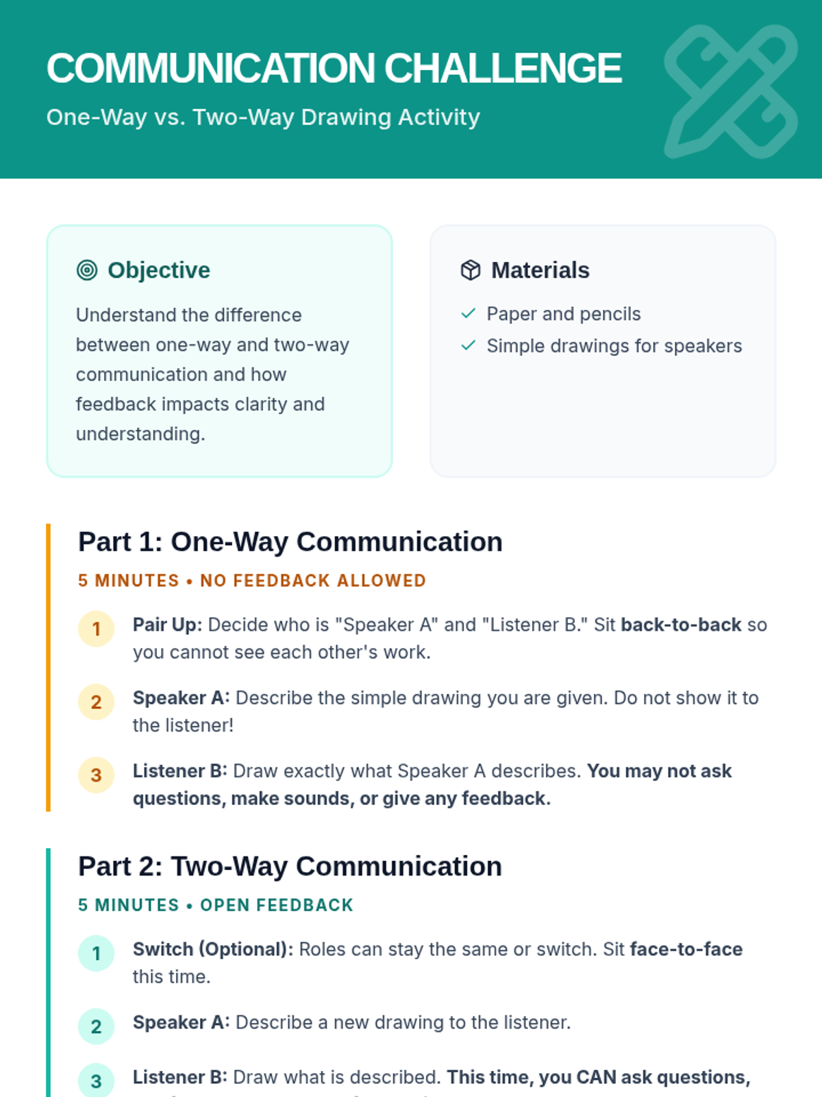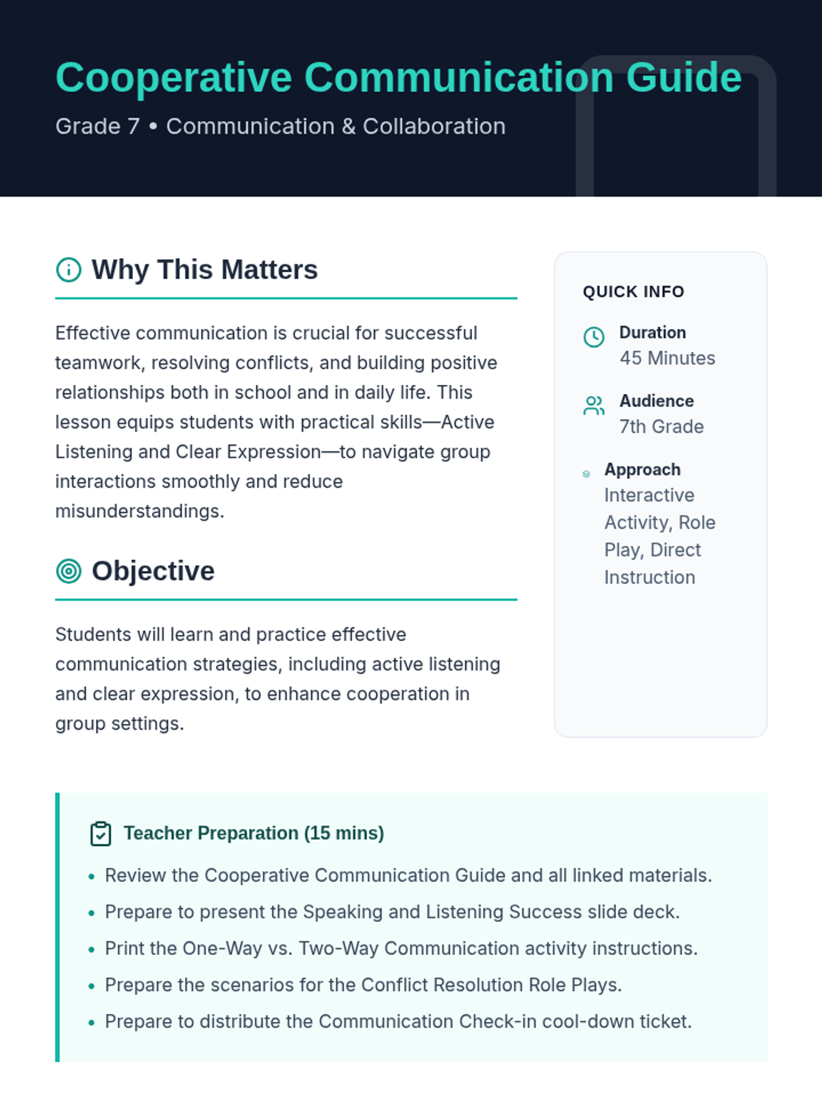 A lesson for 7th graders focusing on active listening and clear expression to enhance group cooperation and resolve conflicts. Students engage in interactive activities like back-to-back drawing and role-playing to practice these essential soft skills.