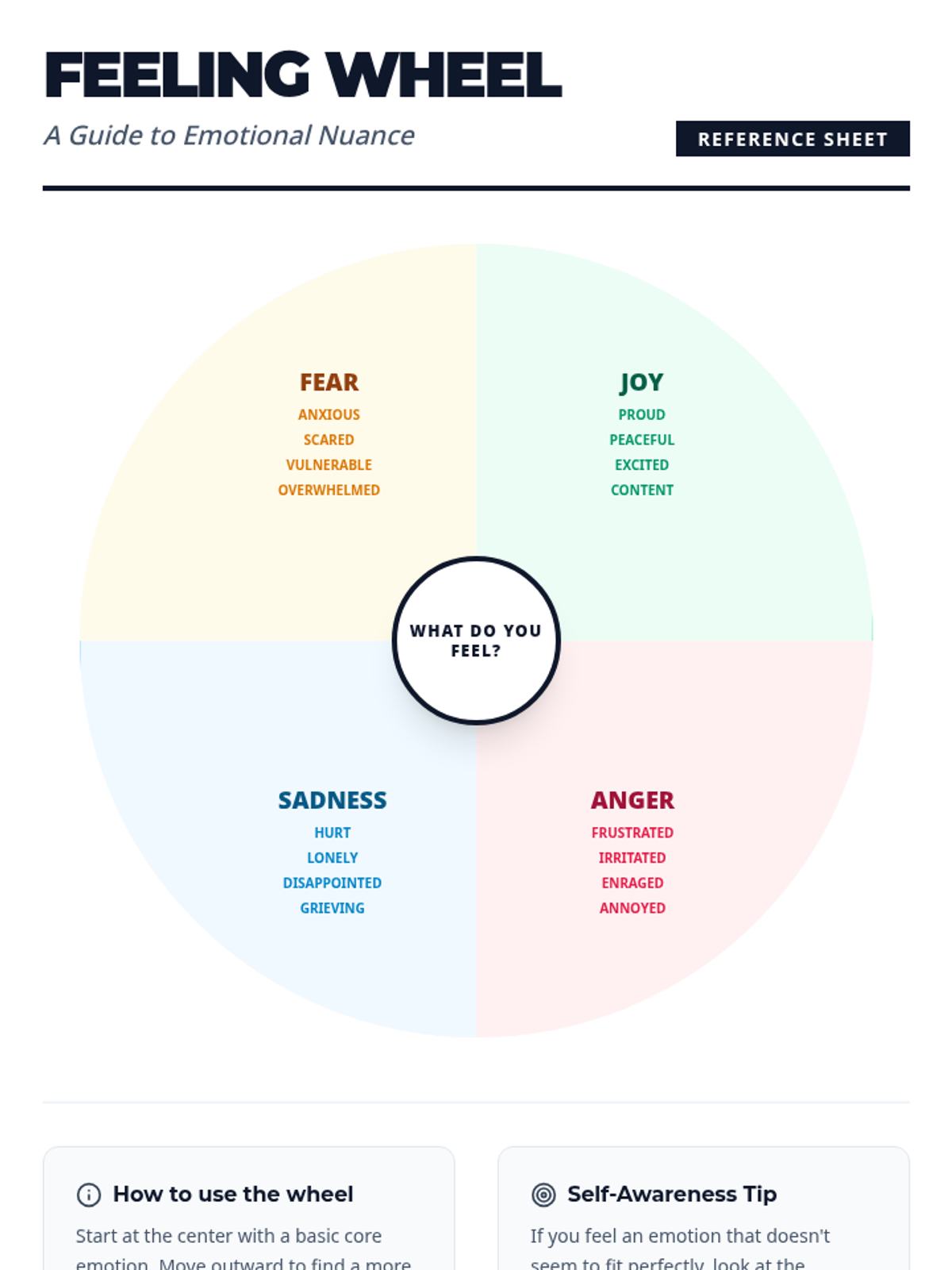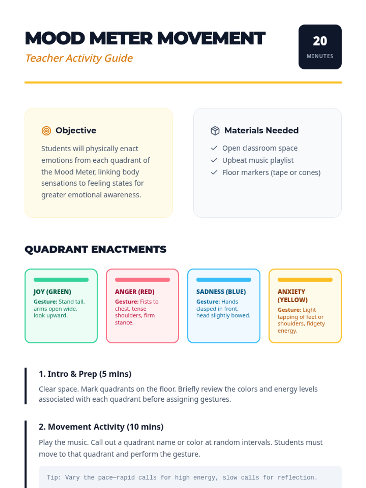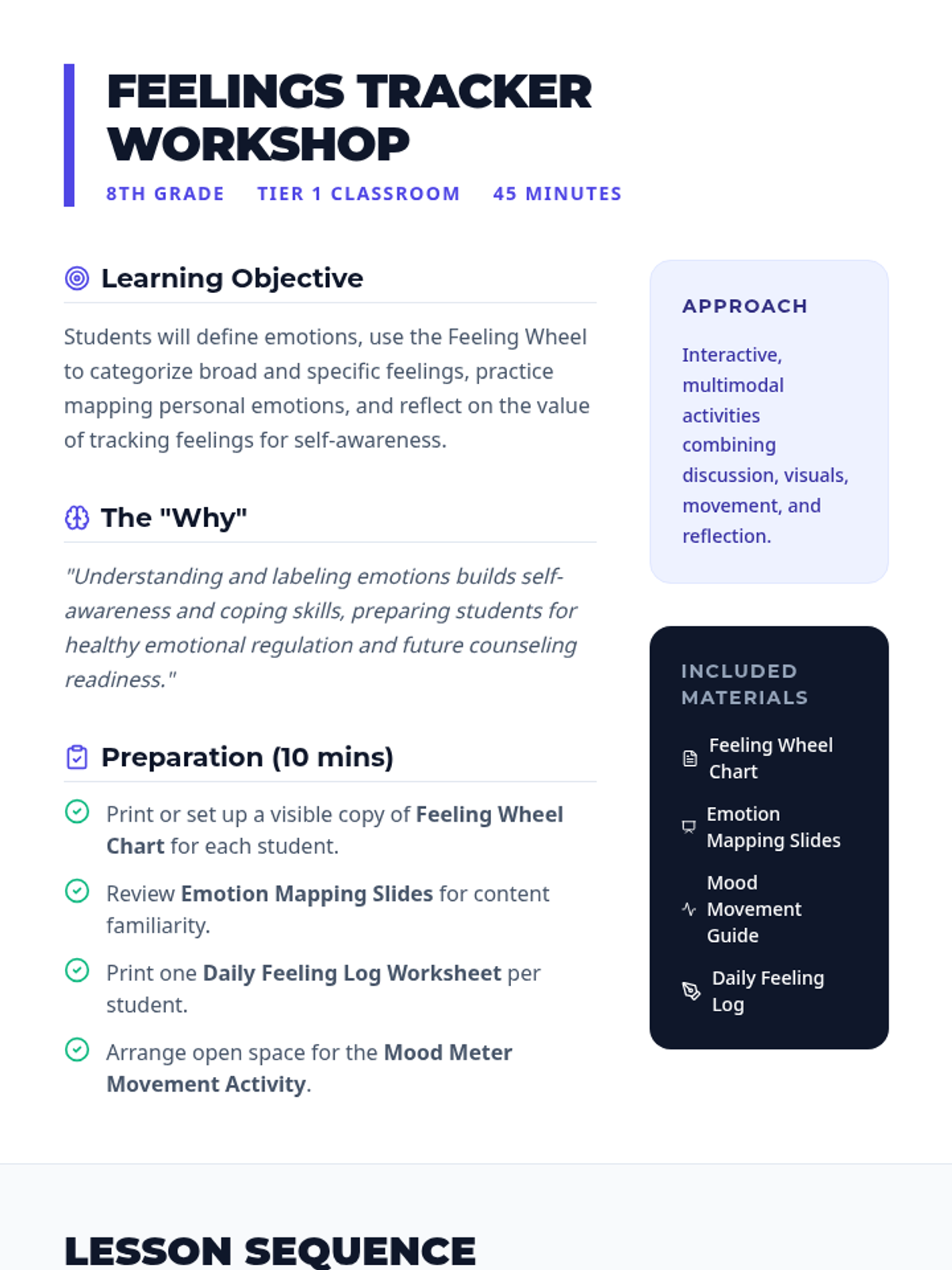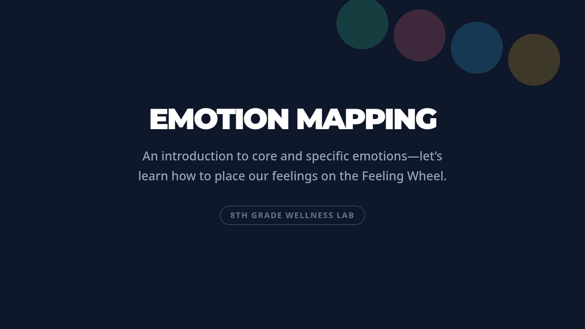 A 45-minute Tier 1 classroom lesson for 8th graders to develop emotional literacy, helping them identify, categorize, and track feelings using a Feeling Wheel and Mood Meter.